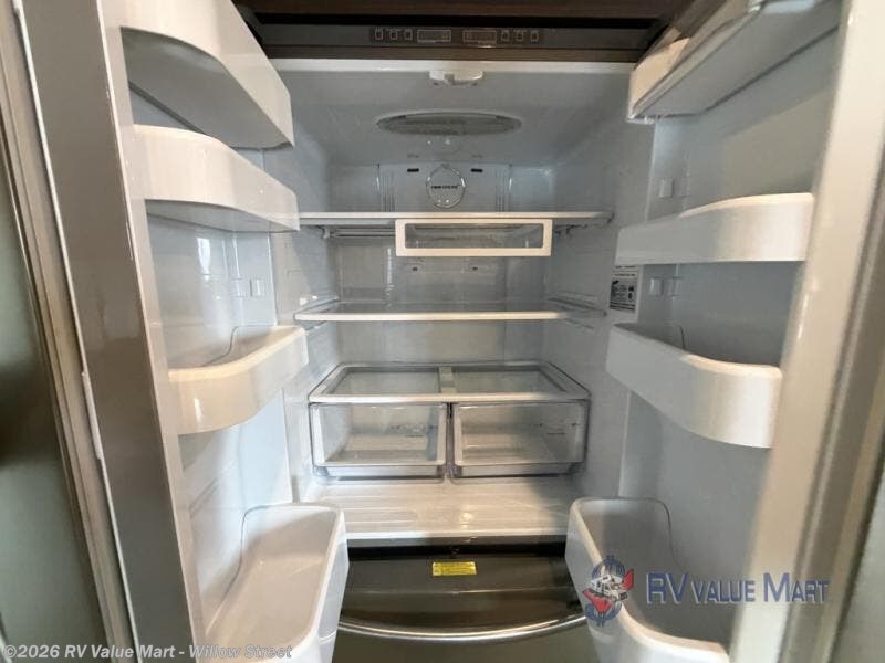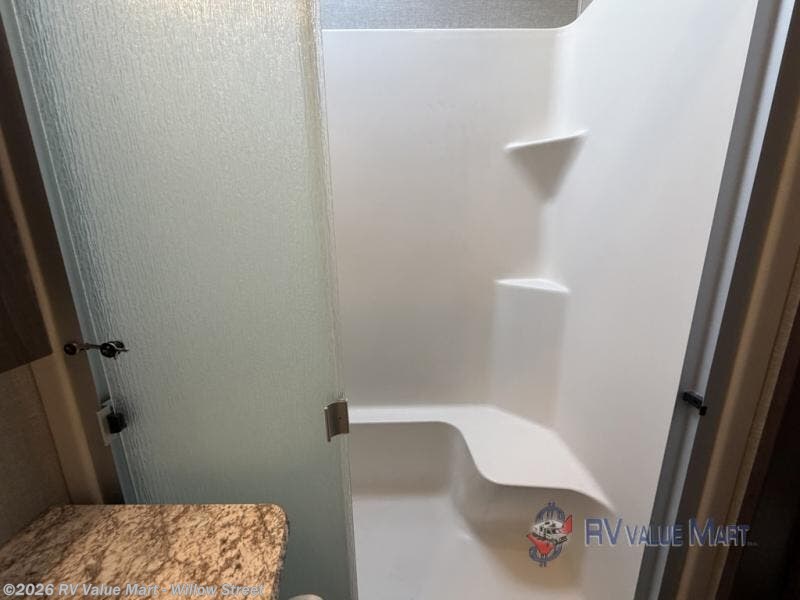 Head toward the rear to find a side aisle bath on your left. The bath includes a 48" x 30" shower with seat, toilet, and vanity with sink, plus overhead cabinet. Almost straight across from the bath entry is a second outside entry door. Here you will have quick access to the restroom as well as to the outside.