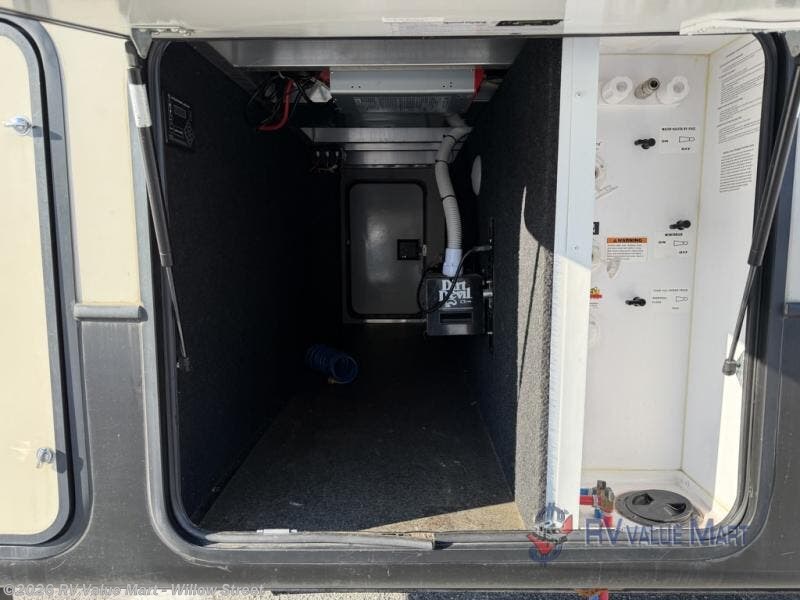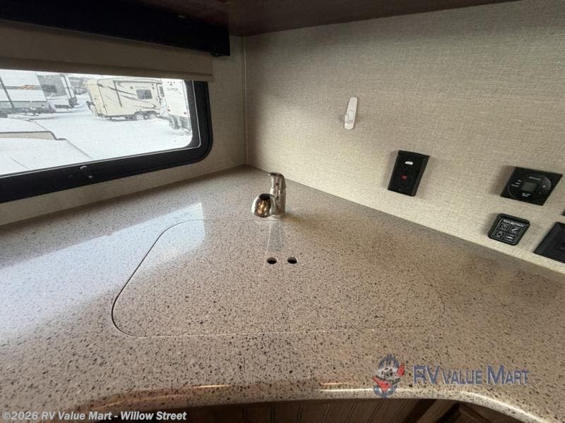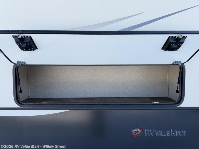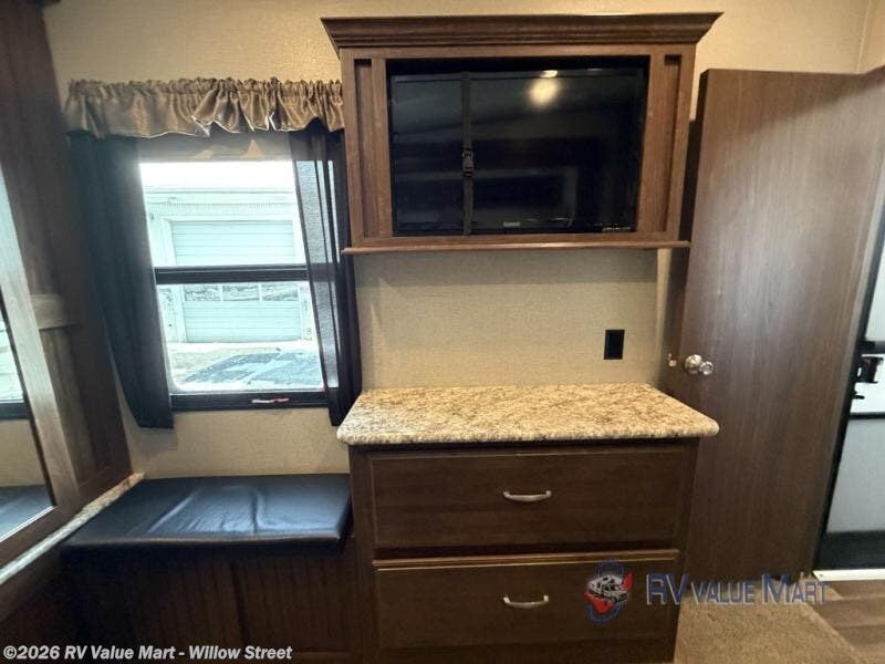 The rear of the fifth wheel features a spacious master bedroom with queen or optional king bed slide. There is storage beneath the bed, in the large rear wardrobe, and in the dresser opposite the bed. You will also find a seating area along the road side between the dresser and the full rear wardrobe. Above the dresser find a 32" HDTV to enjoy once you retire for the evening. You may even choose to add a washer/dryer option to the prepped closet as an added convenience.