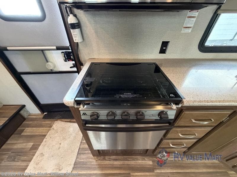 Back down to the main level you will find the kitchen and dining area. You can make your favorite meals with the three burner range, residential microwave, and double kitchen sink along the curb side wall. There is a hutch and overhead storage for your dishes and things. A road side slide out includes a free standing dinette and residential refrigerator.