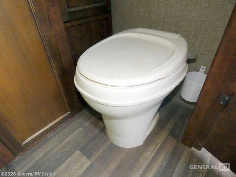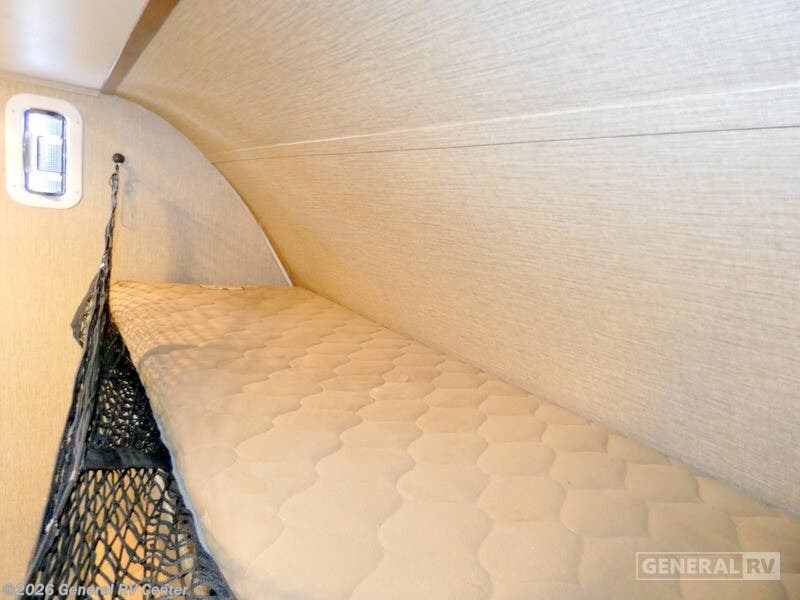 As you enter this model, to your right there is a private front garage with a set of flip down bunk beds, a wardrobe, and TV shelf. The 56" side ramp door allows for easy access to load and unload your toys and gear.