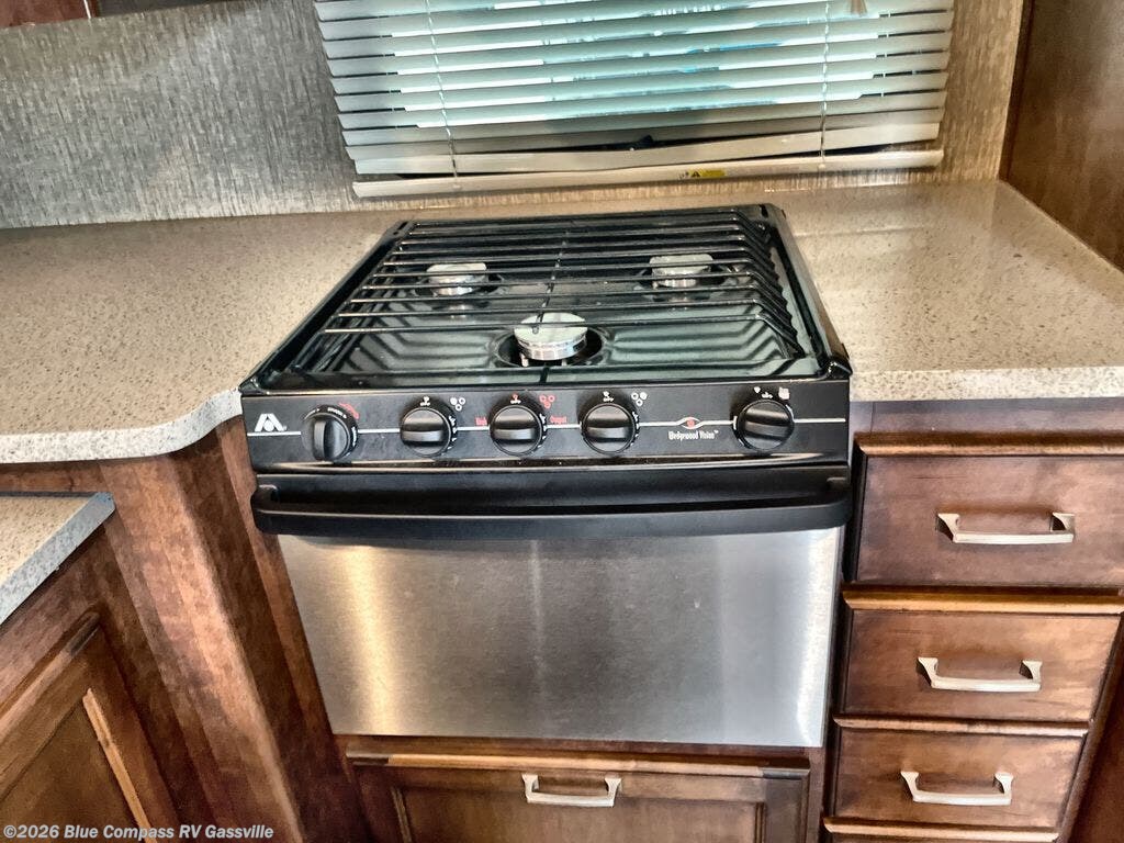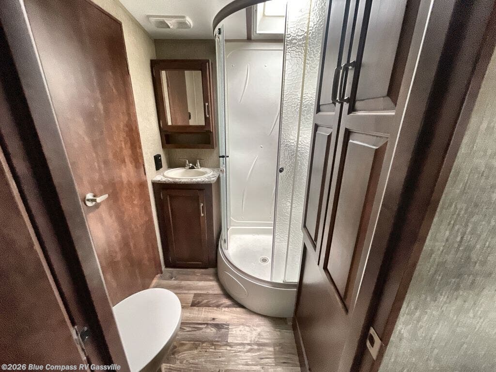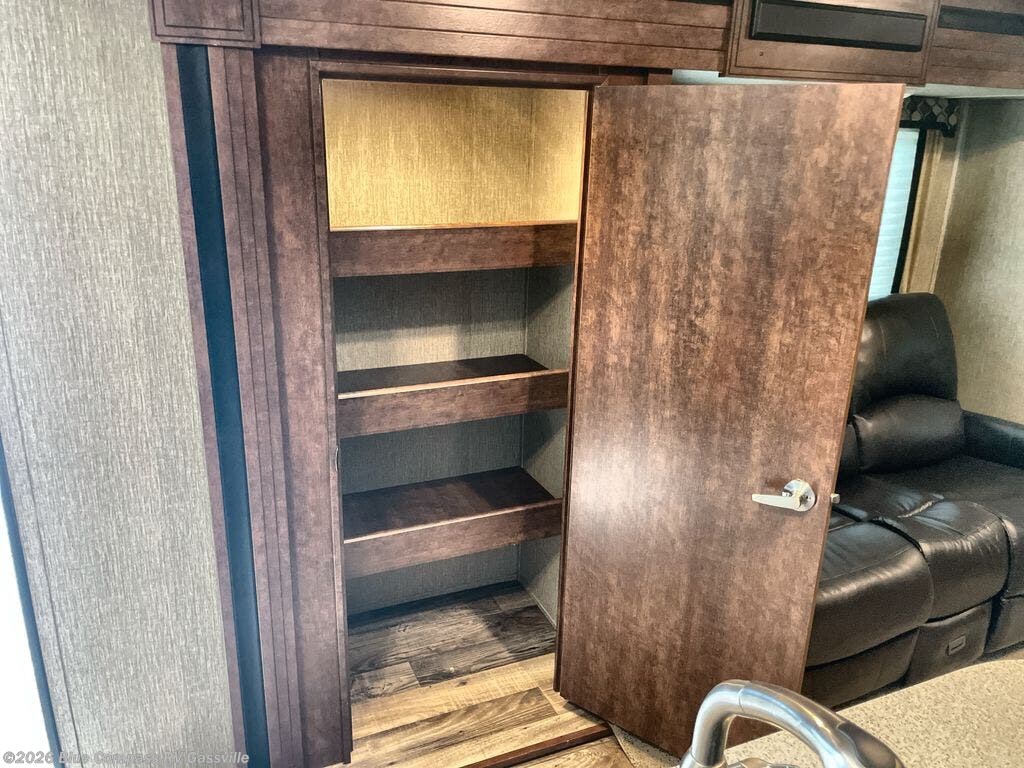As you enter through the main door, you will find yourself in the kitchen area. Along the front of the trailer there is a u-dinette where you can enjoy your meals, and at night use this area for additional sleeping space. The PanaView window provides a perfect view to all your surroundings. The slide out along the door side features a large pantry and theater seating. On the opposite side of the trailer the slide out includes a refrigerator, three burner range, overhead cabinets, and a sleeper sofa. There is also a L-shaped counter with a large sink. Adjacent to the sofa sleeper, along the interior wall there is an entertainment center for your enjoyment. Here you can watch movies or your favorite shows.