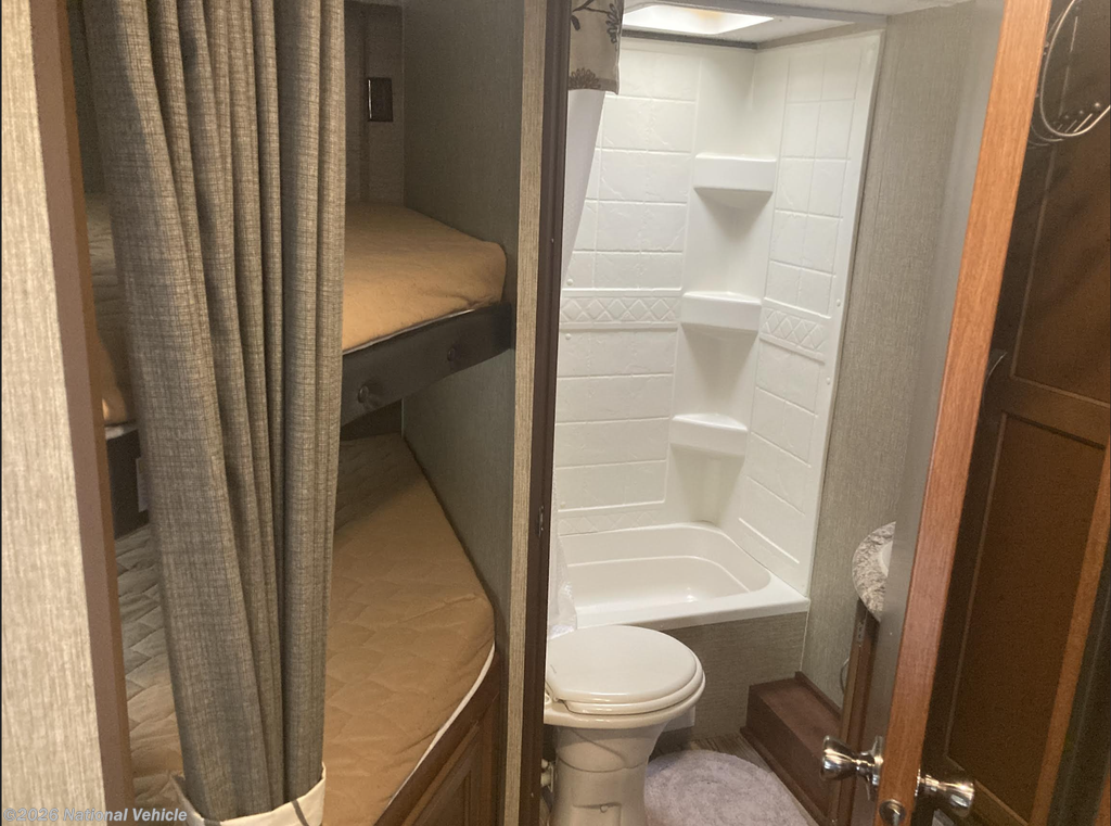 Sleeping accommodations are generous and family-friendly, with two full-size bunk beds, a fold-down queen bed, and additional sleeping space throughout. Whether hosting family or heading out for extended adventures, this layout offers flexibility without compromise.