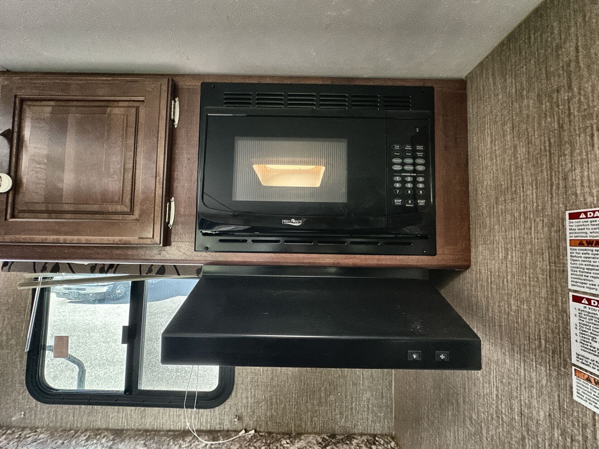 Step inside the main entry door to the kitchen and living combined area. A convenience center is on your right as well as an entertainment center. To your left you will find an L-shaped counter with a double kitchen sink, and a three burner range with overhead storage, plus a refrigerator can be found along the curb side wall.