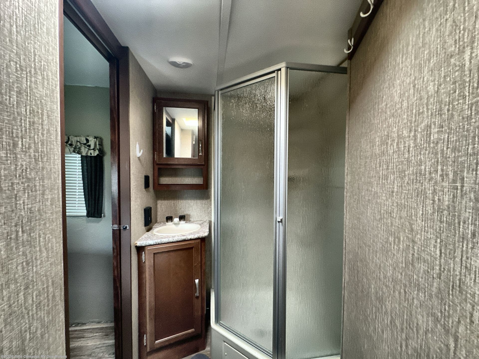 Head towards the front of the trailer where you will find a side aisle bath on your right. The full bath includes an angled shower, toilet, and sink, plus a sliding door into the bedroom.