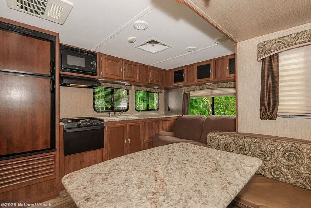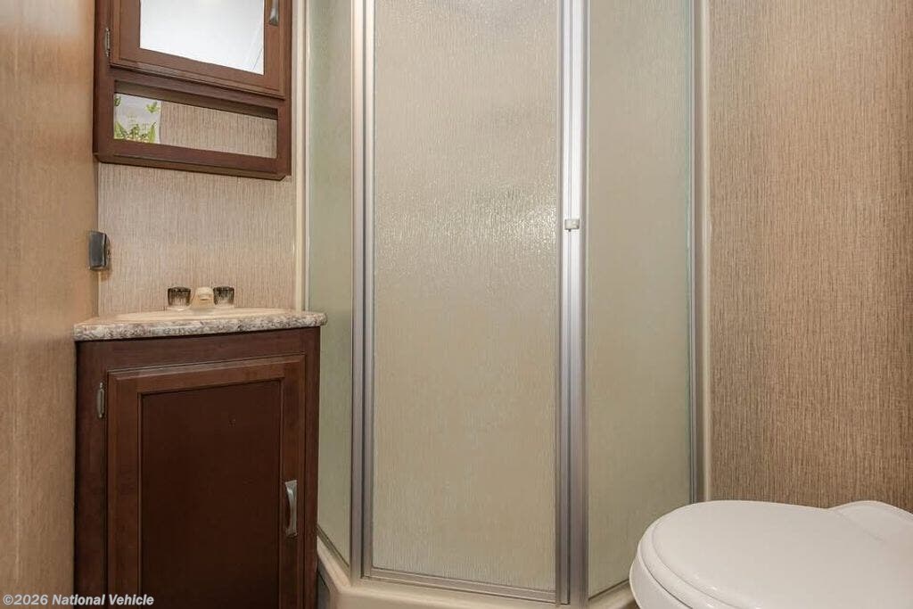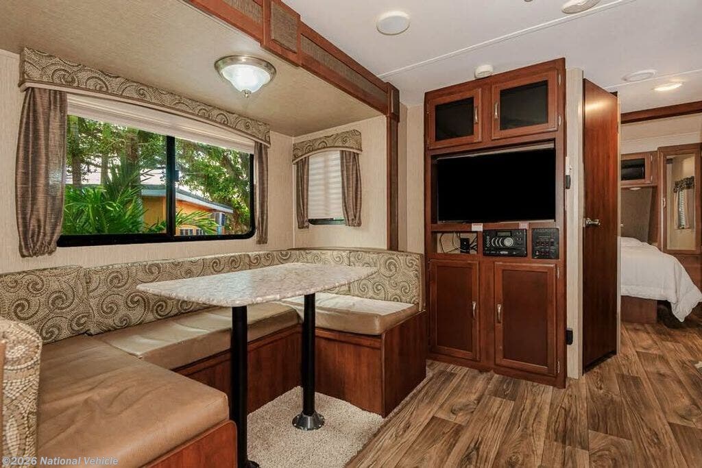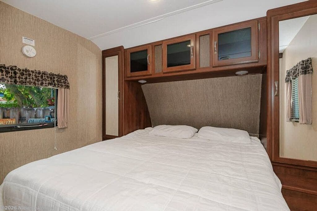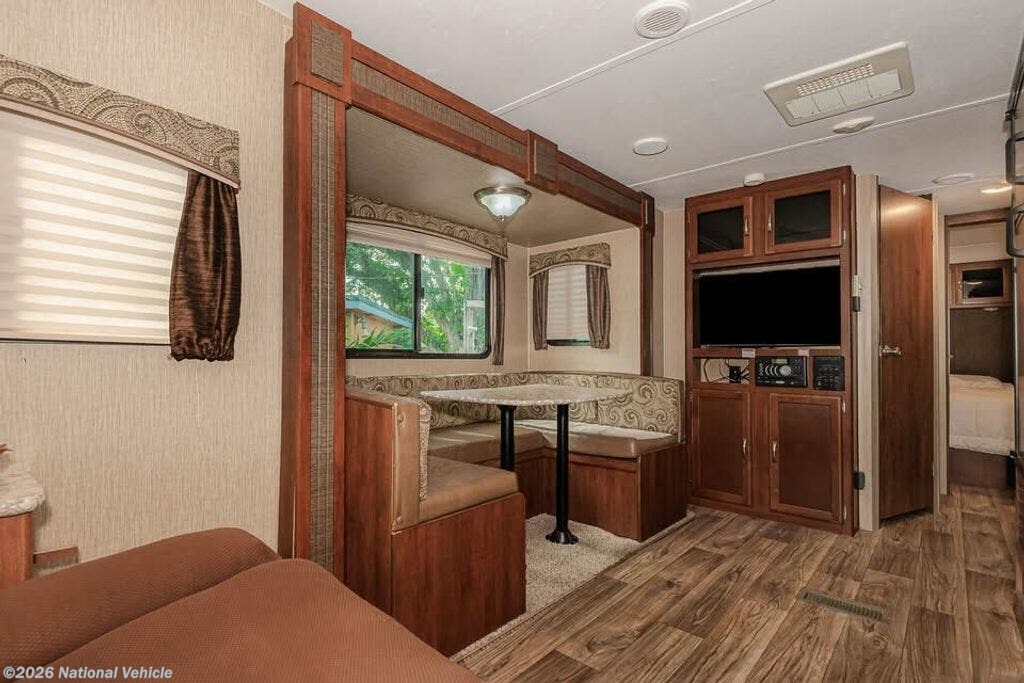 Up front, the private queen bedroom provides a cozy retreat with ample storage. The kitchen showcases stainless steel sinks, upgraded cabinetry, and smart counter space. Enjoy ducted A/C, Bluetooth stereo with DVD, and a TV already installed.