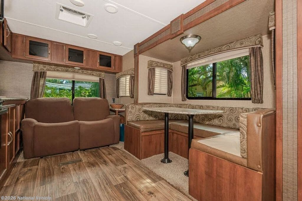 Built with an aluminum frame and fiberglass exterior, this unit features an enclosed and heated underbelly for extended-season camping. The rear living (RL) floorplan offers a spacious slide-out with a U-shaped dinette and sofa, creating an open, comfortable lounge area perfect for relaxing or entertaining.