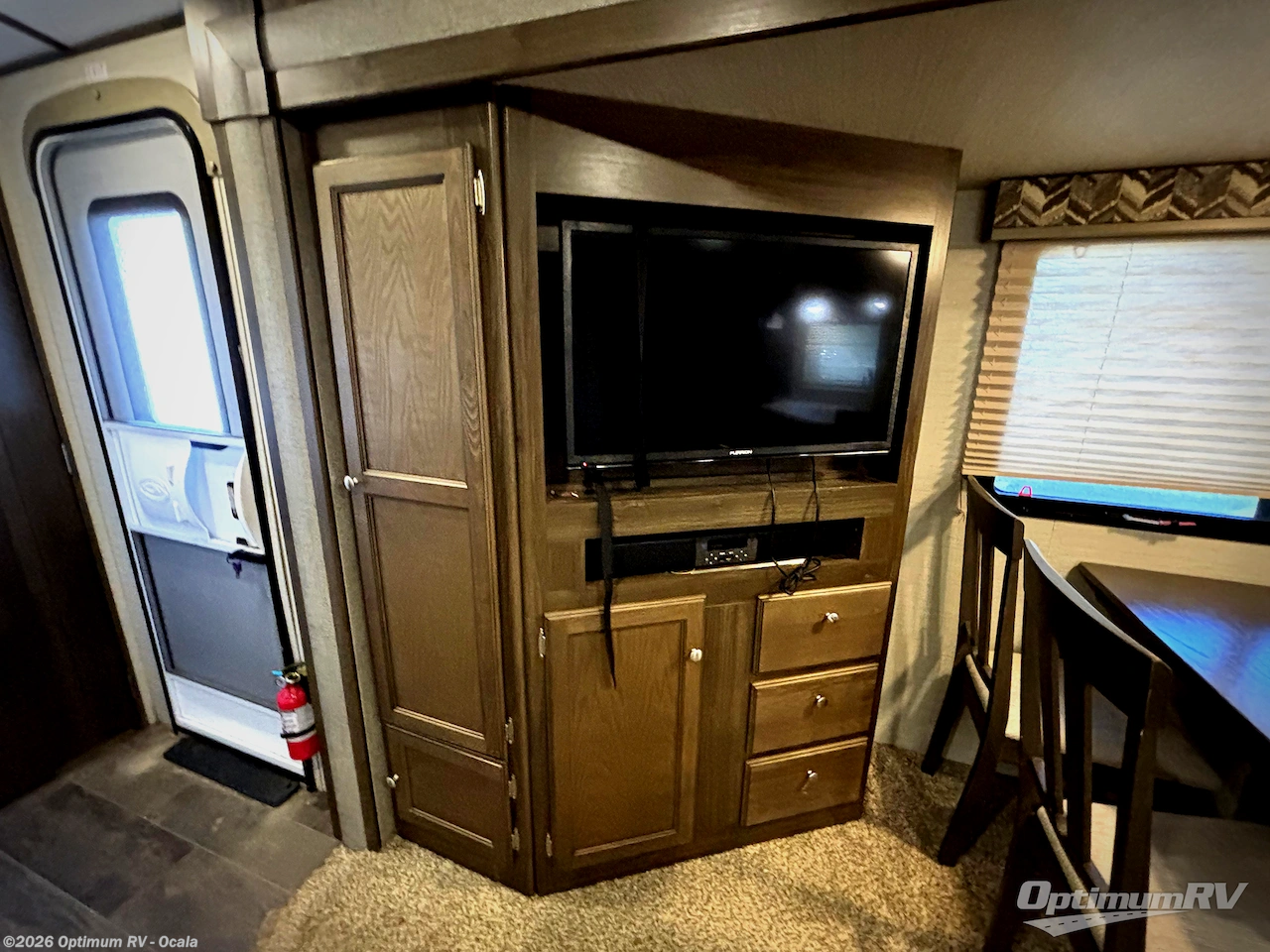 In the main living area enjoy the added space thanks to the dual slide outs. To the left of the entry door there is a slide out entertainment center with coat closet, and a free standing dinette with chairs. On the opposite side you will enjoy the tri-fold sofa for seating with an end table on one side.