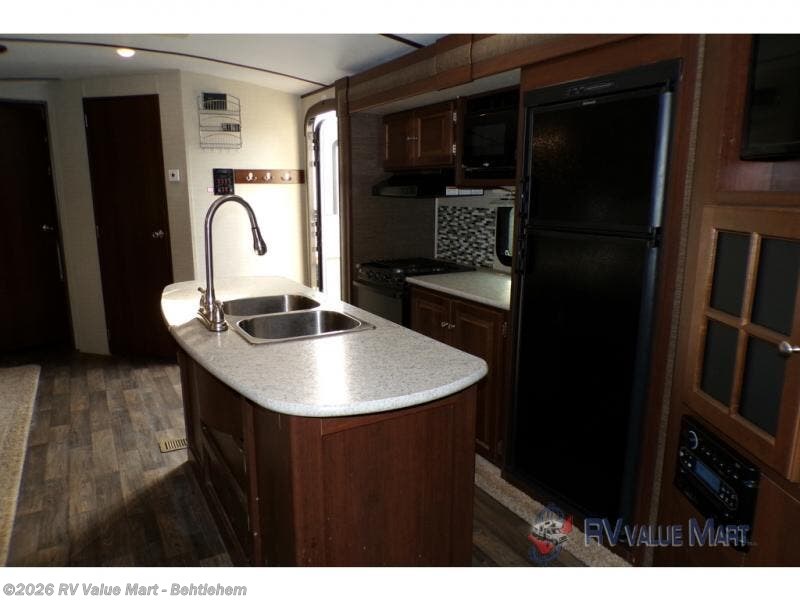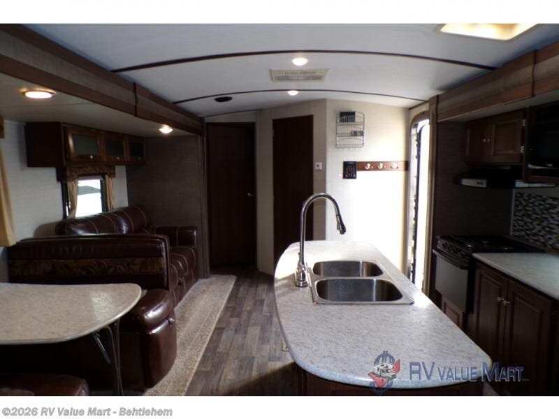 Step inside to see a spacious home like atmosphere including triple slide outs that really open up the space. The kitchen and living area are combined and feature slides opposite one another. There is a center island with dual kitchen sinks for your convenience.