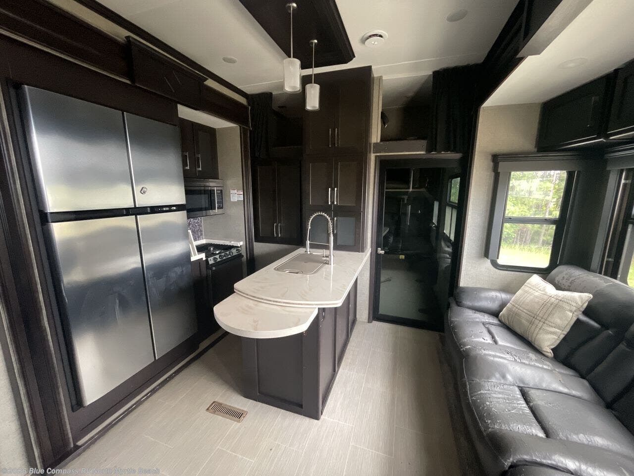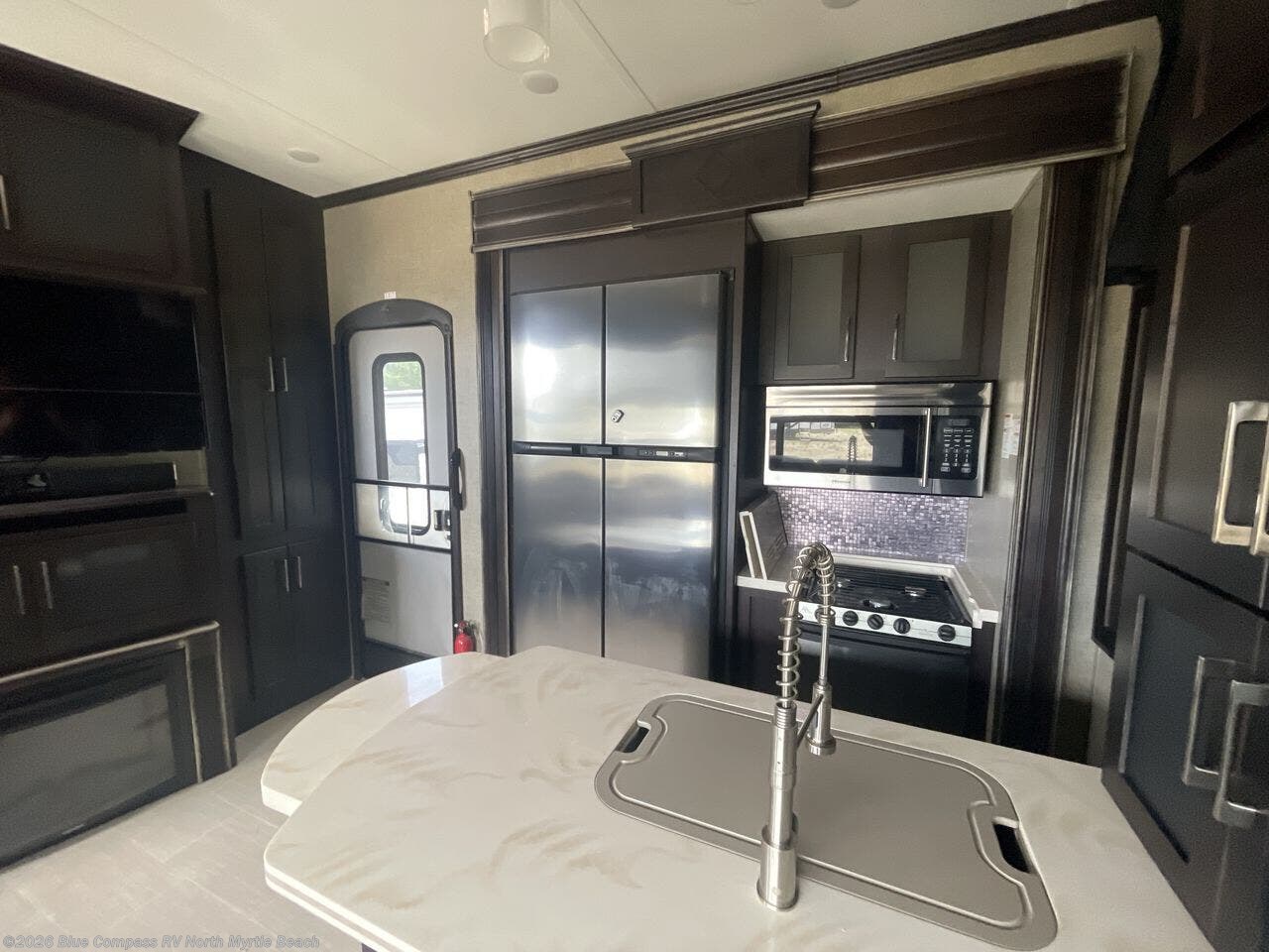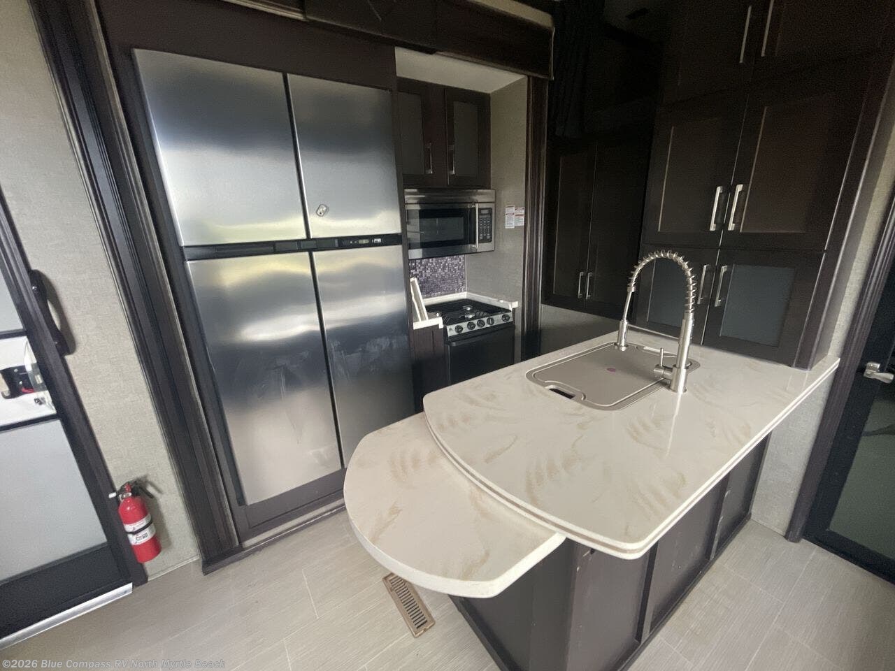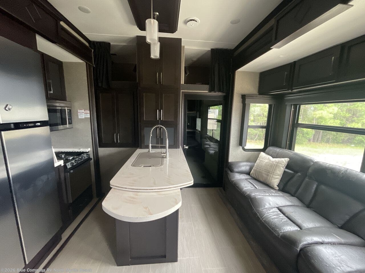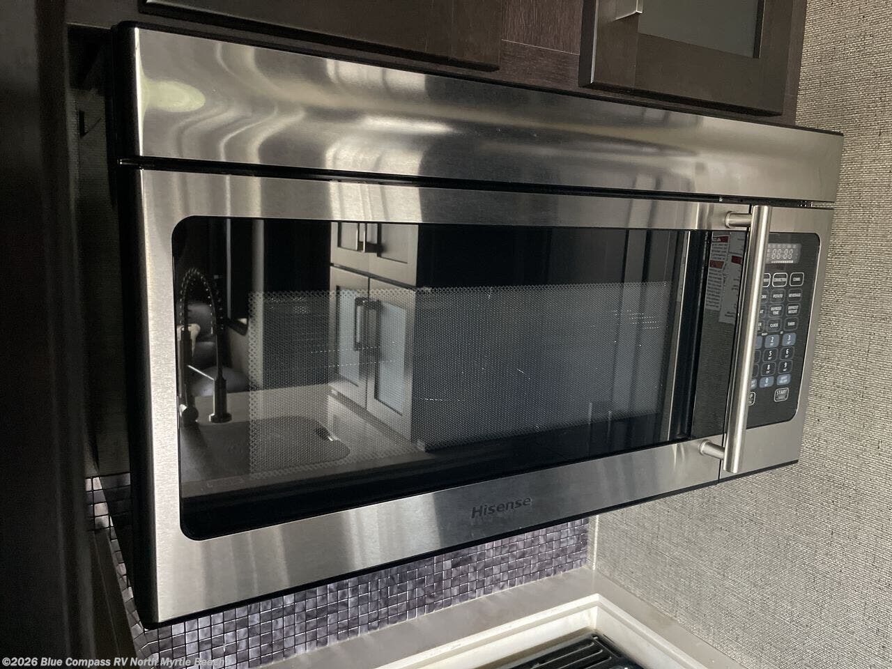 Head inside where you will find a slide out 97" sofa with recliners and a dinette table. You will also enjoy the natural light from the 72" window. There is a counter peninsula with double sink and counter extension, storage, a pantry, and a slide out three burner range, convection microwave, and 18 cu. ft. refrigerator on the opposite side. There is also an entertainment center along the interior wall with storage on one side, and stairs on the other side leading to the bathroom and front master suite.