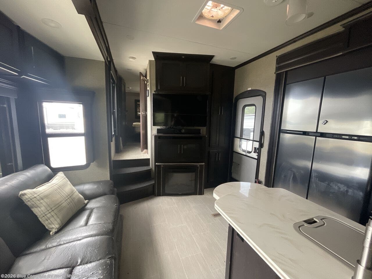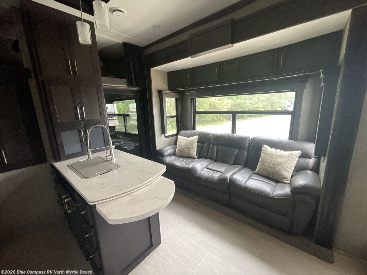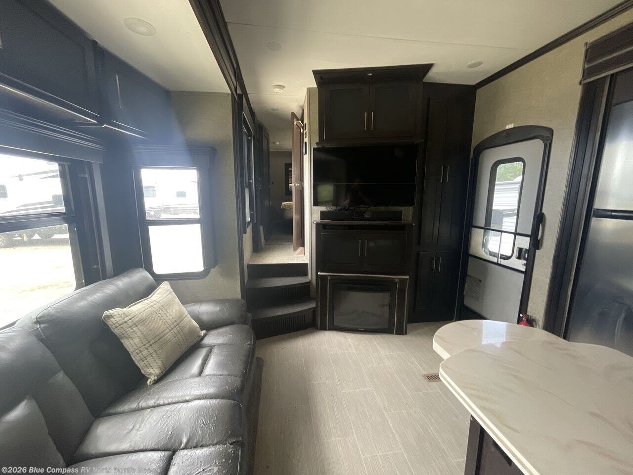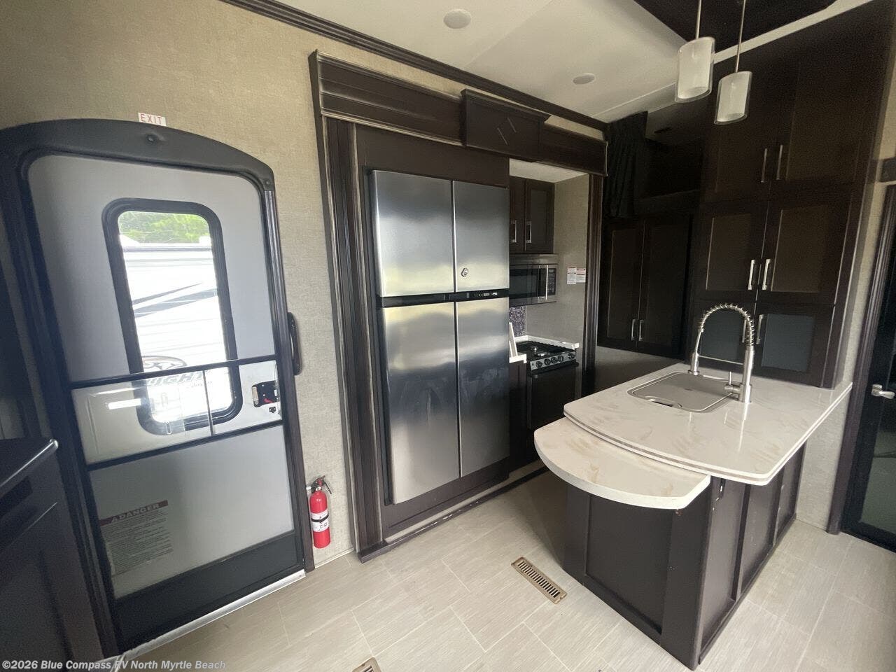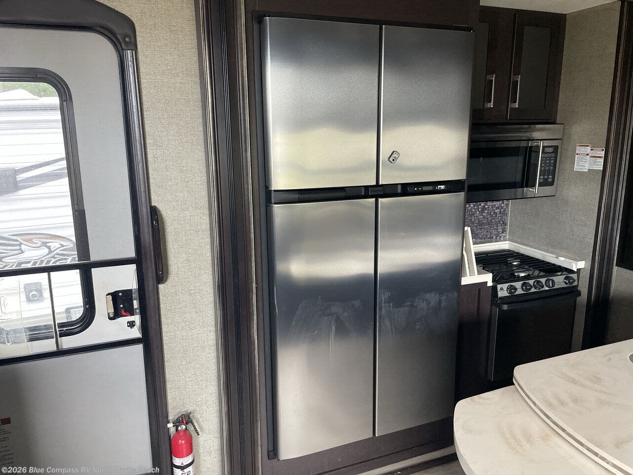 Head inside where you will find a slide out 97" sofa with recliners and a dinette table. You will also enjoy the natural light from the 72" window. There is a counter peninsula with double sink and counter extension, storage, a pantry, and a slide out three burner range, convection microwave, and 18 cu. ft. refrigerator on the opposite side. There is also an entertainment center along the interior wall with storage on one side, and stairs on the other side leading to the bathroom and front master suite.