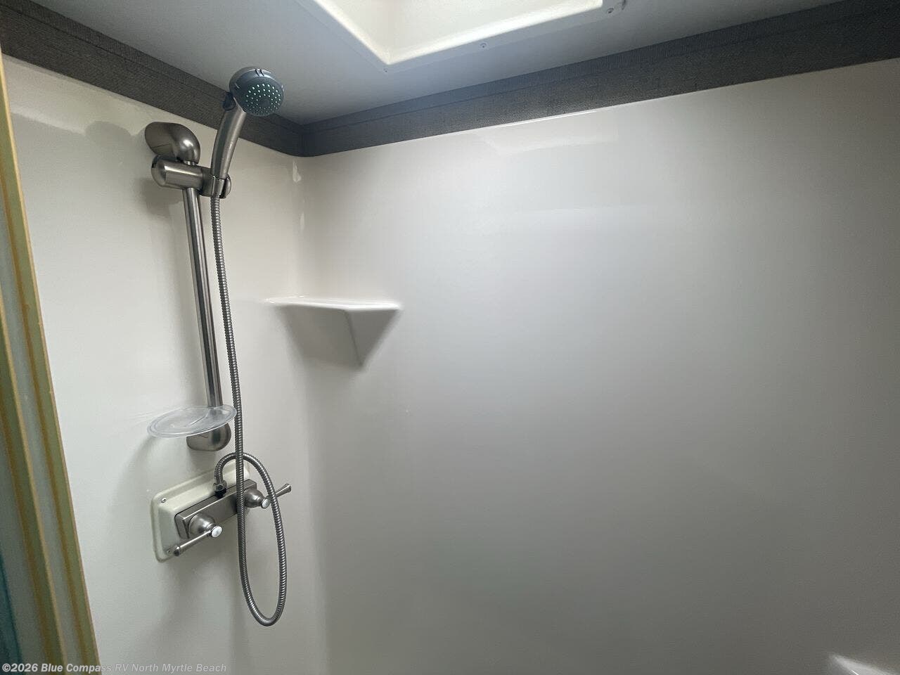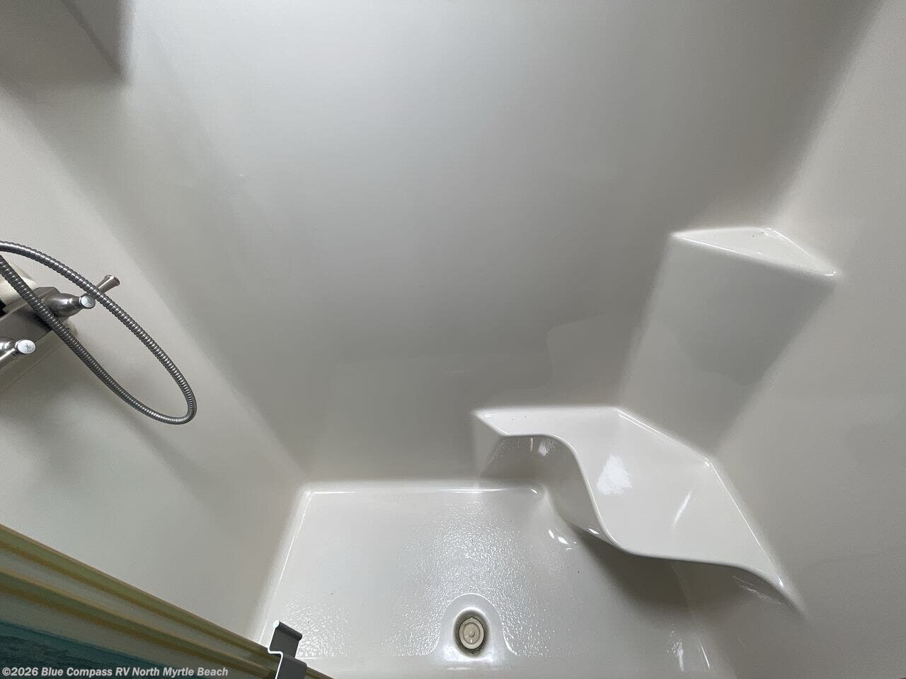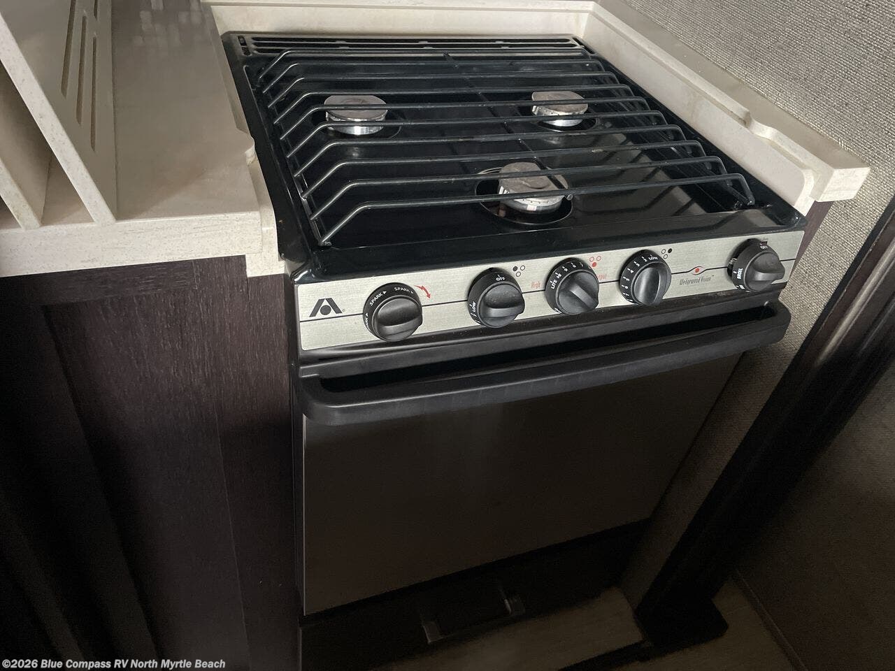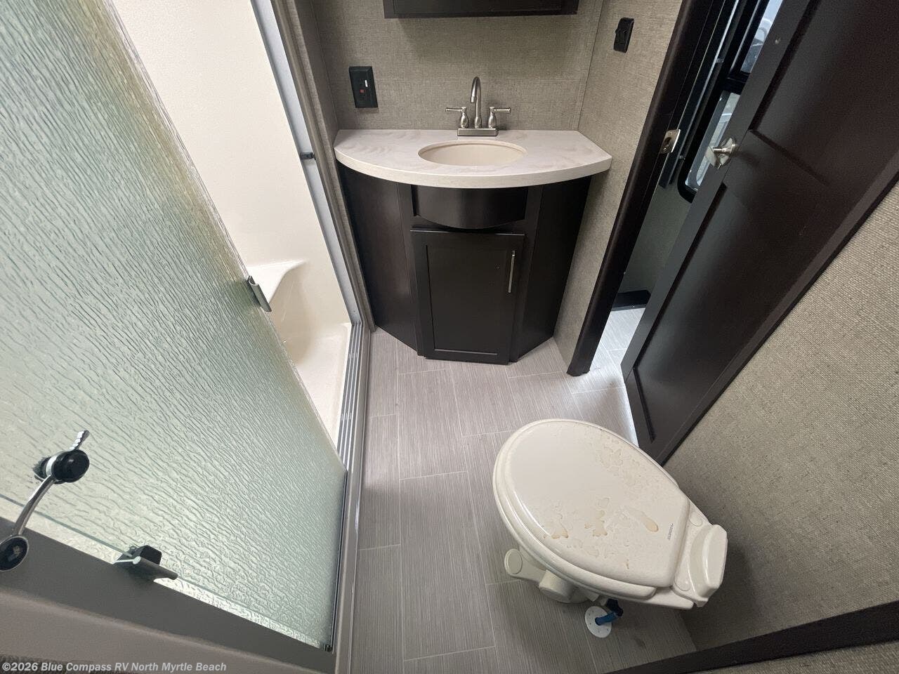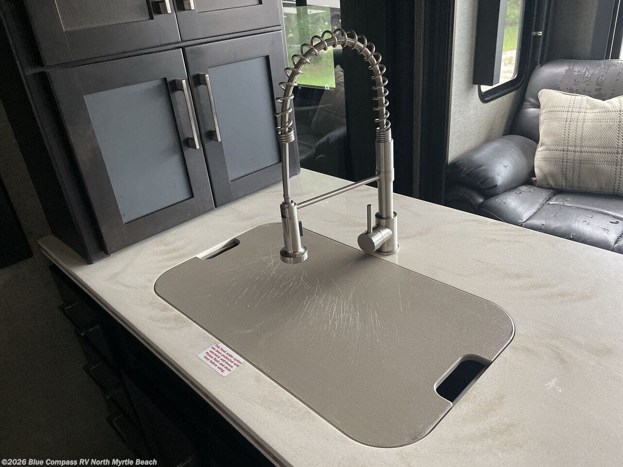 Head inside where you will find a slide out 97" sofa with recliners and a dinette table. You will also enjoy the natural light from the 72" window. There is a counter peninsula with double sink and counter extension, storage, a pantry, and a slide out three burner range, convection microwave, and 18 cu. ft. refrigerator on the opposite side. There is also an entertainment center along the interior wall with storage on one side, and stairs on the other side leading to the bathroom and front master suite.
