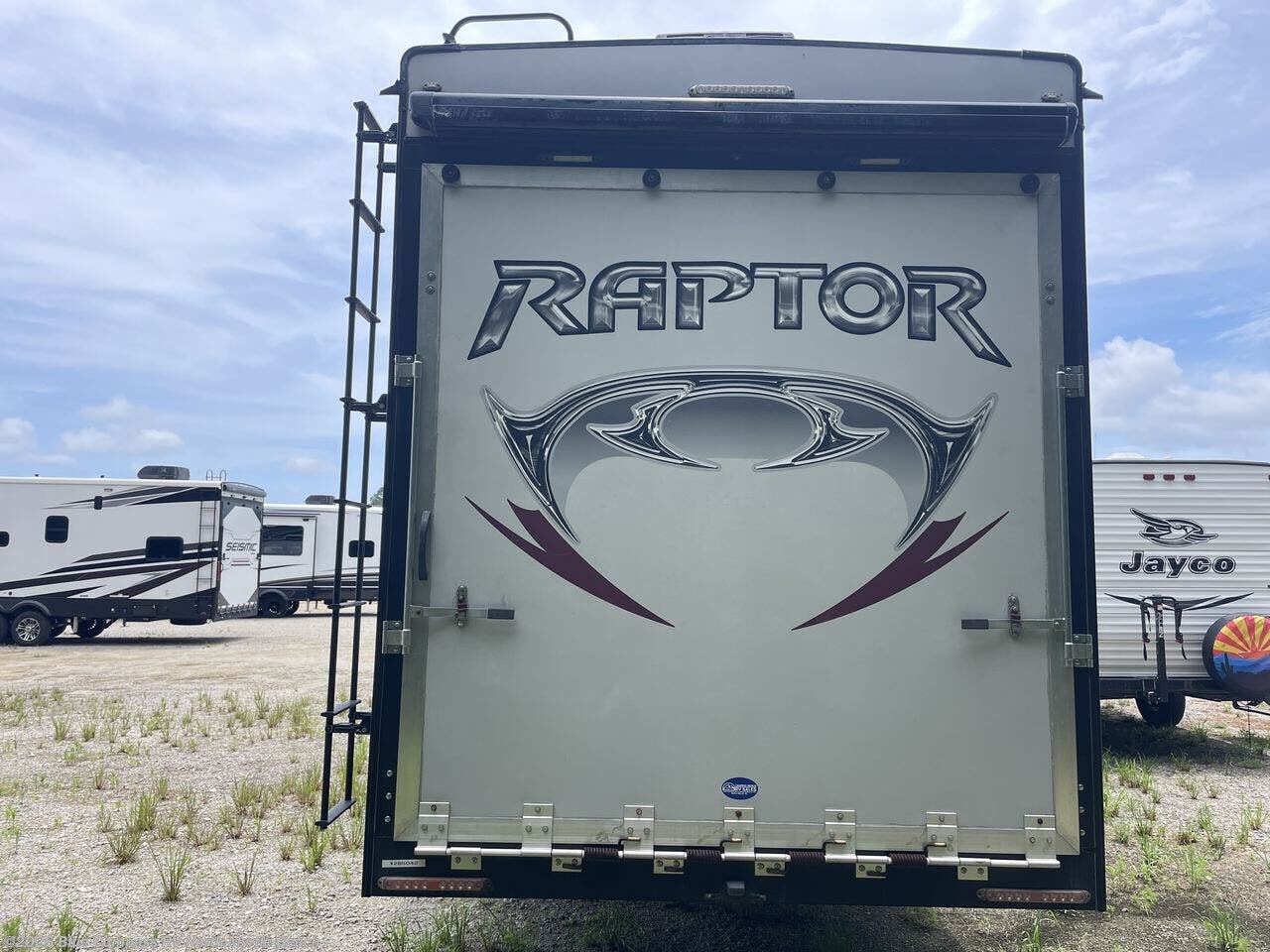 Take your fun up a notch camping in this Keystone Raptor fifth wheel toy hauler model 352TS featuring triple slides, a 12'6" garage with twin loft, and dual entry doors besides the rear ramp door.