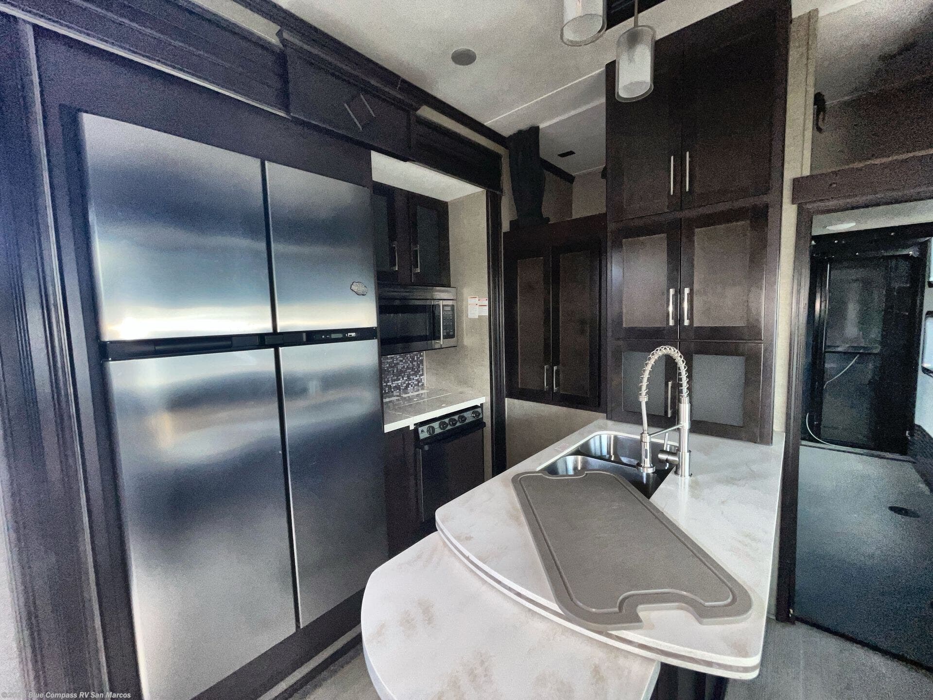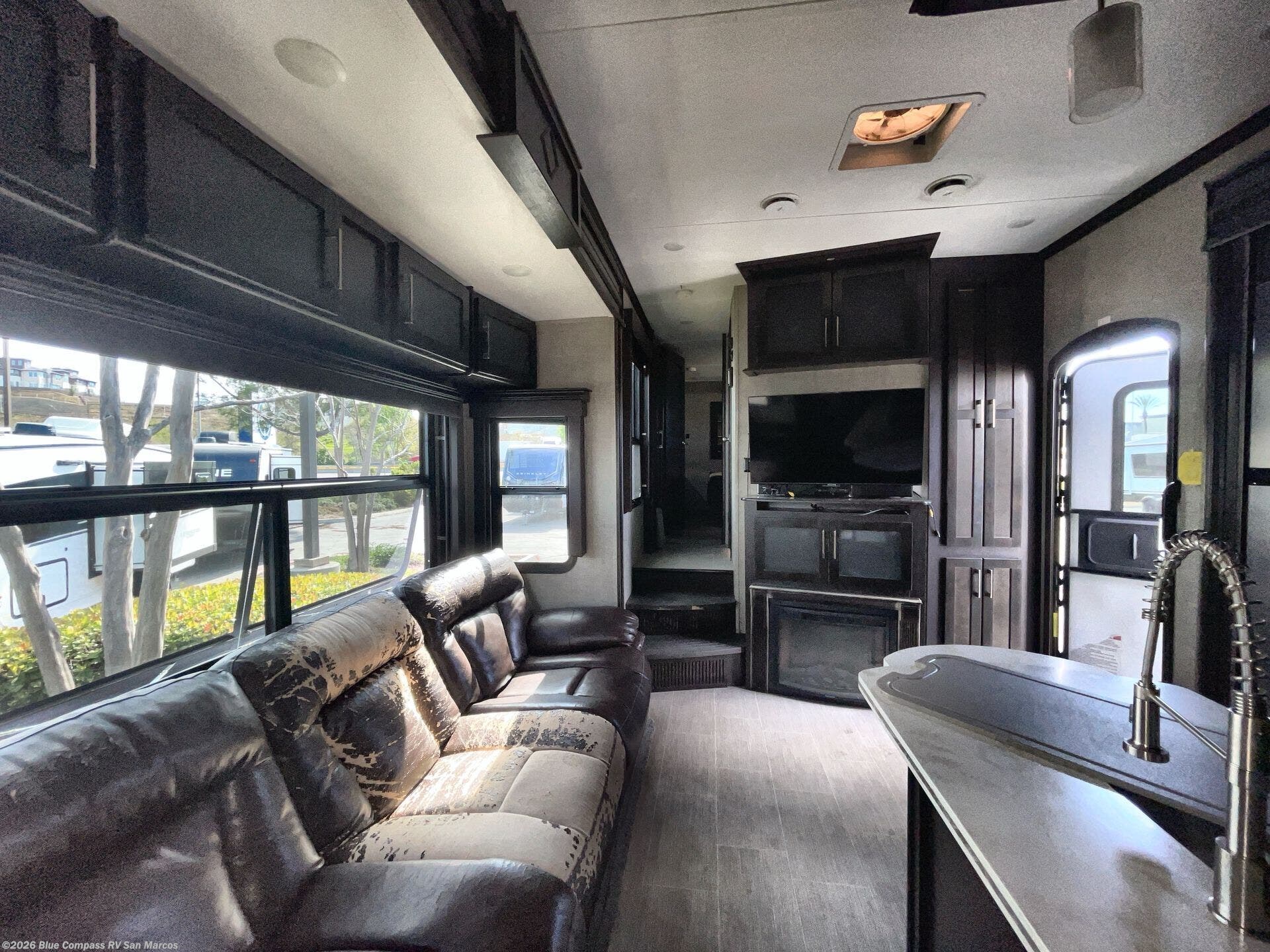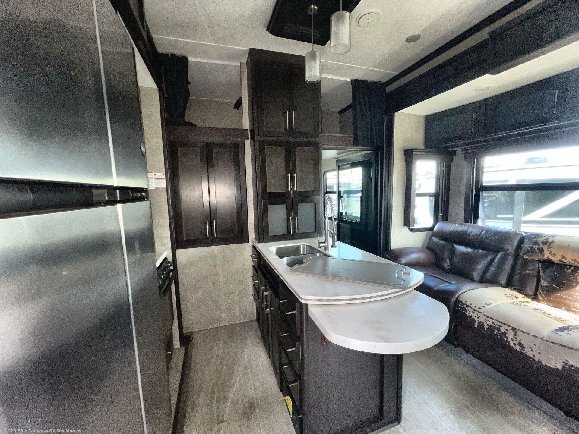 Head inside where you will find a slide out 97" sofa with recliners and a dinette table. You will also enjoy the natural light from the 72" window. There is a counter peninsula with double sink and counter extension, storage, a pantry, and a slide out three burner range, convection microwave, and 18 cu. ft. refrigerator on the opposite side. There is also an entertainment center along the interior wall with storage on one side, and stairs on the other side leading to the bathroom and front master suite.