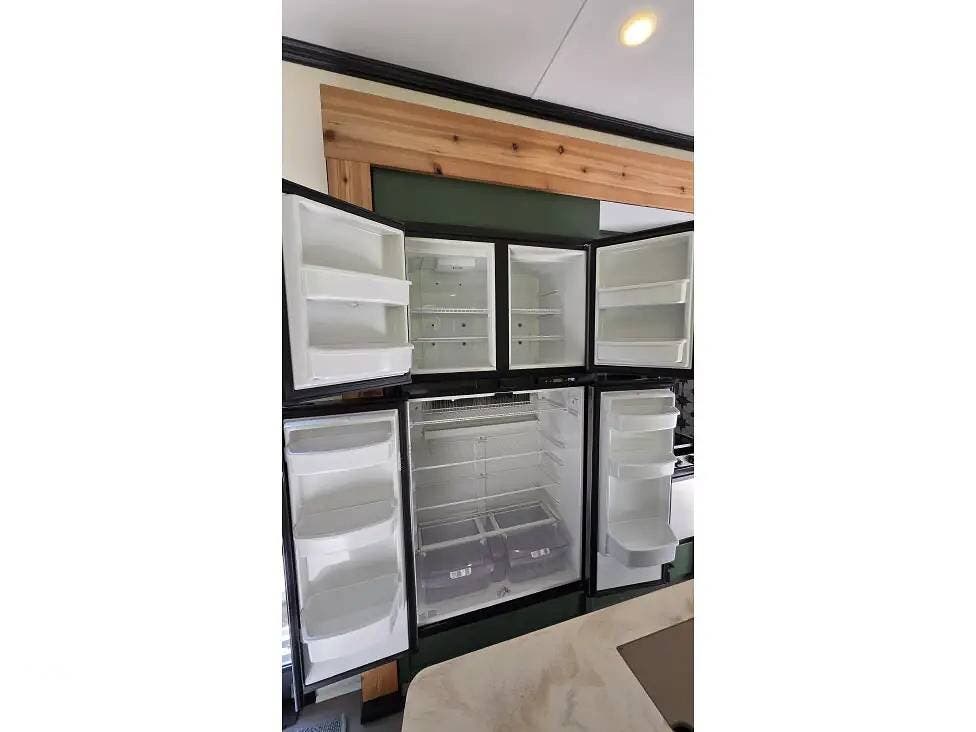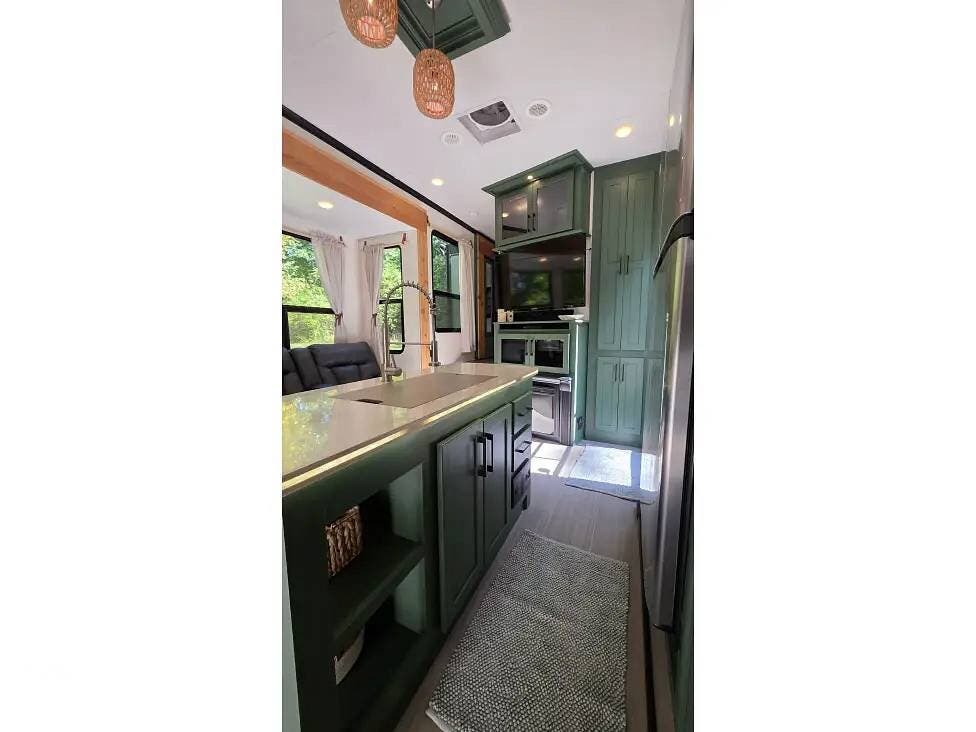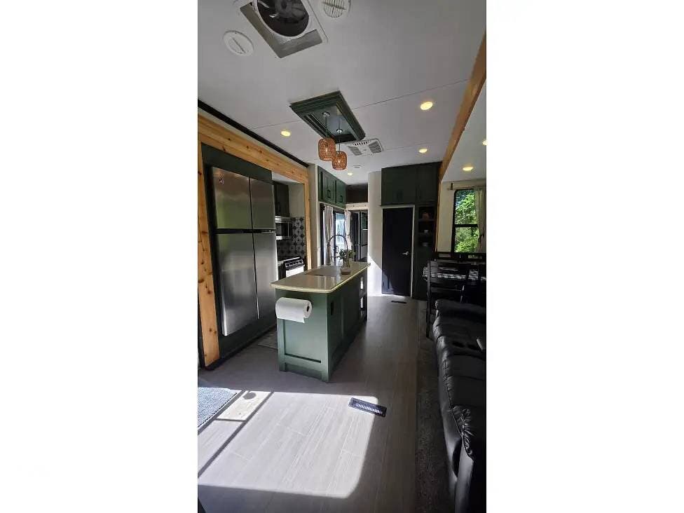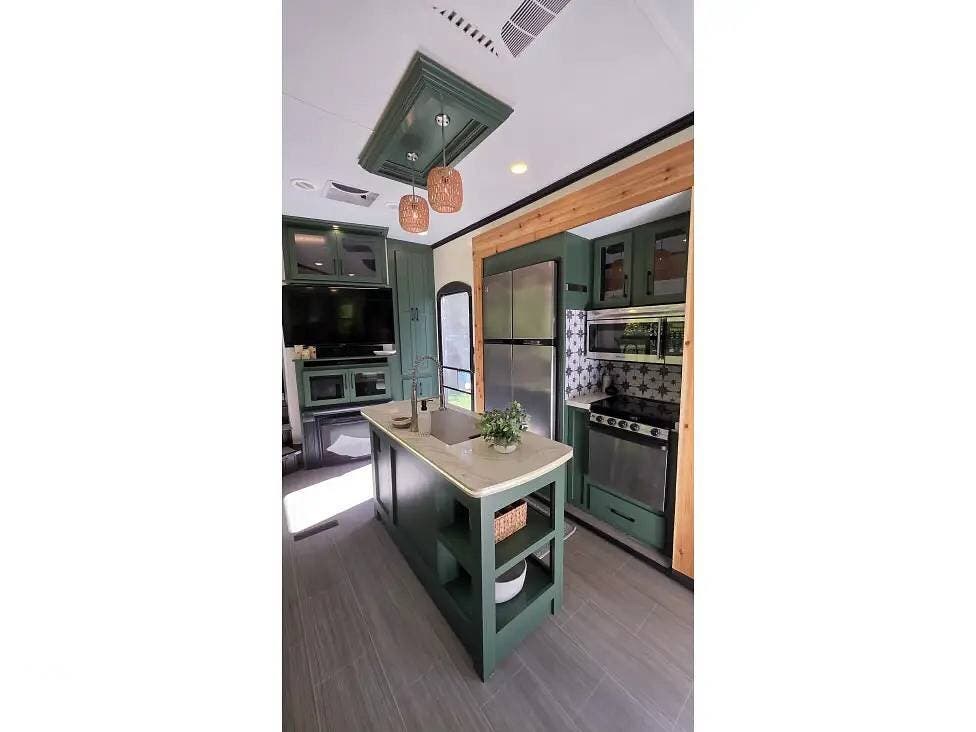 The spacious living area is designed for both comfort and style, featuring a center island with solid-surface countertops. The kitchen is fully equipped with an 18 cu. ft. refrigerator, a large double stainless steel sink with a high-arched faucet, a 3-burner cooktop and oven, and a residential-size stainless steel microwave -- perfect for making meals on the go.