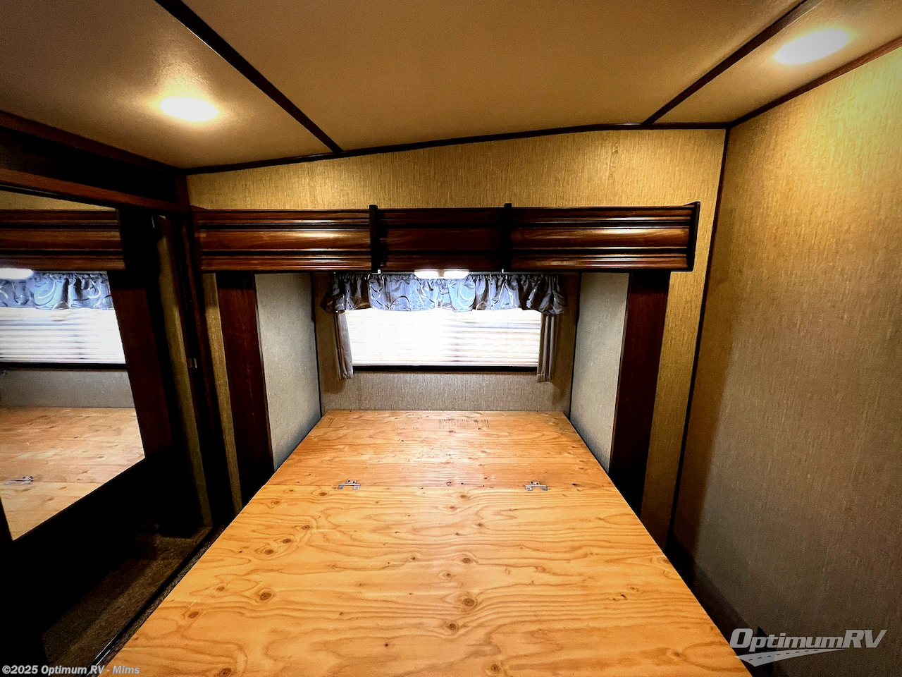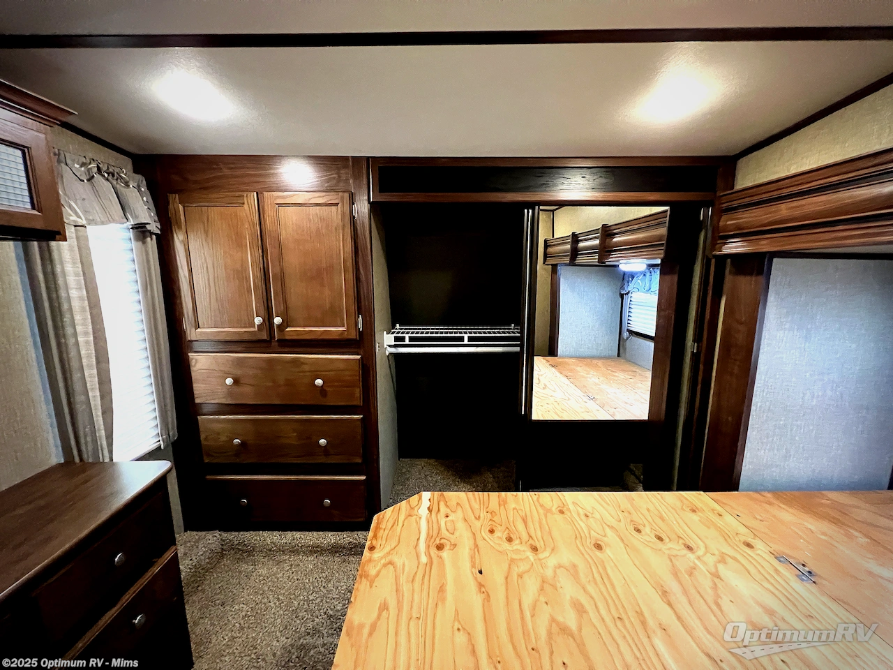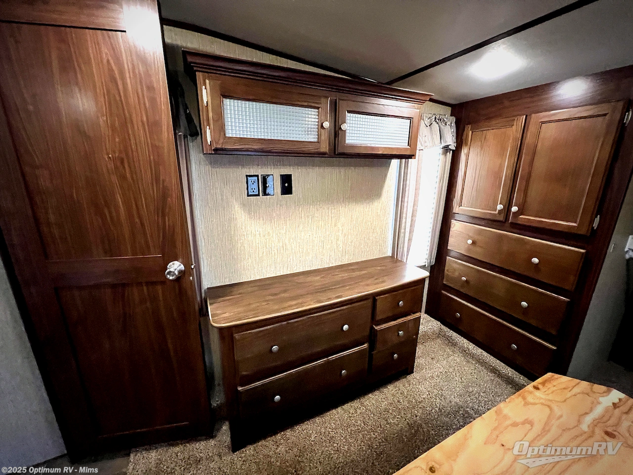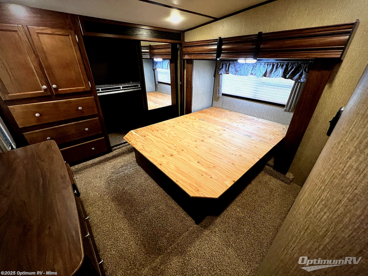 The private front bedroom features a slide out residential queen bed with overhead storage along the curb side, a dresser with overhead storage on the road side, and a full front wardrobe with sliding doors and a closet that has been prepped for a washer/dryer, plus so much more!