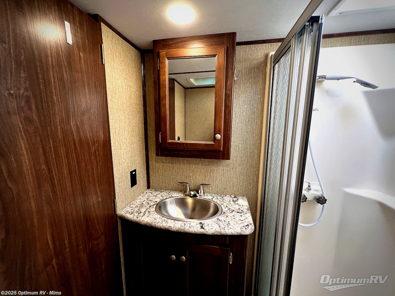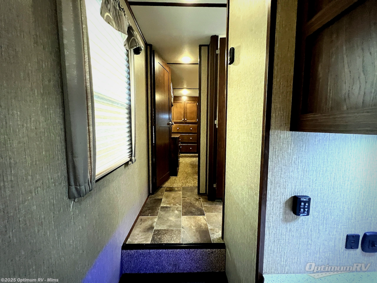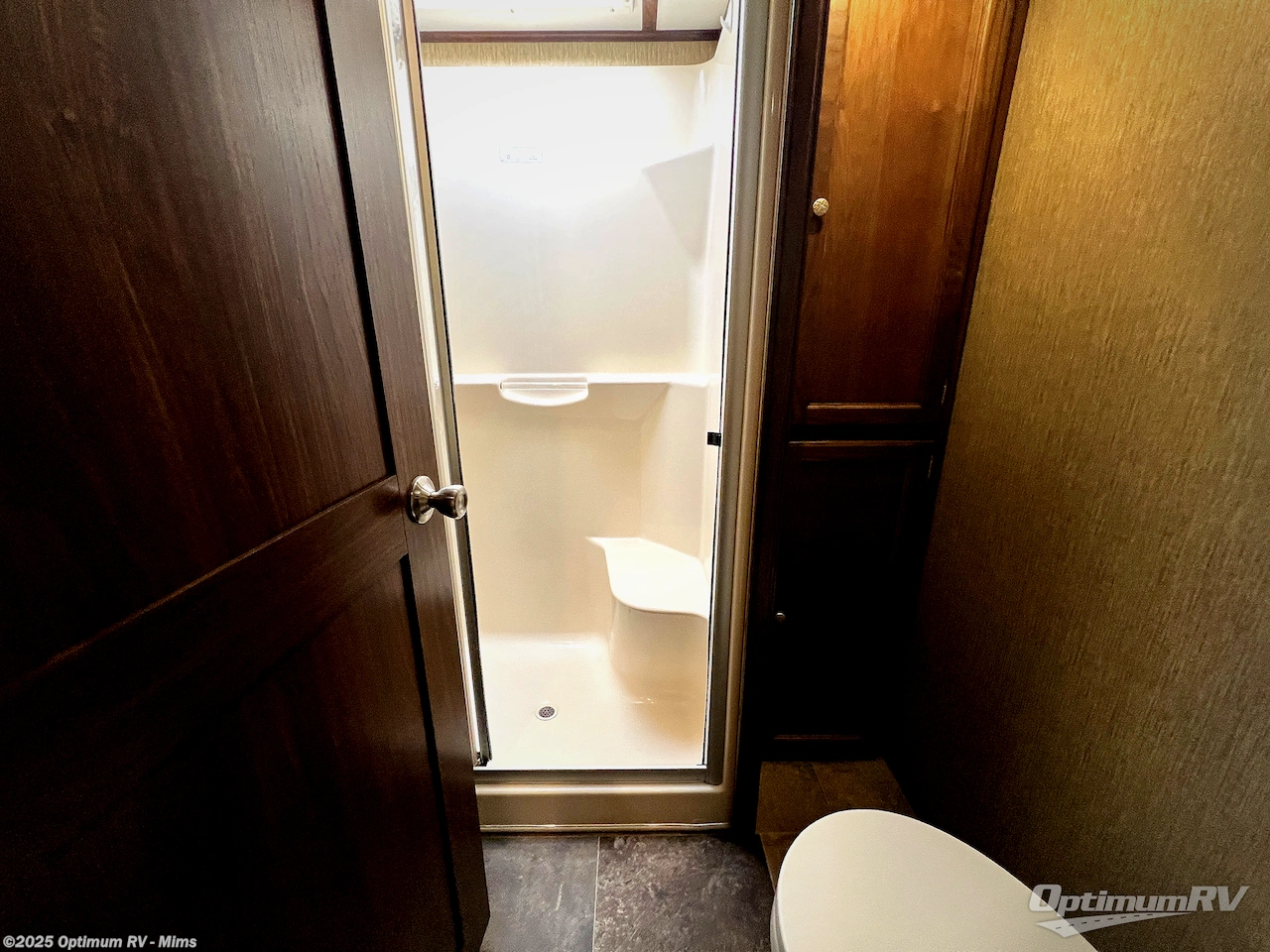 Step up to a side aisle bath and front bedroom. The bath features a residential shower, toilet, sink, and linen cabinet.