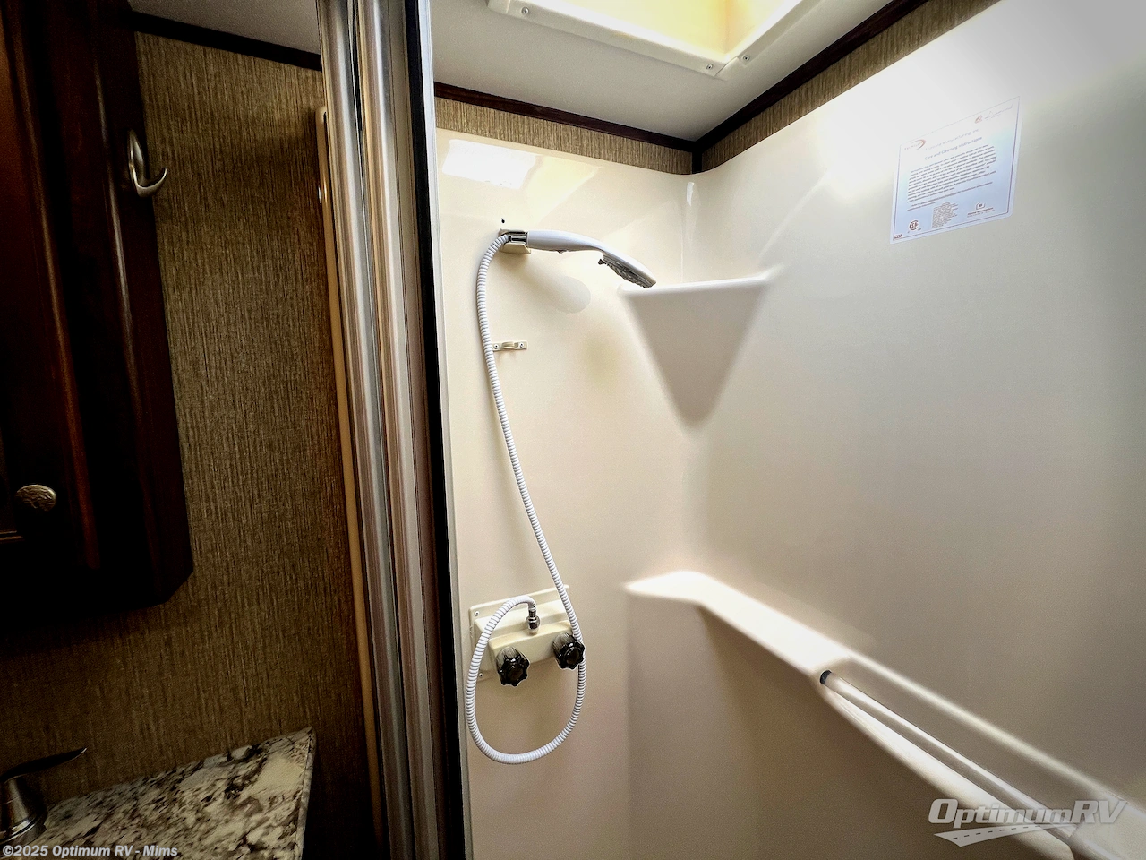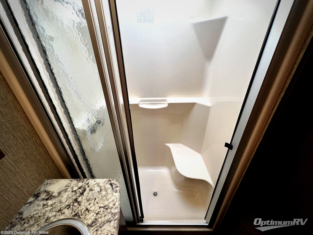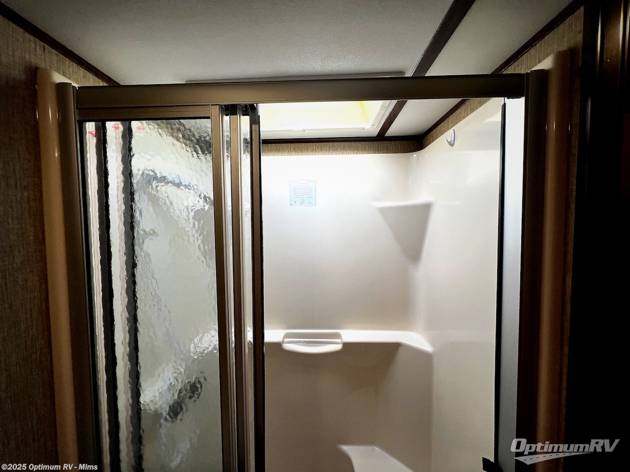 Step up to a side aisle bath and front bedroom. The bath features a residential shower, toilet, sink, and linen cabinet.