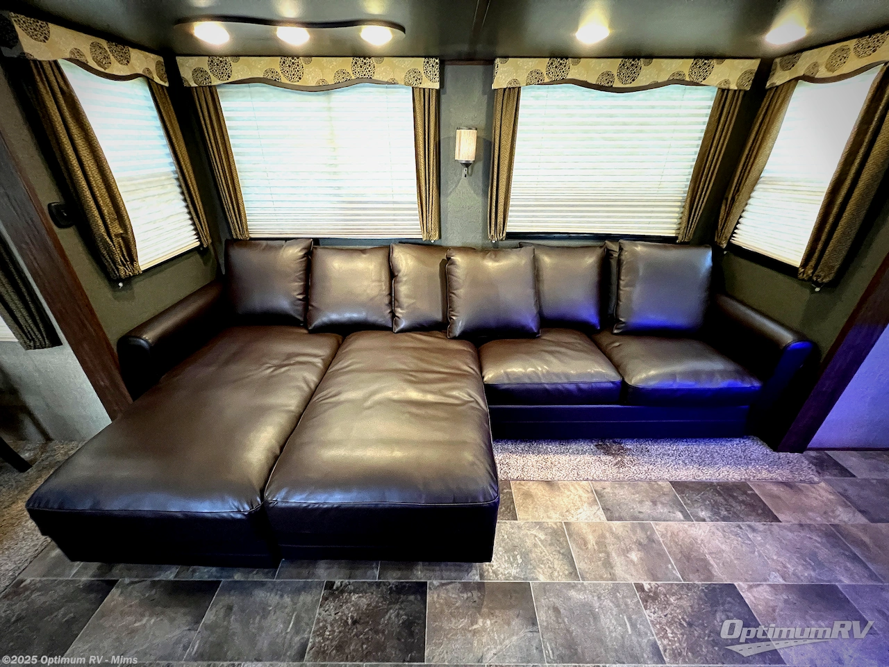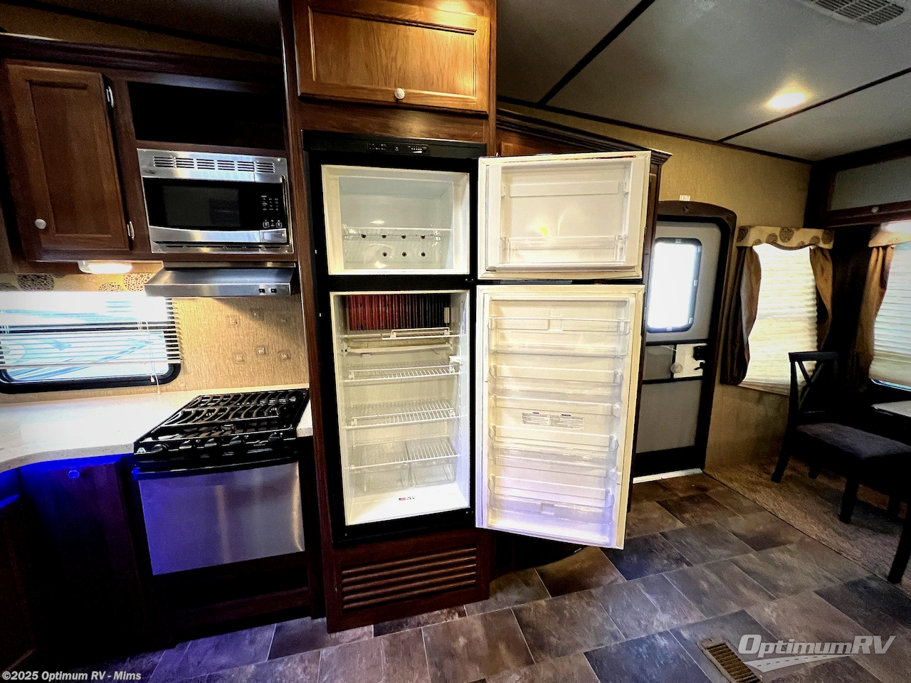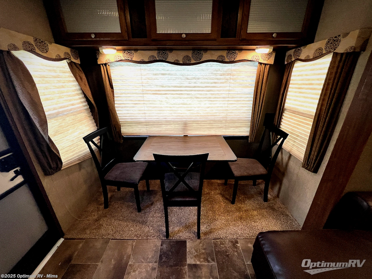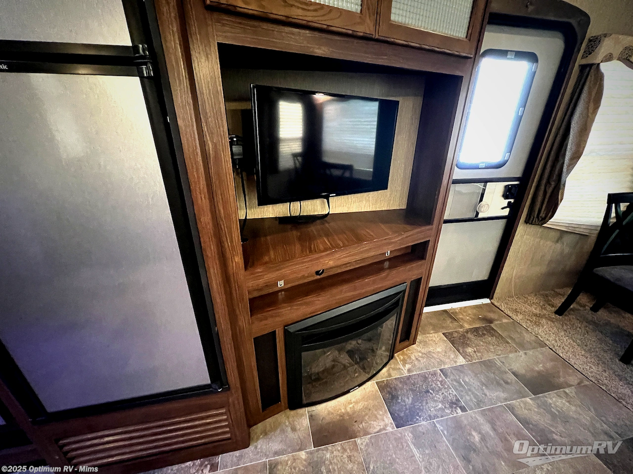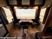 Step inside and be greeted by a wide open living area featuring two swivel rocking chairs along the rear wall that also includes an end table and overhead storage cabinets. You can choose two optional rocker recliners instead if you like. There is a tri-fold sleeper sofa and booth dinette slide opposite the door side. Enjoy the entertainment center featuring a 40" TV and fireplace just to the right of the entry door for your inside camping days.