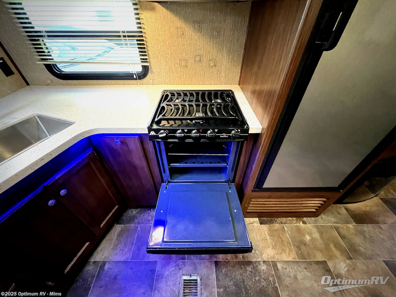 The kitchen features everything needed to create meals and snacks while away from home. There is a refrigerator, a three burner range, counter space for food prep, and a large kitchen sink along the curb side and interior wall. You will also find plenty of overhead storage for dishes and things.