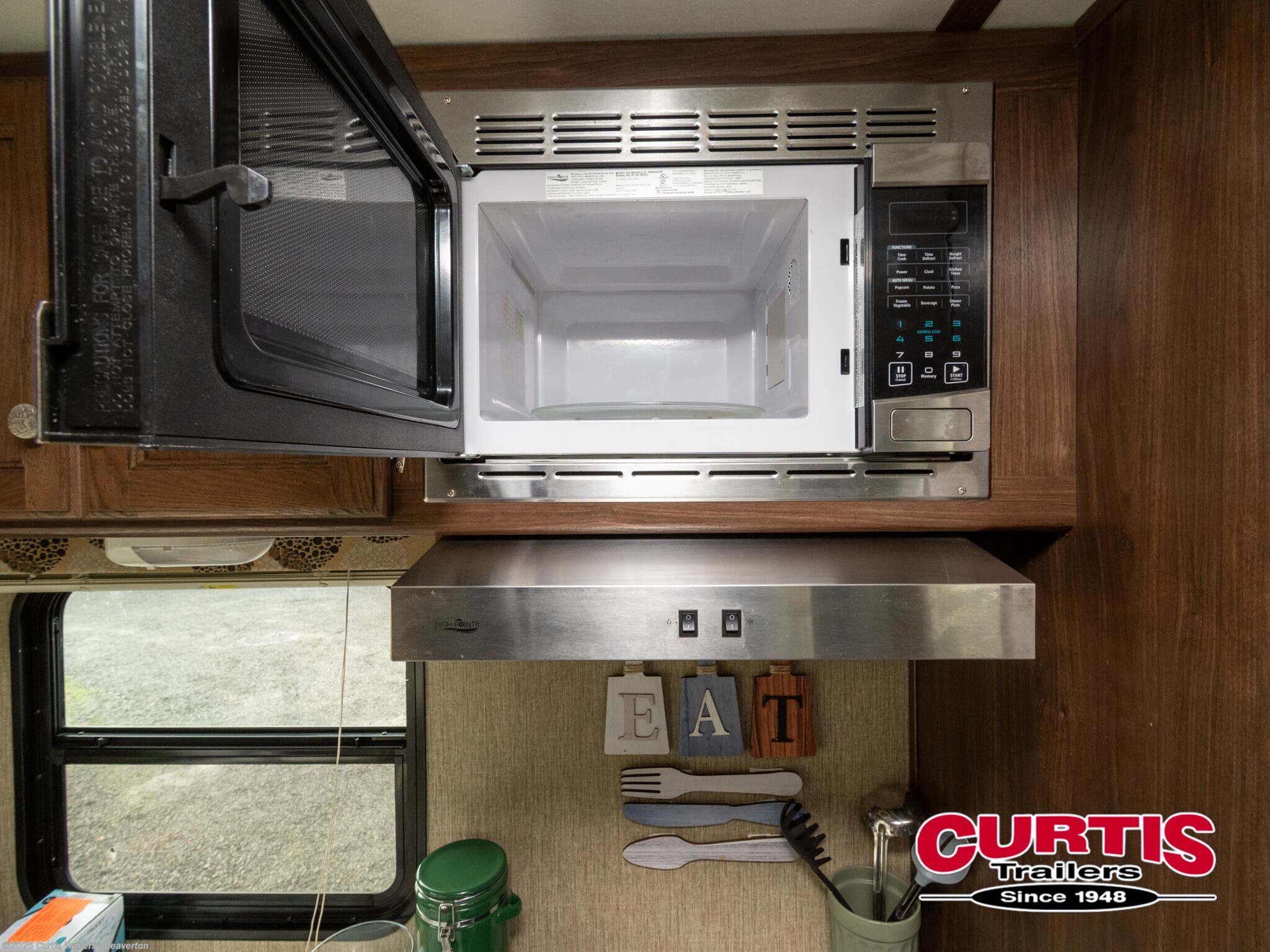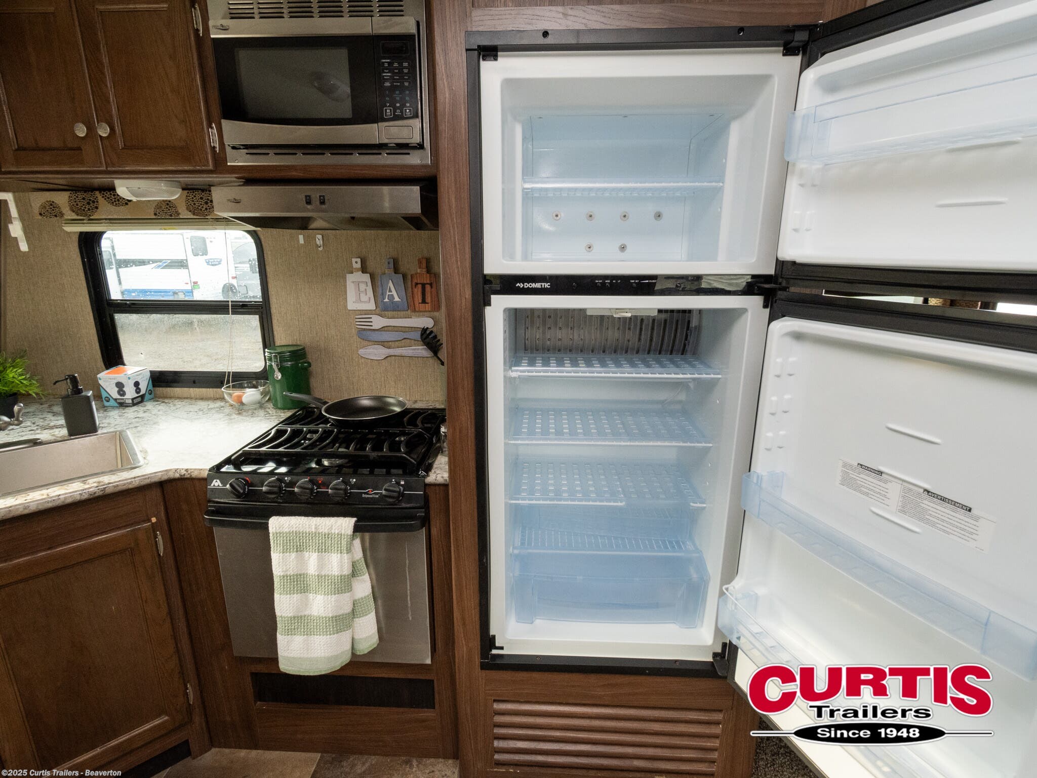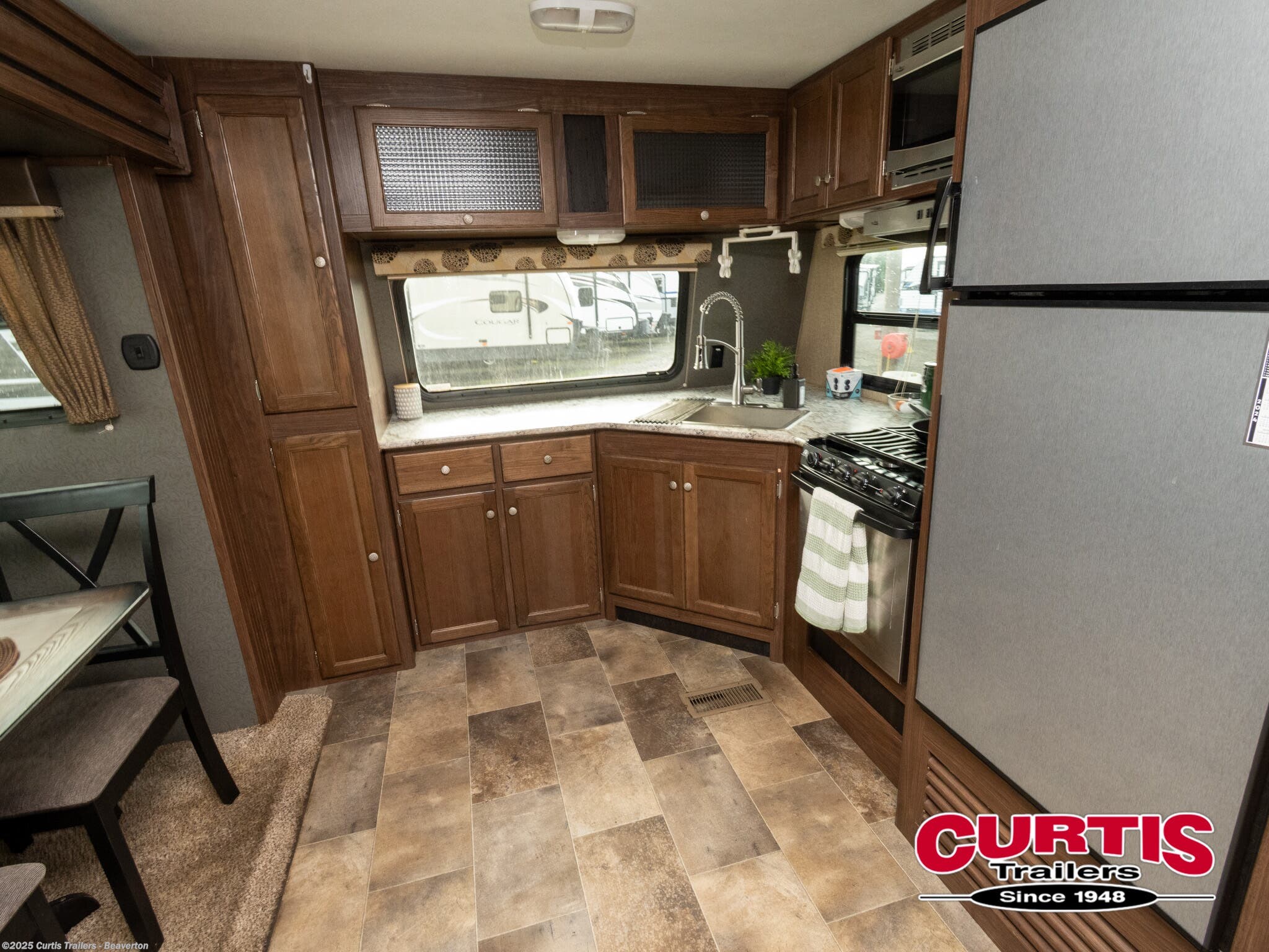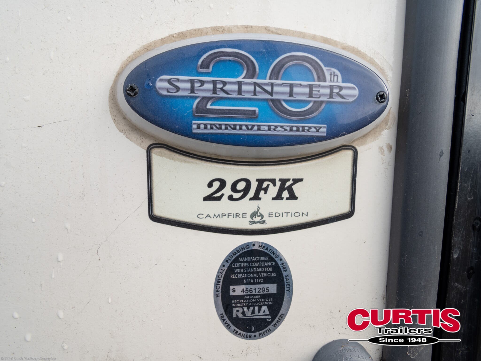 This Keystone Sprinter Campfire Edition travel trailer model 29FK features a front kitchen, a rear bedroom, and more! Step inside and find a spacious interior due to the slide which includes a tri-fold sofa sleeper, and booth dinette. There is a 32 TV straight in the door along the interior wall. To the right of the door find a lounge chair, and the start of the kitchen appliances which includes a 7 cu. ft. refrigerator, and a three burner range. The counter continues along the front wall and features an angled double sink in the front curb side corner. There is plenty of prep space and storage both above and below the counter-top, and it ends with a pantry in the road side front corner. A side aisle bath found to the left of the door along the road side includes a radius shower, a toilet, sink, and linen storage. There is also an entry into the bath from the rear bedroom for added convenience. The private bedroom features a slide out residential size queen bed with overhead cabinets, a dresser, and a wardrobe, plus so much more.