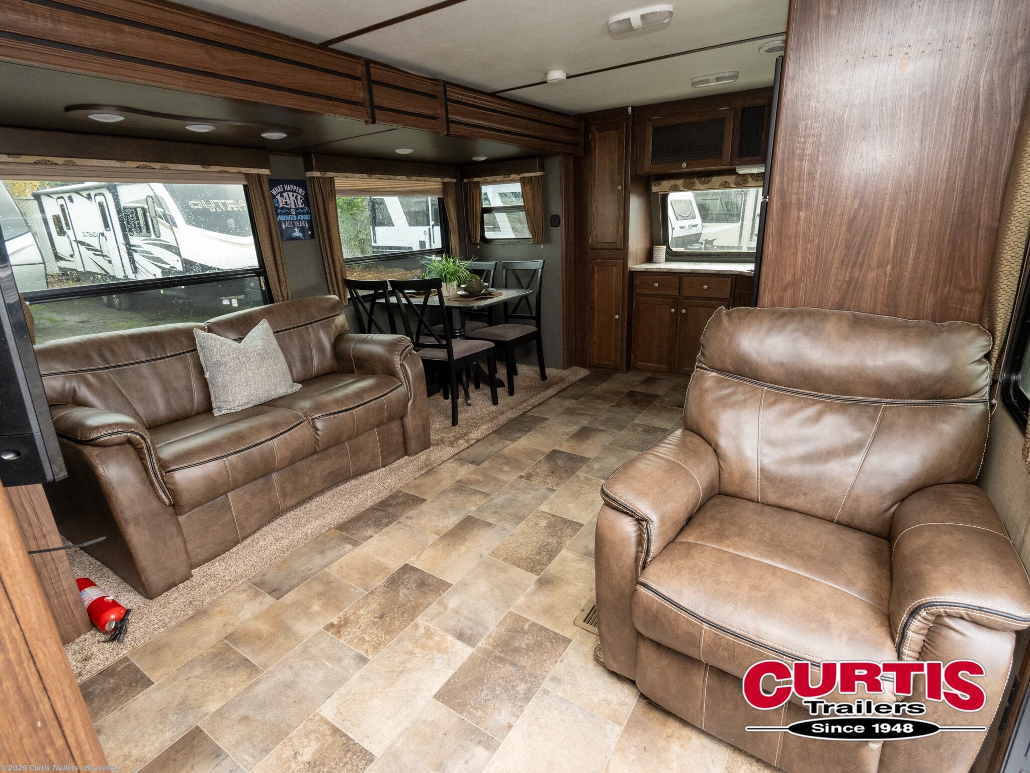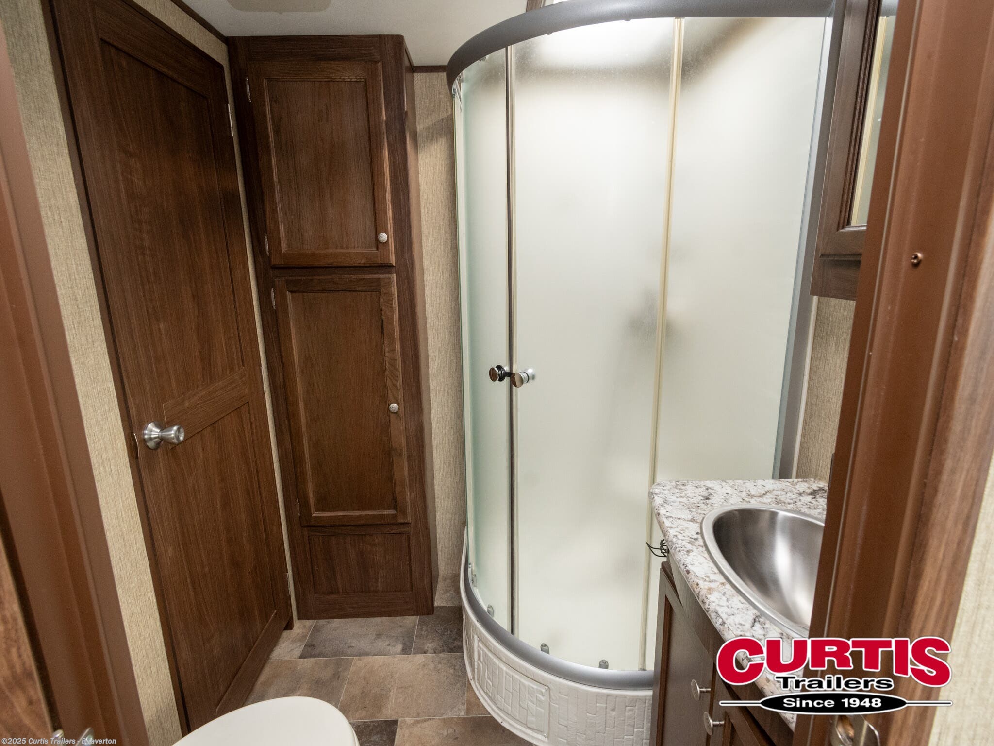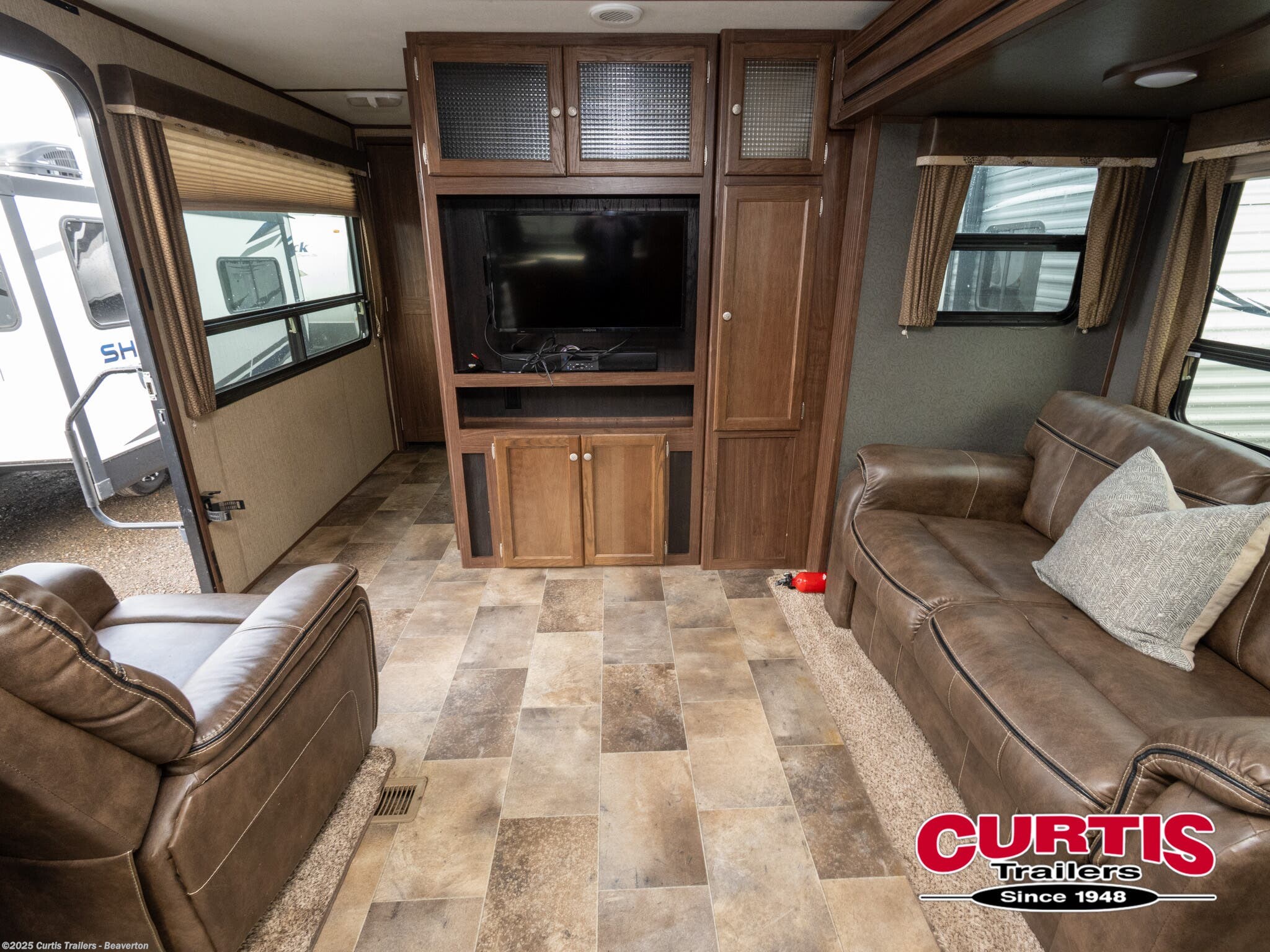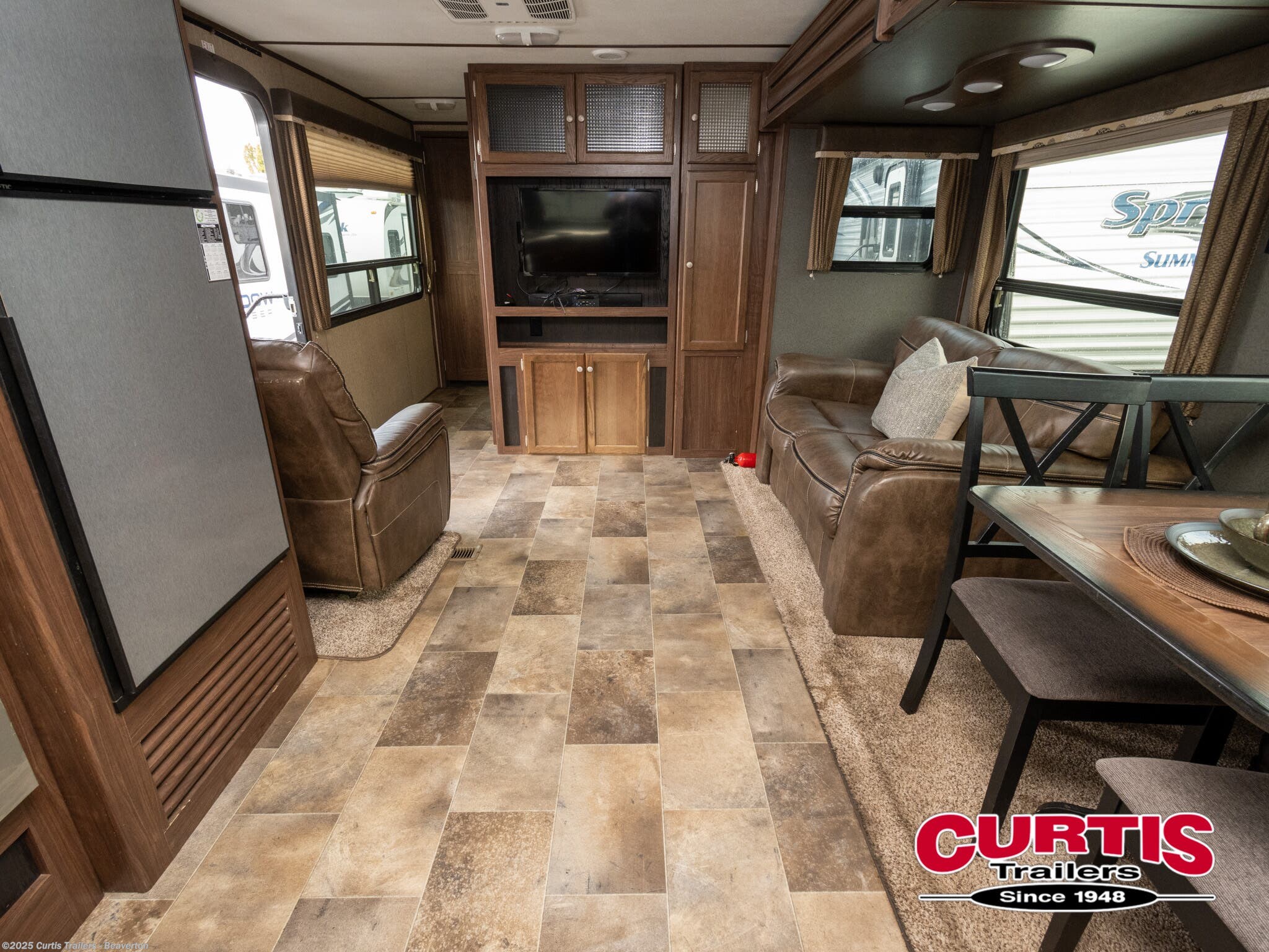 This Keystone Sprinter Campfire Edition travel trailer model 29FK features a front kitchen, a rear bedroom, and more! Step inside and find a spacious interior due to the slide which includes a tri-fold sofa sleeper, and booth dinette. There is a 32 TV straight in the door along the interior wall. To the right of the door find a lounge chair, and the start of the kitchen appliances which includes a 7 cu. ft. refrigerator, and a three burner range. The counter continues along the front wall and features an angled double sink in the front curb side corner. There is plenty of prep space and storage both above and below the counter-top, and it ends with a pantry in the road side front corner. A side aisle bath found to the left of the door along the road side includes a radius shower, a toilet, sink, and linen storage. There is also an entry into the bath from the rear bedroom for added convenience. The private bedroom features a slide out residential size queen bed with overhead cabinets, a dresser, and a wardrobe, plus so much more.