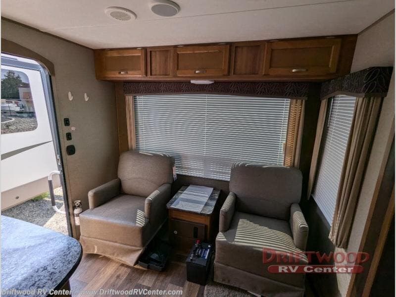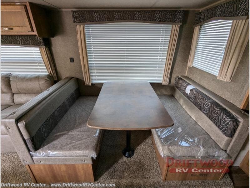 Opposite there is a jack knife sofa with overhead storage, and u-shaped dinette slide out. An entertainment center is next to the slide for easy viewing from any seat in the living/kitchen combined space.