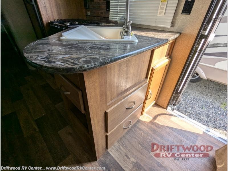 Step inside and notice the two recliners and center end table along the rear wall of the trailer. To your right is the Summerland kitchen featuring an angled countertop with a large sink, three burner range, and refrigerator.