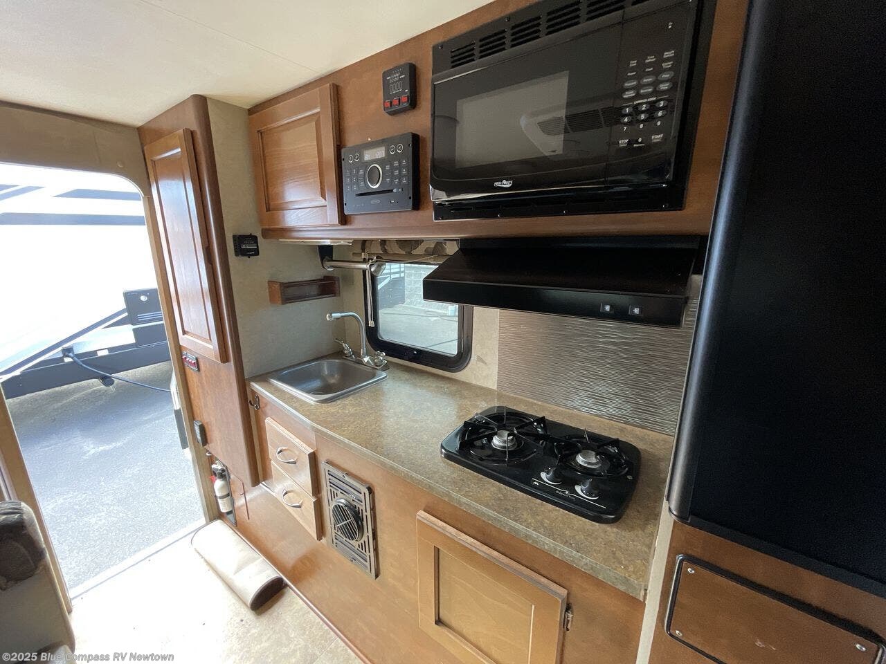 Along the left, side just inside the door, you will find a large wardrobe for storage, a kitchen sink, some counter space, a two burner stove top, and refrigerator. You can also add an optional microwave oven for cooking convenience if you like.