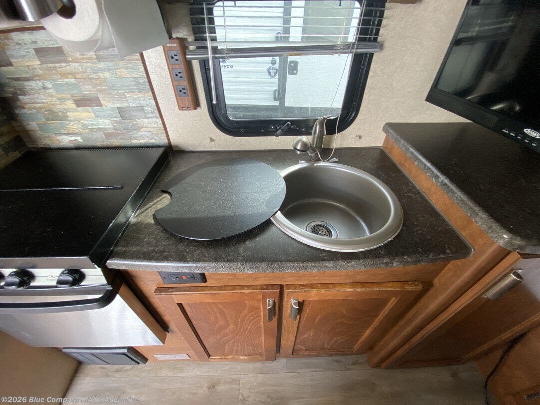 When it's time to sit and relax, or grab a bite to eat, the dual swivel rockers with table between may become your favorite spot in the trailer. You are sure to enjoy the overhead cabinets as well for all of your storage needs.