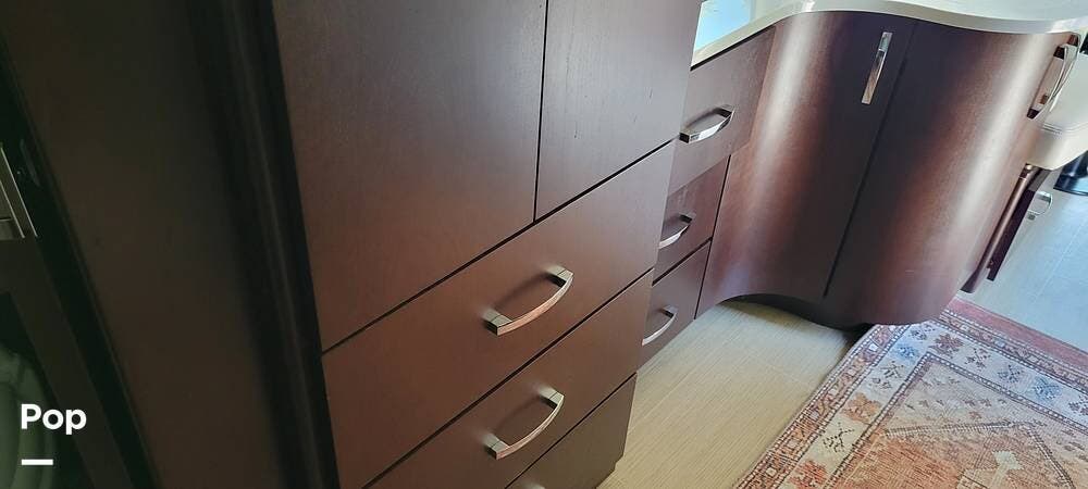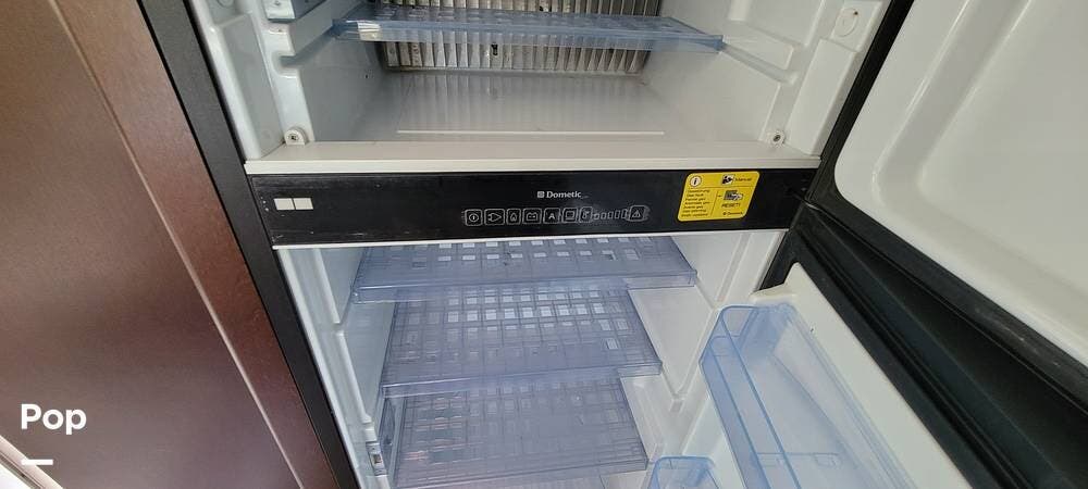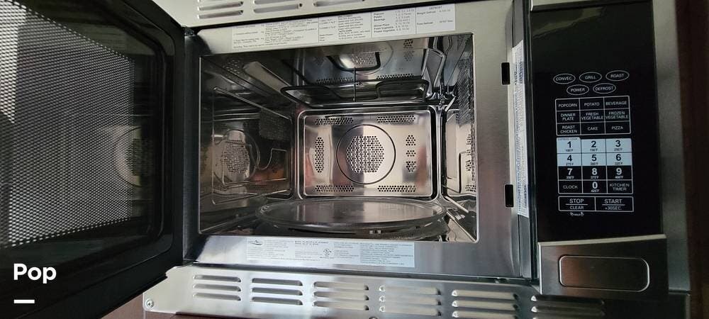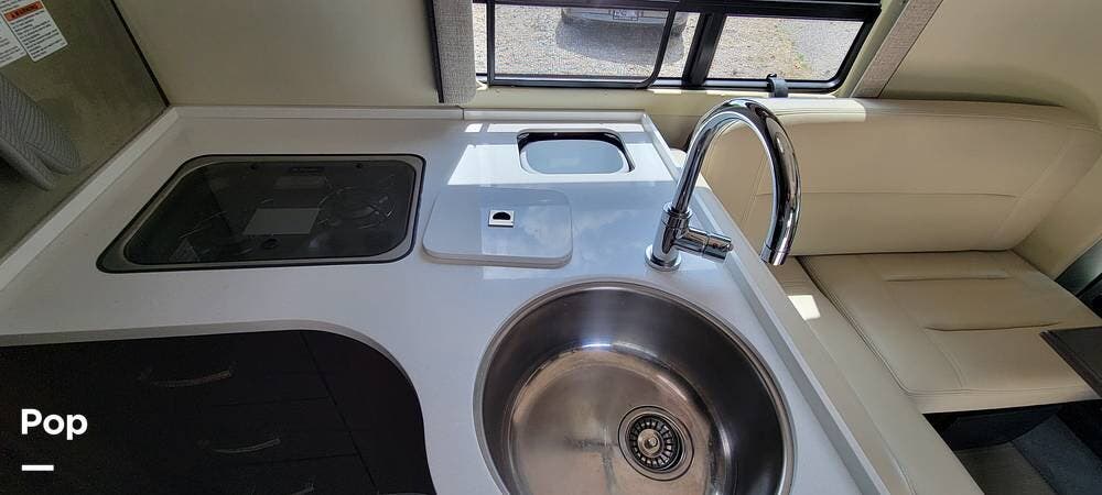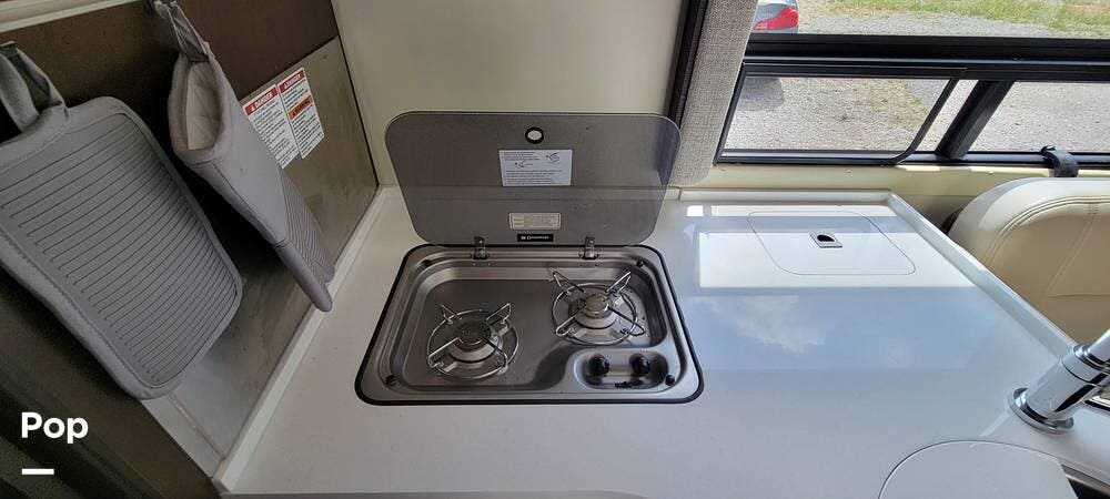 The galley is fully functional, featuring a two-burner gas stove with a built-in cooktop cover, a round kitchen sink and cover, a microwave/convection oven, a large refrigerator/freezer unit, and pantry cabinet space.