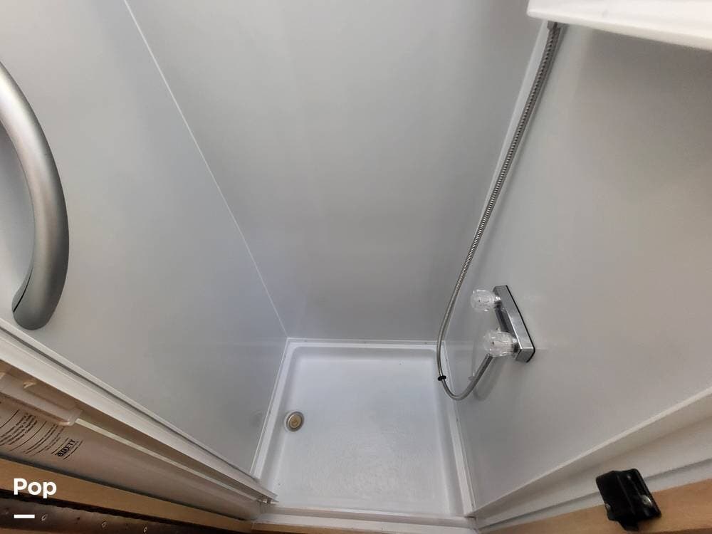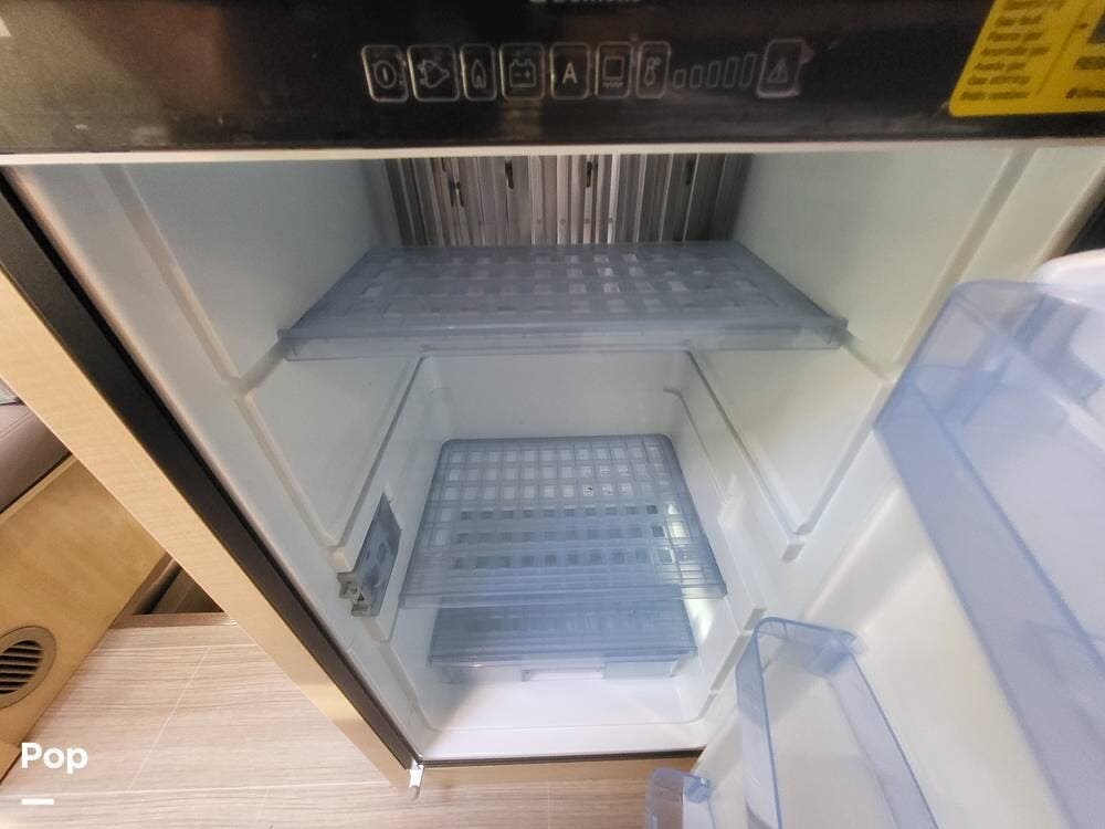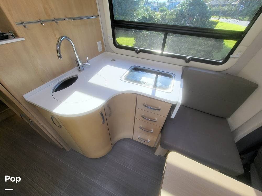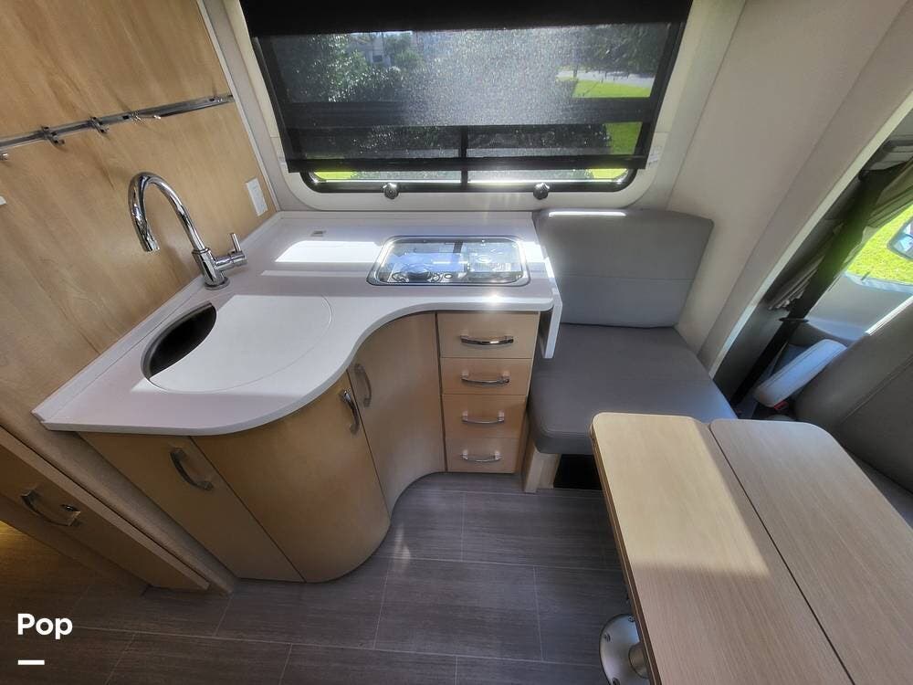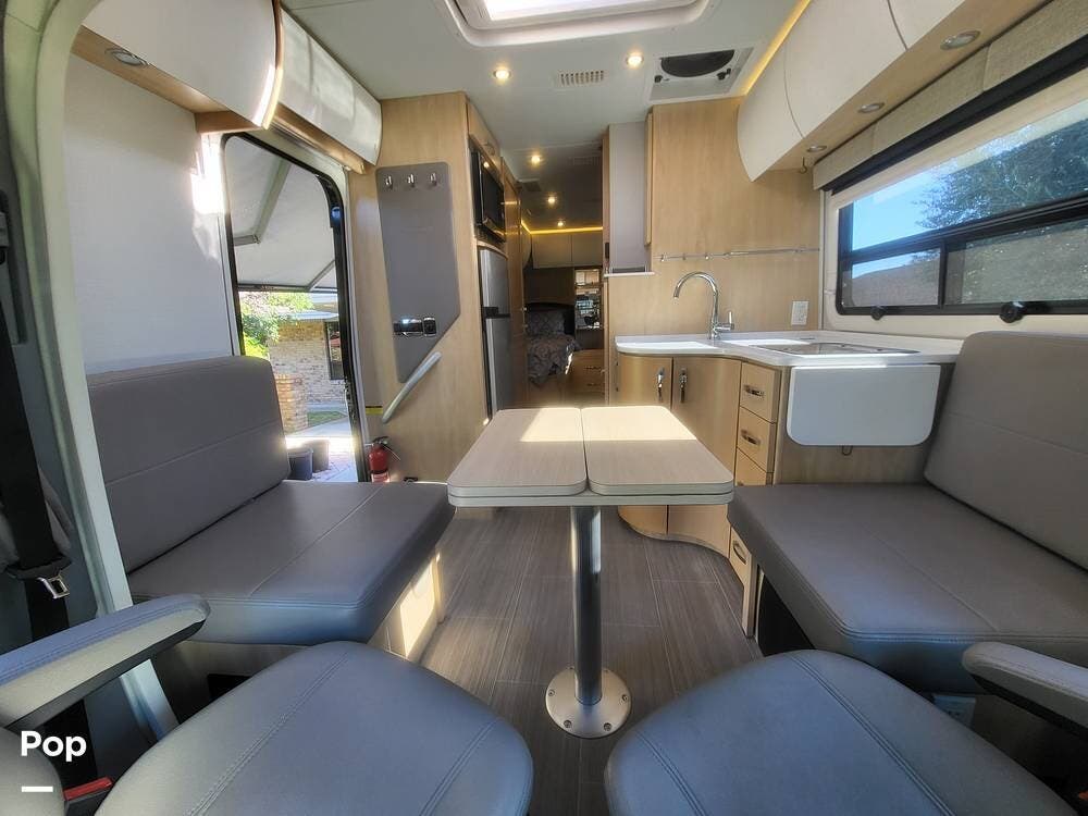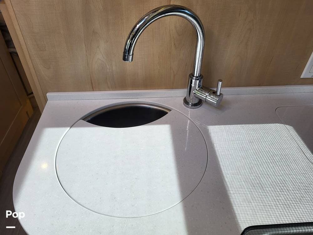 The galley feels surprisingly generous for a compact RV, offering a large sink, a convection microwave, a gas cooktop, and a well-sized refrigerator/freezer, all arranged to make meal preparation easy and enjoyable. The dining area features a large convertible table that comfortably seats up to four, making it an excellent space for meals, card games, or remote work. Toward the rear is a private bathroom equipped with a macerator toilet and a separate shower, with a Truma instant hot water heater, offering the convenience and functionality of a much larger coach.