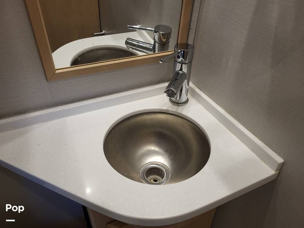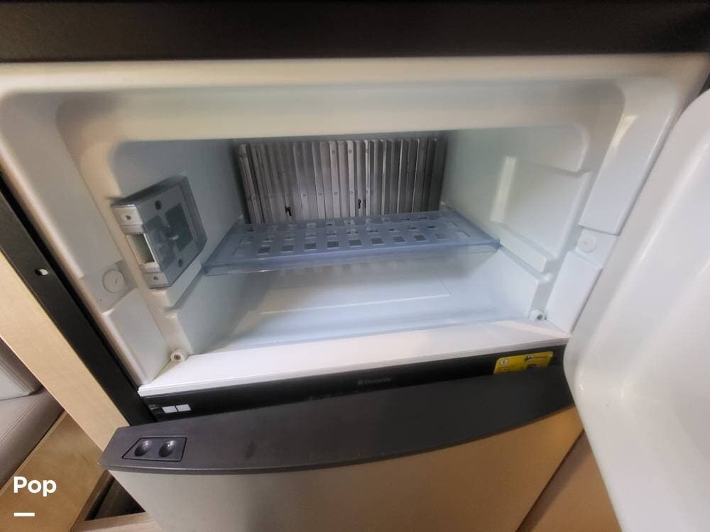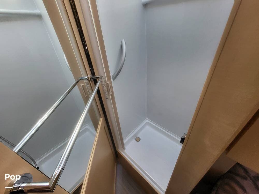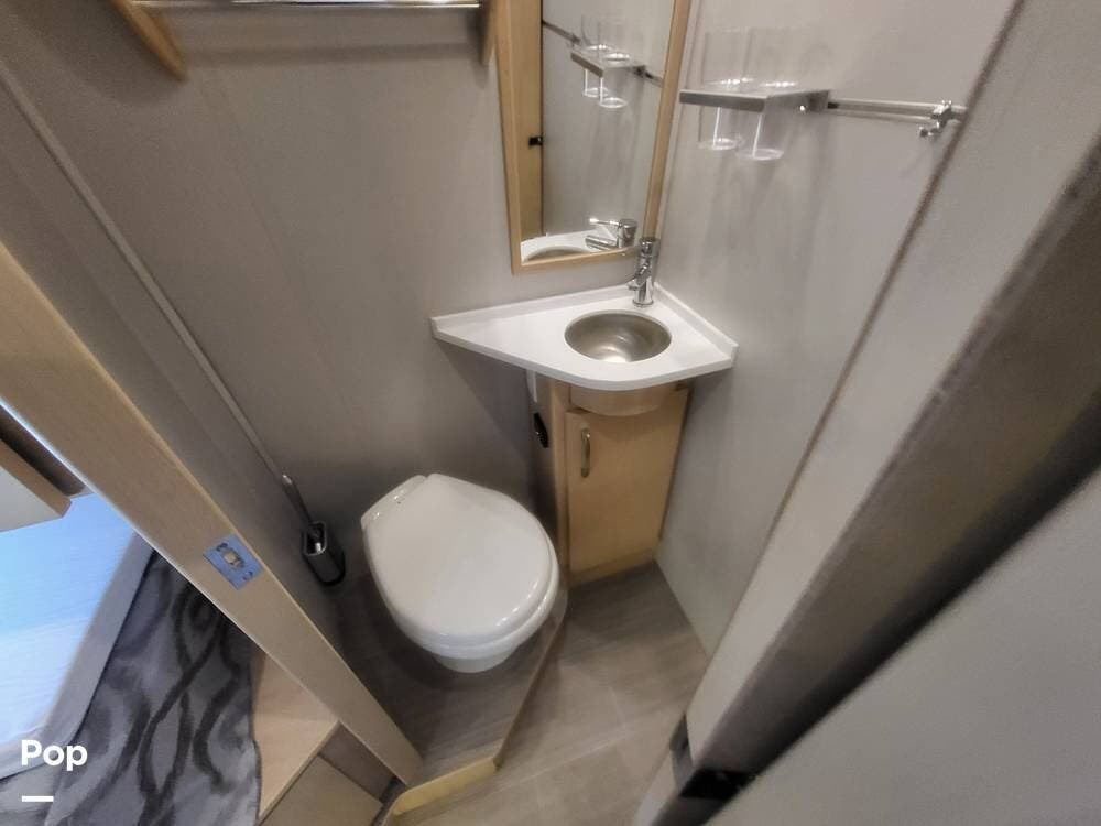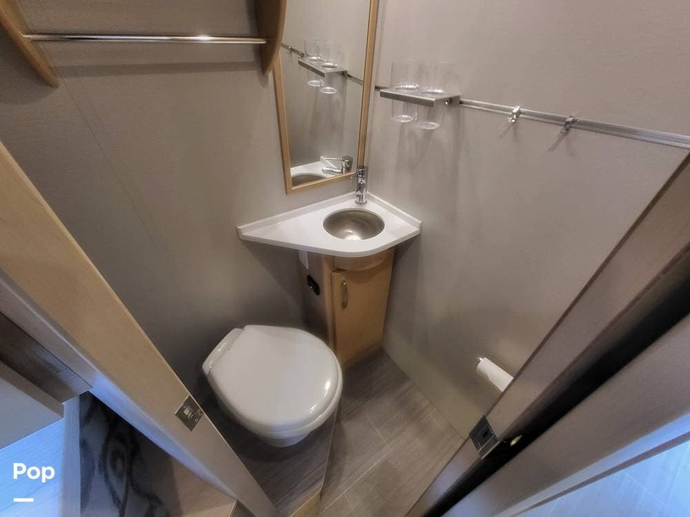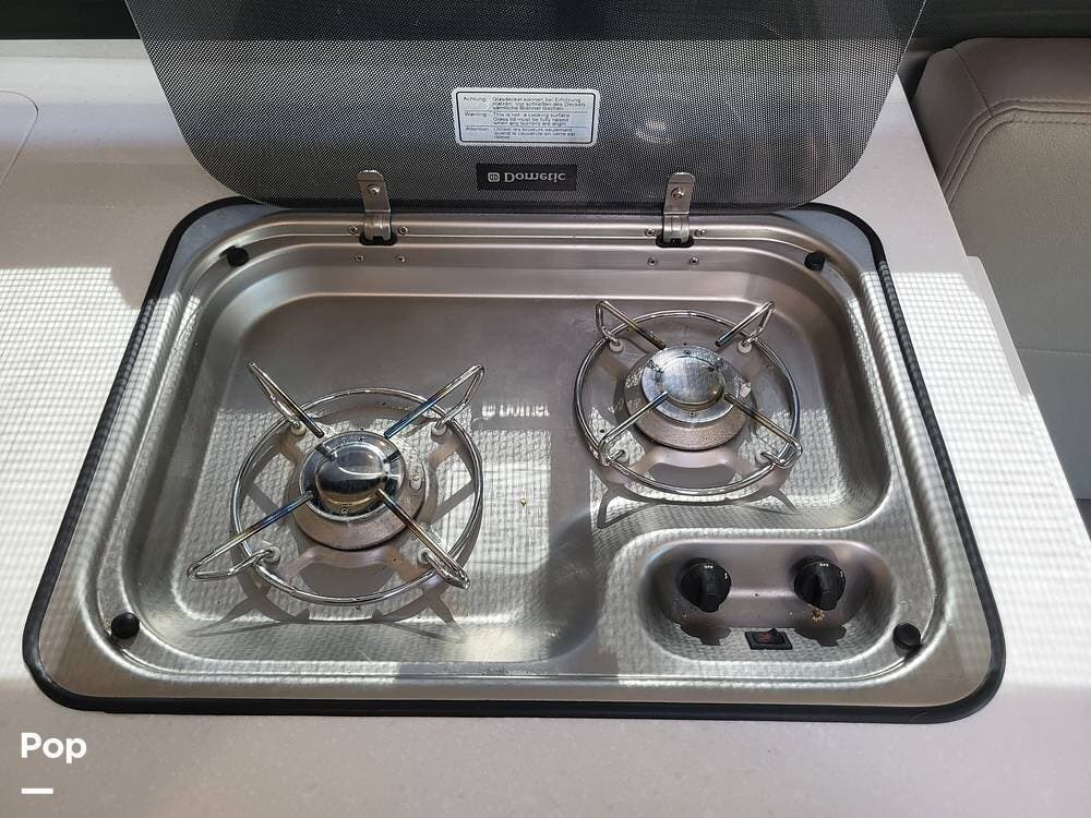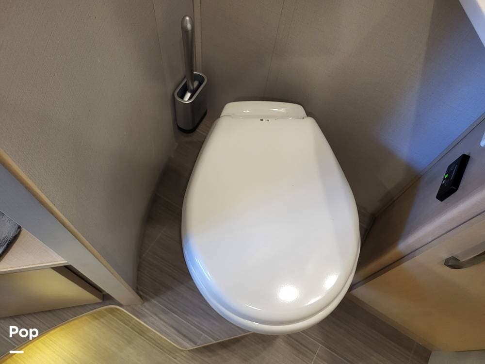 The galley feels surprisingly generous for a compact RV, offering a large sink, a convection microwave, a gas cooktop, and a well-sized refrigerator/freezer, all arranged to make meal preparation easy and enjoyable. The dining area features a large convertible table that comfortably seats up to four, making it an excellent space for meals, card games, or remote work. Toward the rear is a private bathroom equipped with a macerator toilet and a separate shower, with a Truma instant hot water heater, offering the convenience and functionality of a much larger coach.