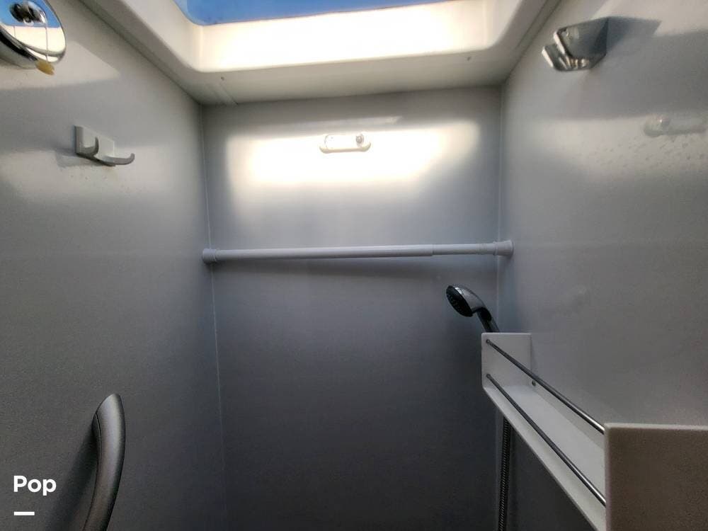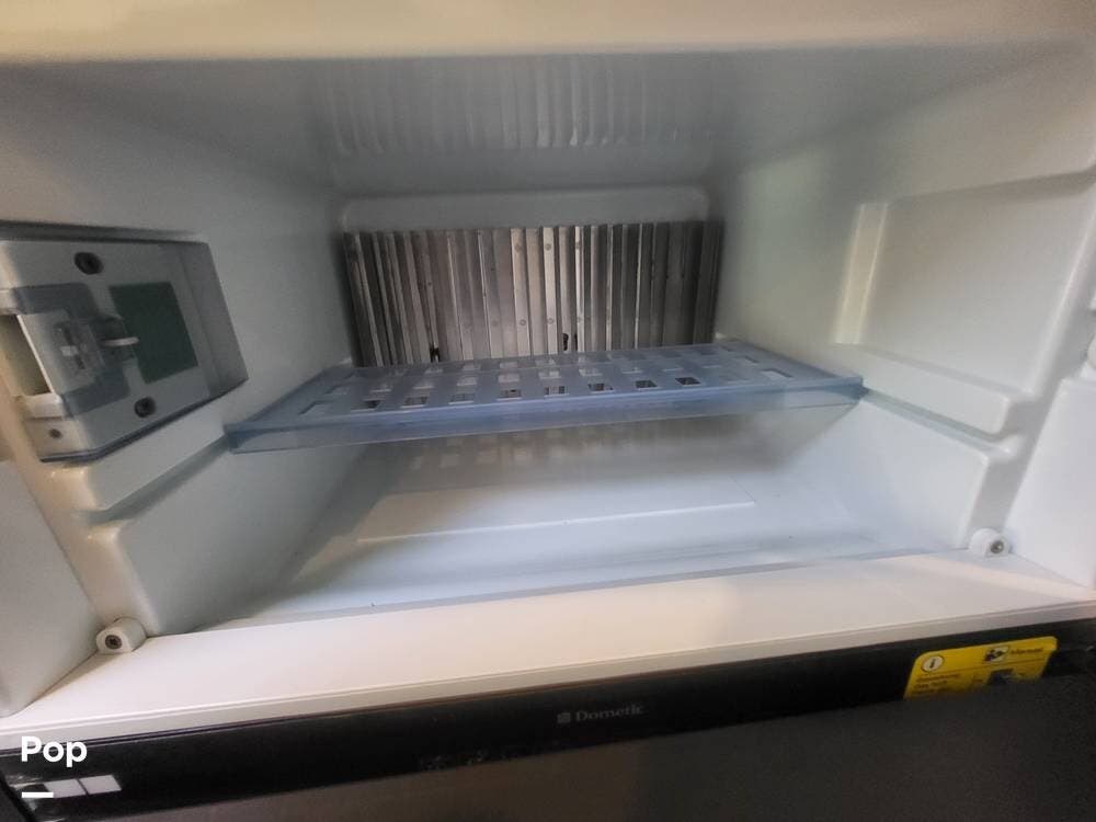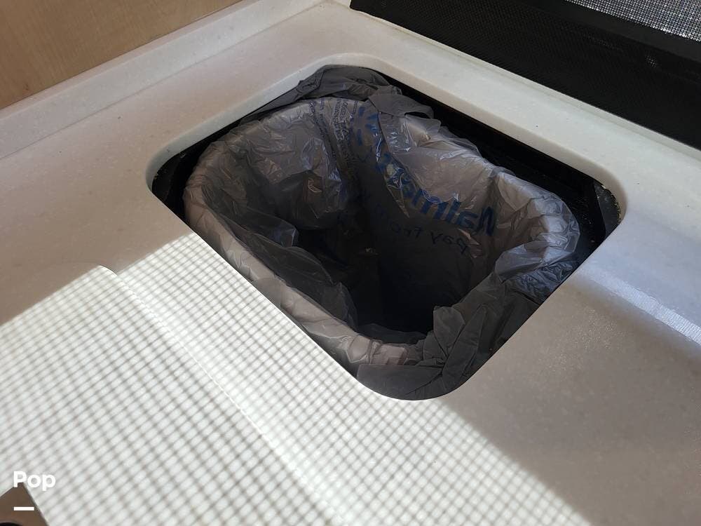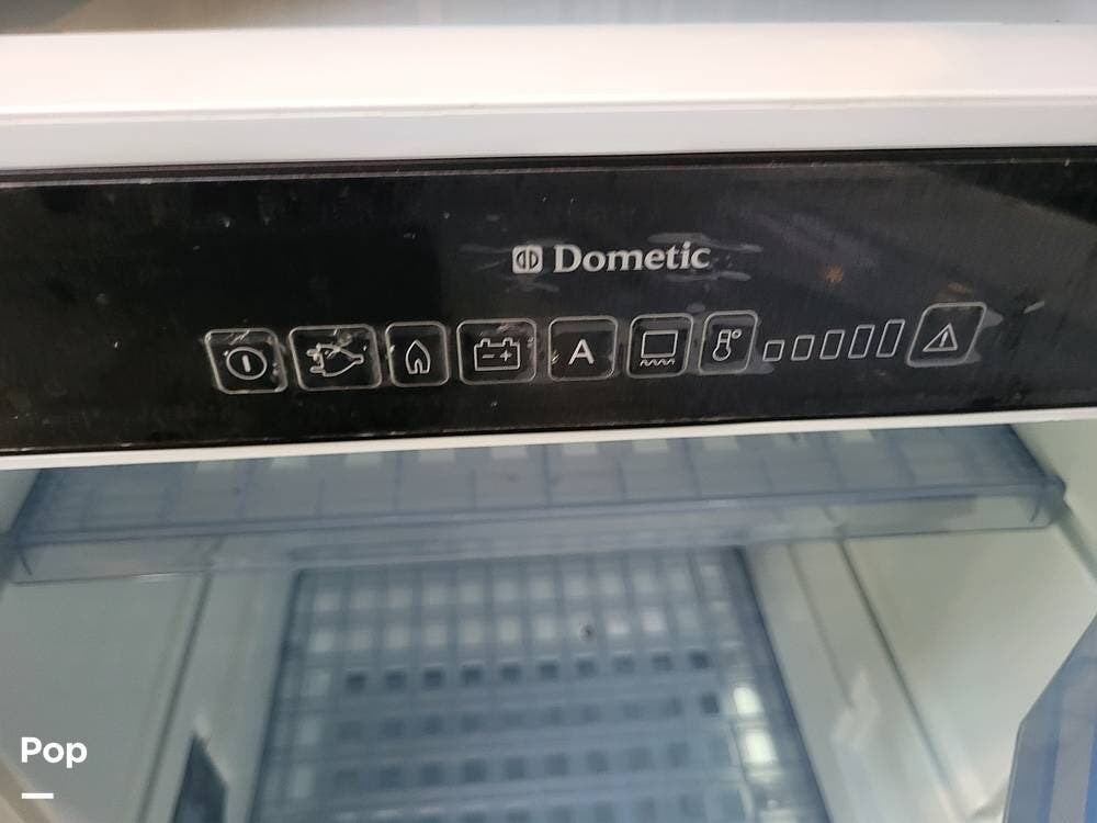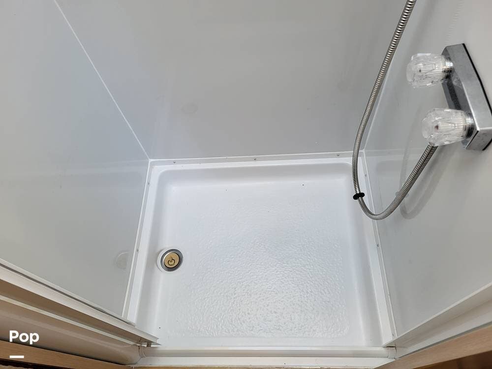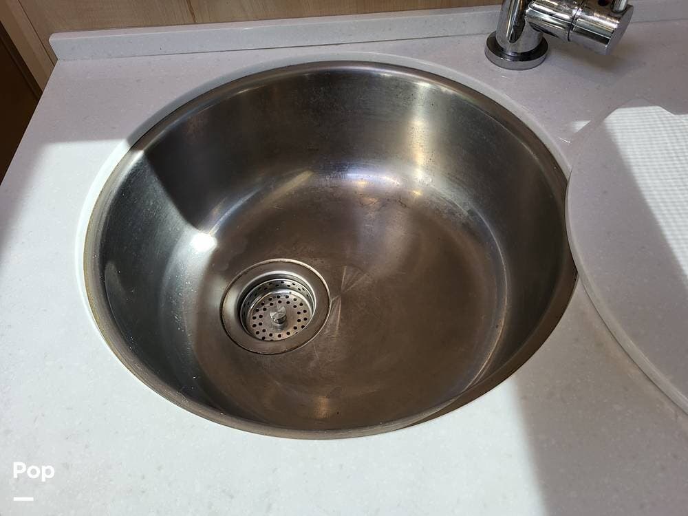 The galley feels surprisingly generous for a compact RV, offering a large sink, a convection microwave, a gas cooktop, and a well-sized refrigerator/freezer, all arranged to make meal preparation easy and enjoyable. The dining area features a large convertible table that comfortably seats up to four, making it an excellent space for meals, card games, or remote work. Toward the rear is a private bathroom equipped with a macerator toilet and a separate shower, with a Truma instant hot water heater, offering the convenience and functionality of a much larger coach.