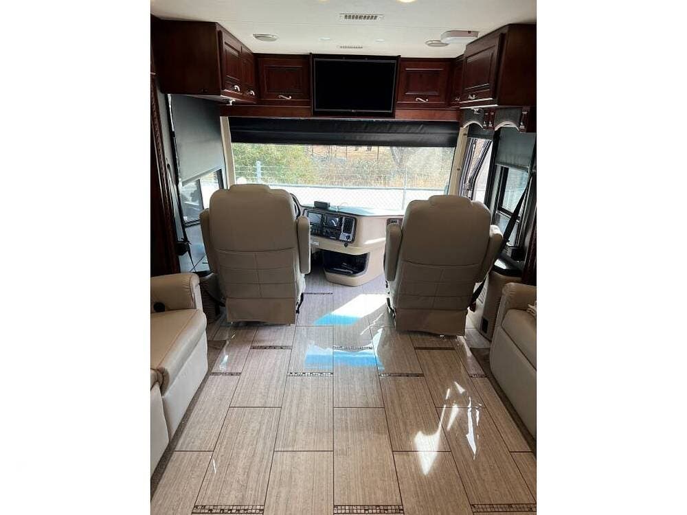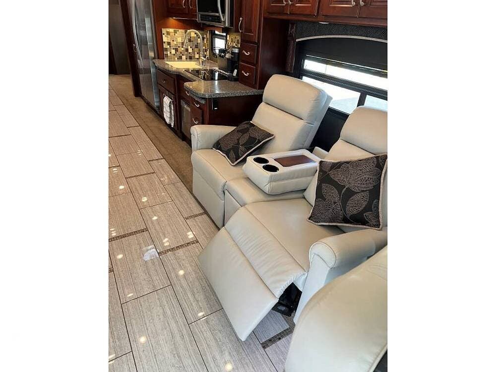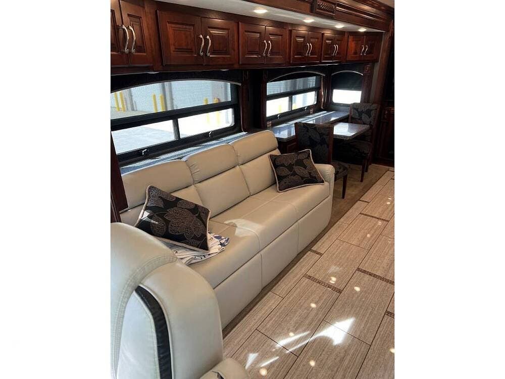 Entering the cockpit, there are leather captain's chairs and an advanced dash powered by a 450 hp Cummins engine on the Roadmaster XC chassis.
