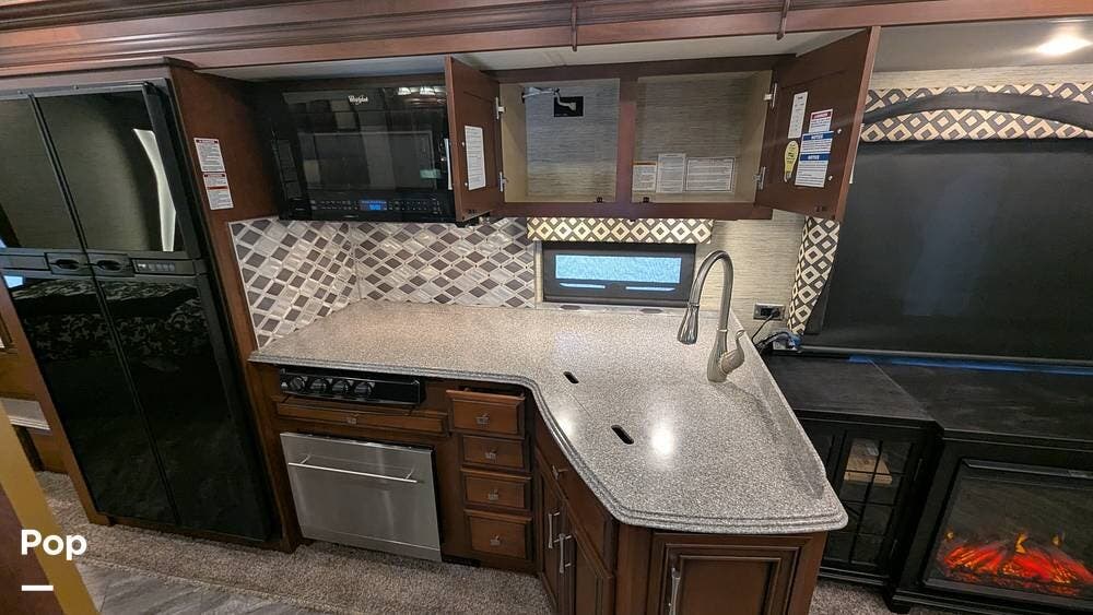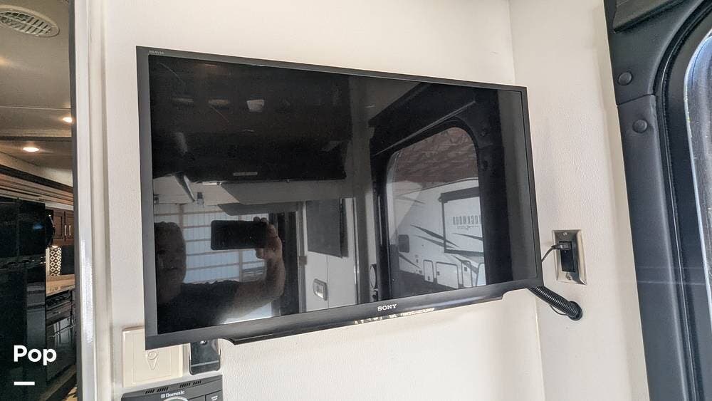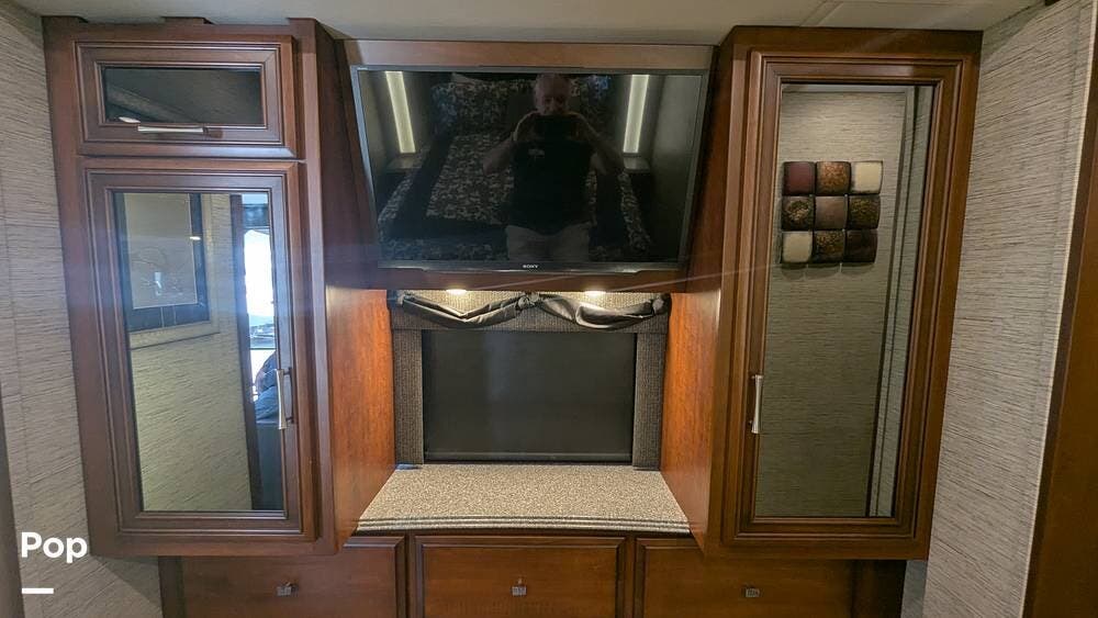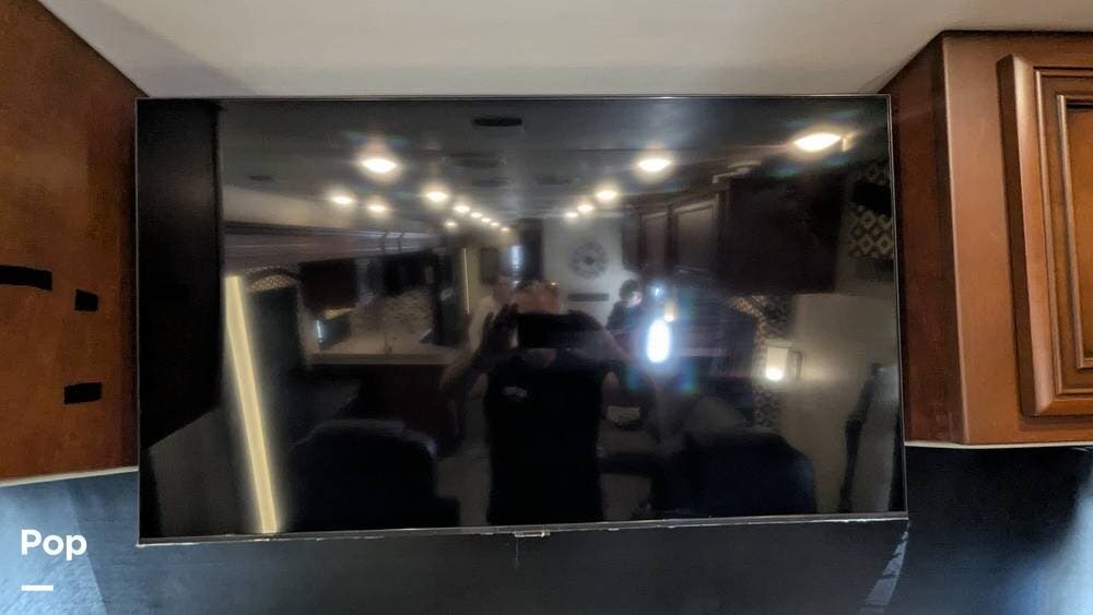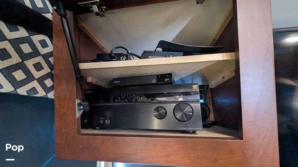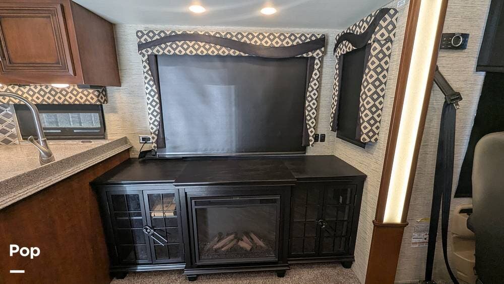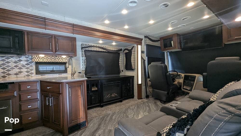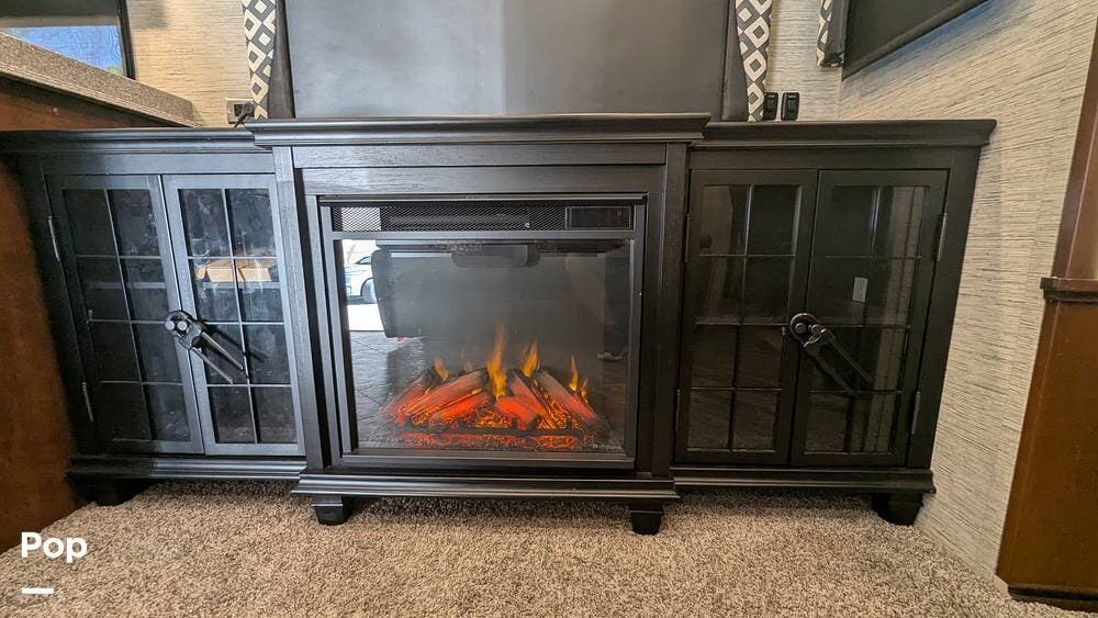 This coach also boasts four televisions, one of which is located above the fireplace, including an exterior TV with exterior speakers for tailgating with all your friends on game day. It also features a nice-sized awning to get out of the sun.