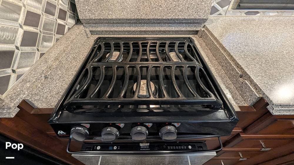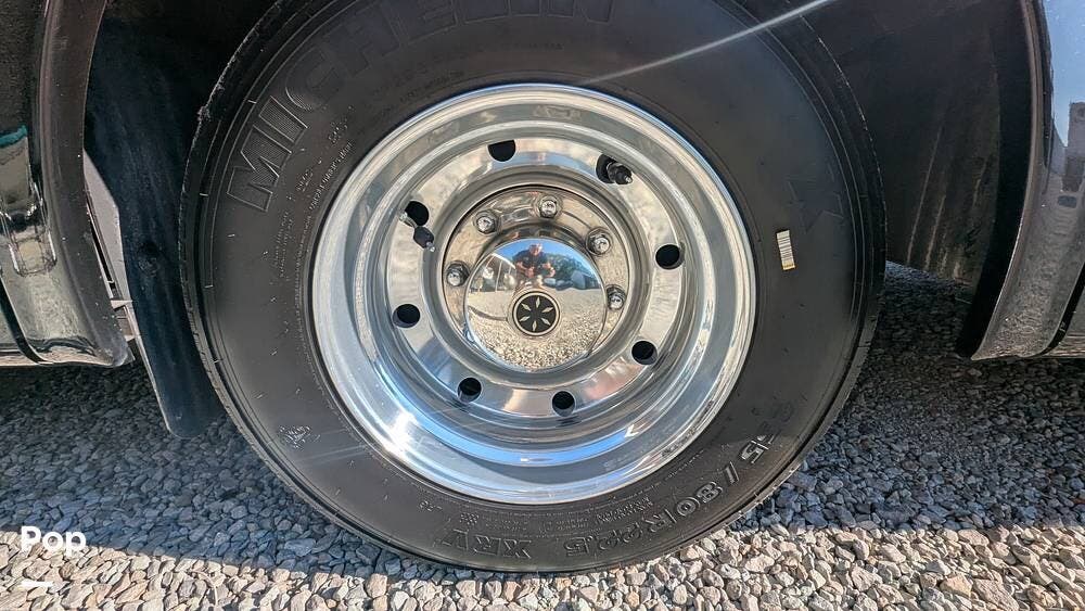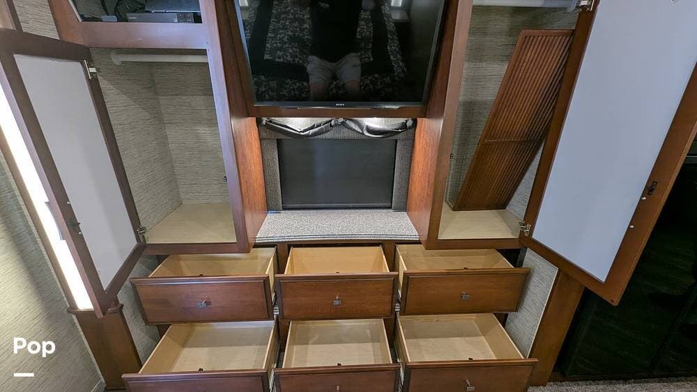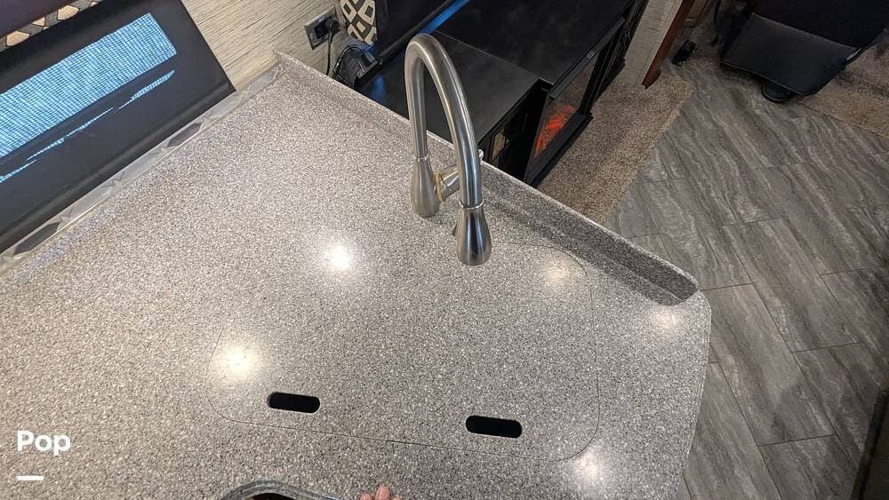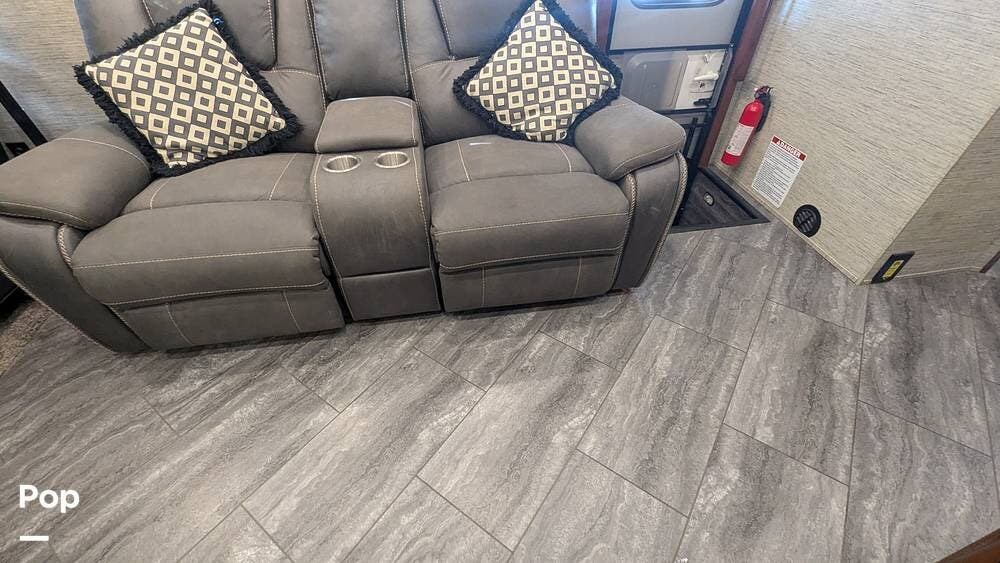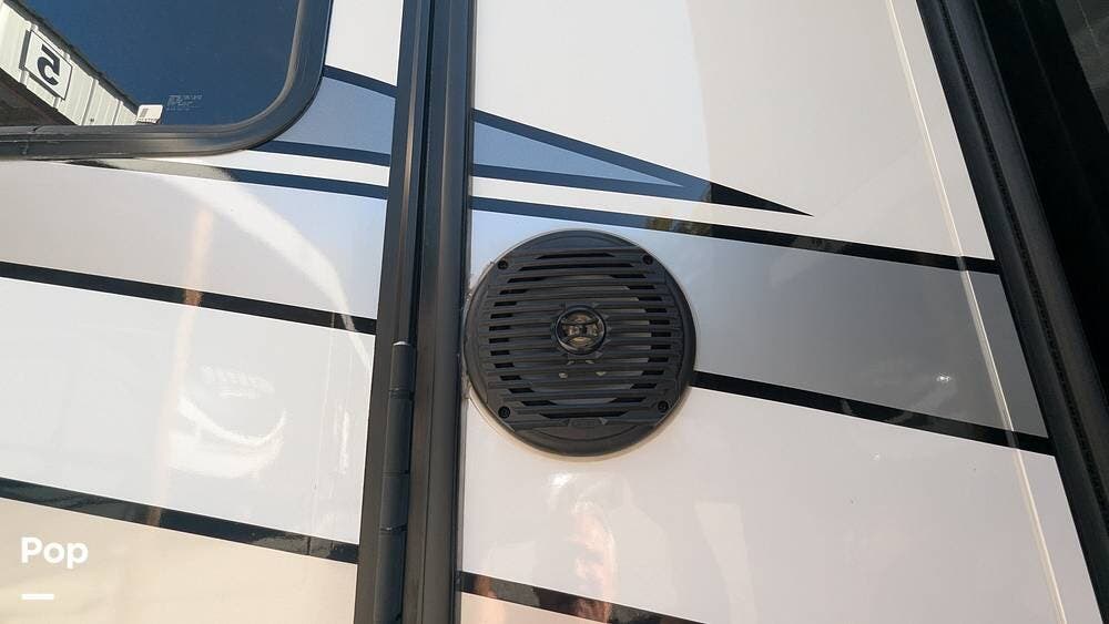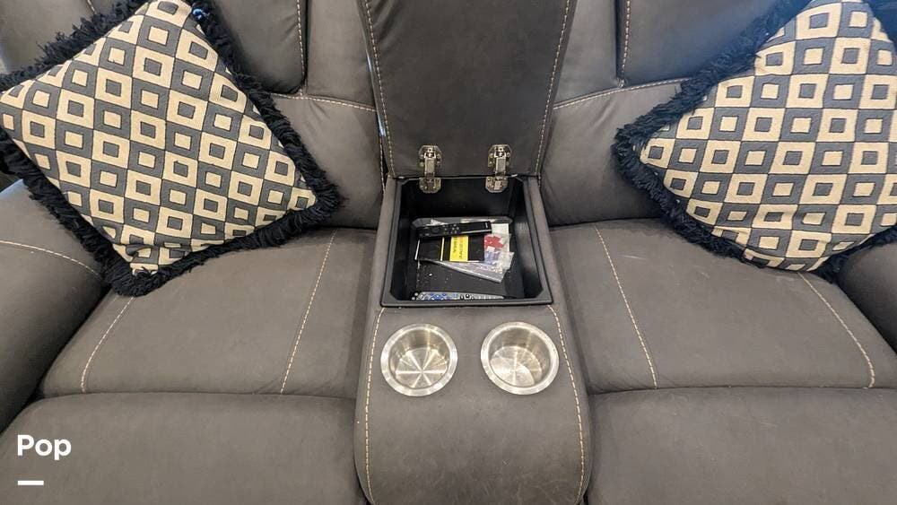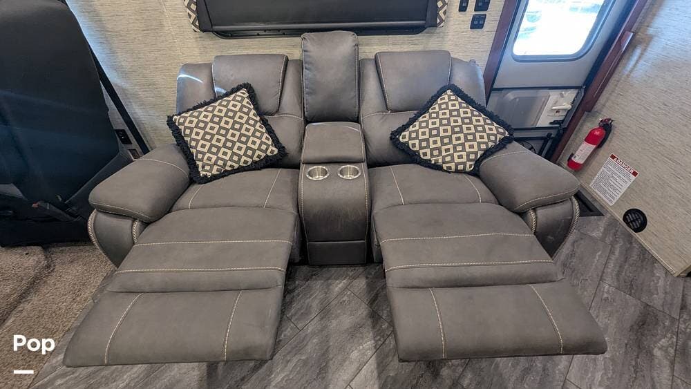 This coach also boasts four televisions, one of which is located above the fireplace, including an exterior TV with exterior speakers for tailgating with all your friends on game day. It also features a nice-sized awning to get out of the sun.