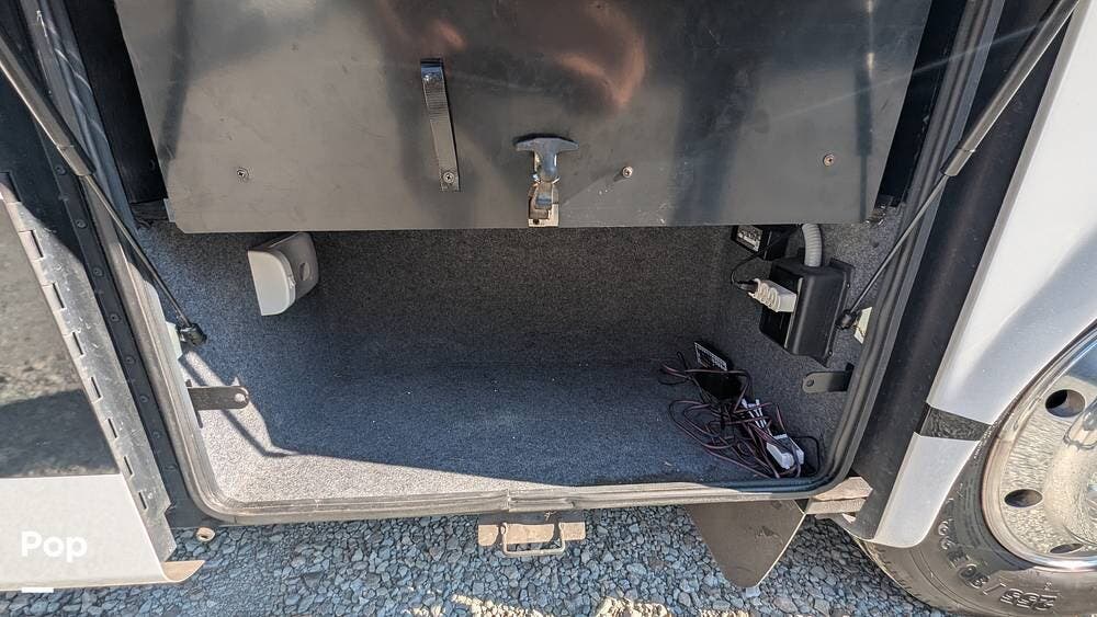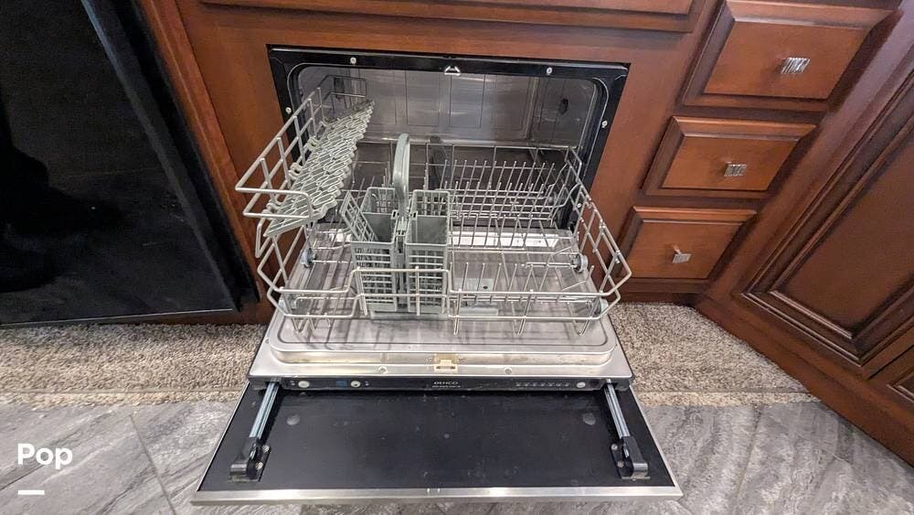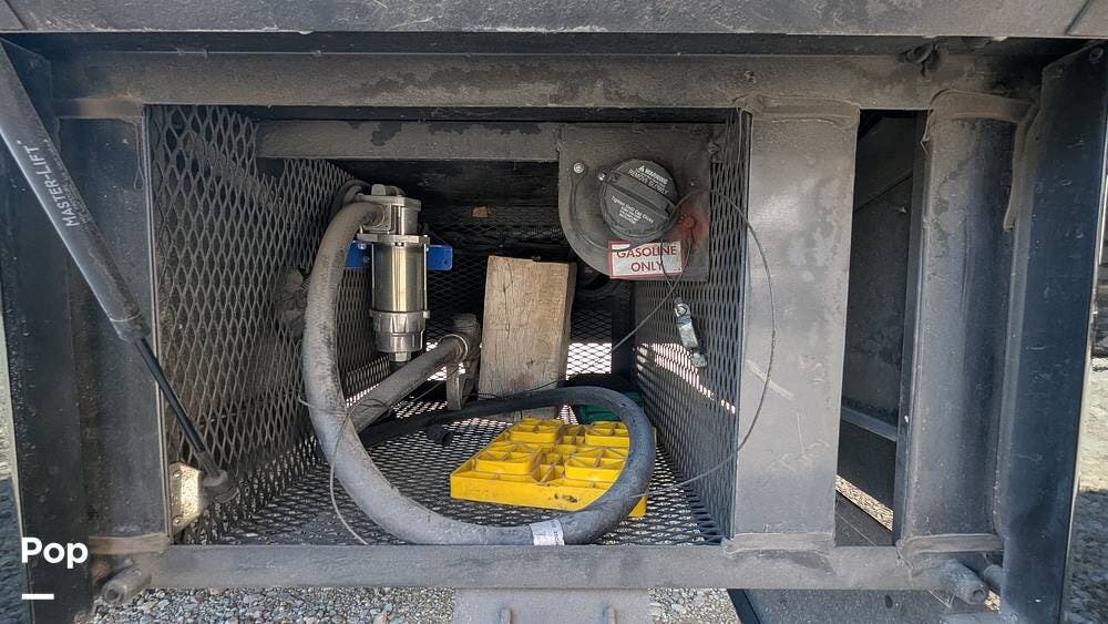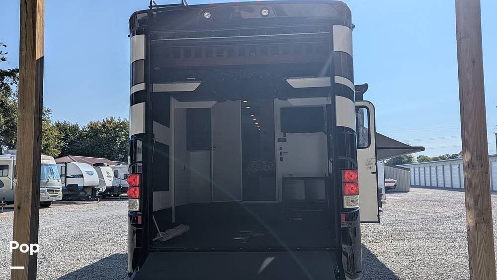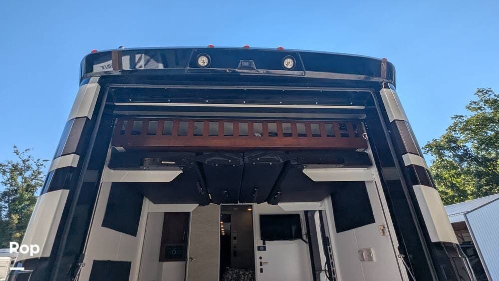 In the rear is a 10-foot garage with a fold-down ramp for all your toys, including tie-downs to secure them. When not being used for toys, it has 2 queen sized drop-down beds and/or Bench's and a dining table. There is also a TV, stereo, and speakers that operate in the garage area, as well as a separate entrance. There is also a fuel tank in the rear for the toys.