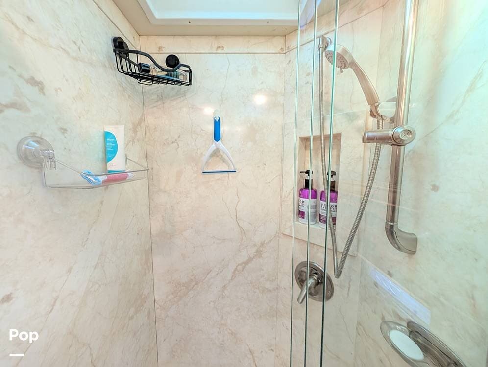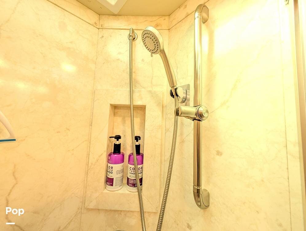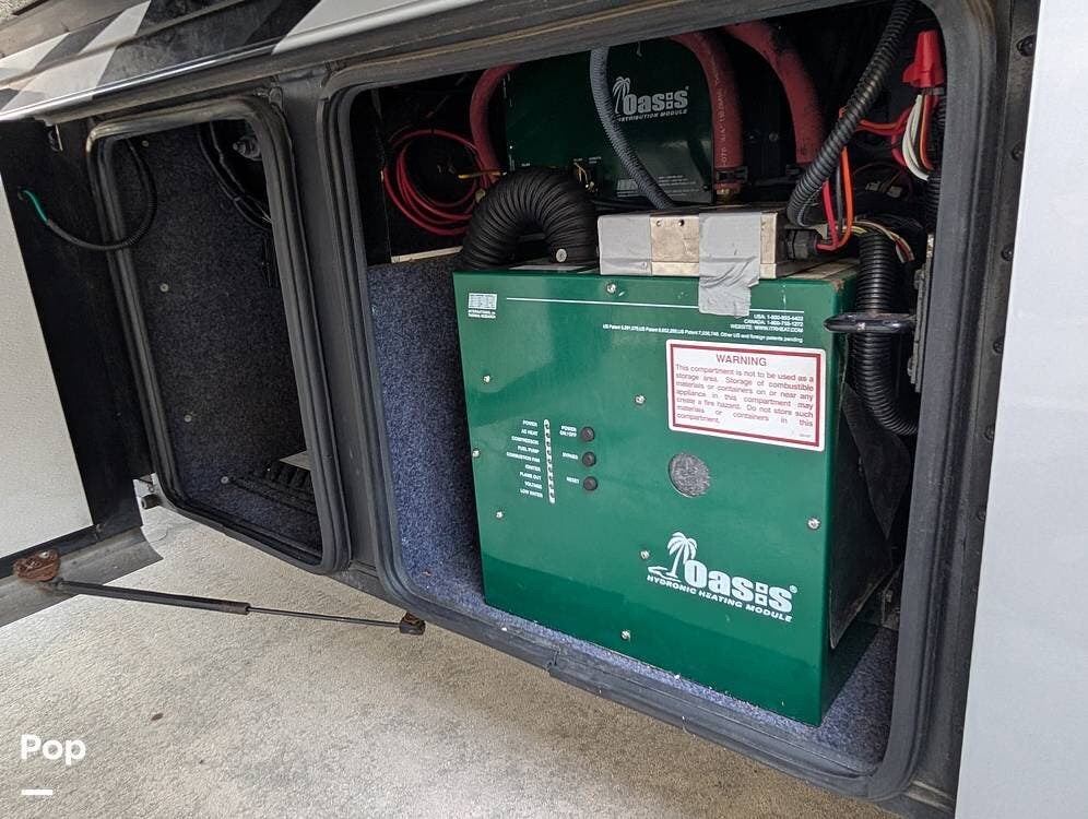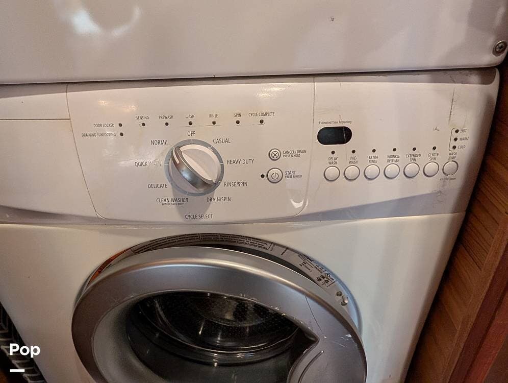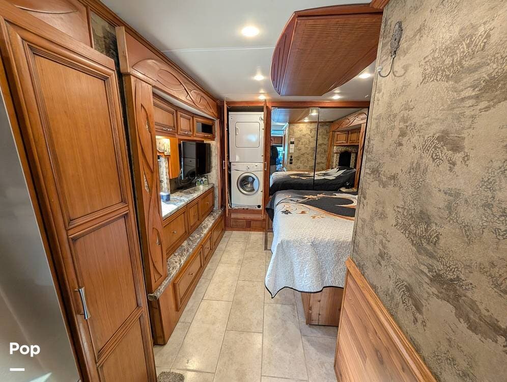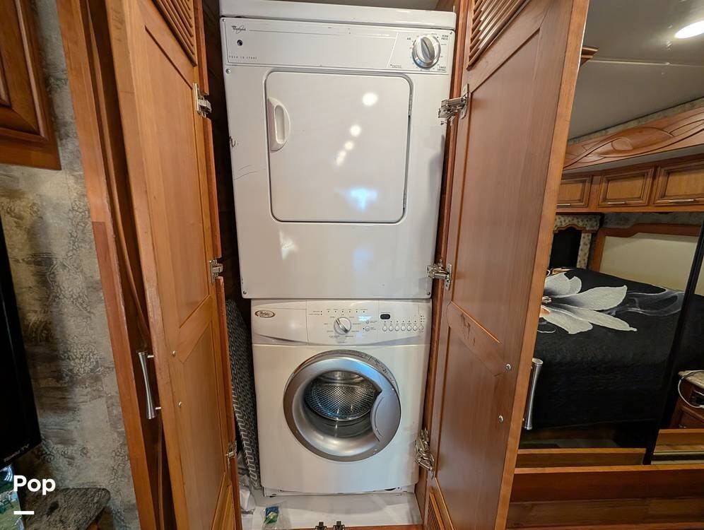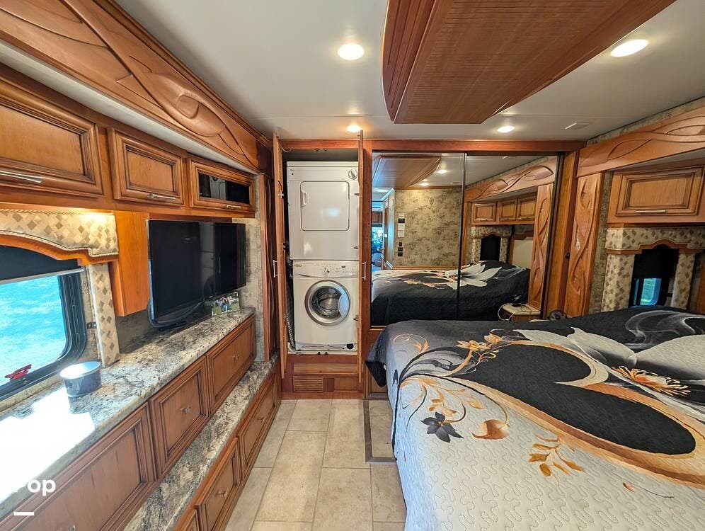 The master suite is a private and comfortable retreat, featuring a queen bed, a huge closet, ample drawer space, and its own television. The bathroom is well appointed and supported by the Oasis hydronic water and coach heating system, which provides quiet, efficient heat and endless hot water for added luxury and comfort in all seasons. A washer and dryer are also included, making this coach fully self-sufficient for long-term travel.