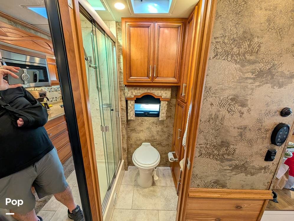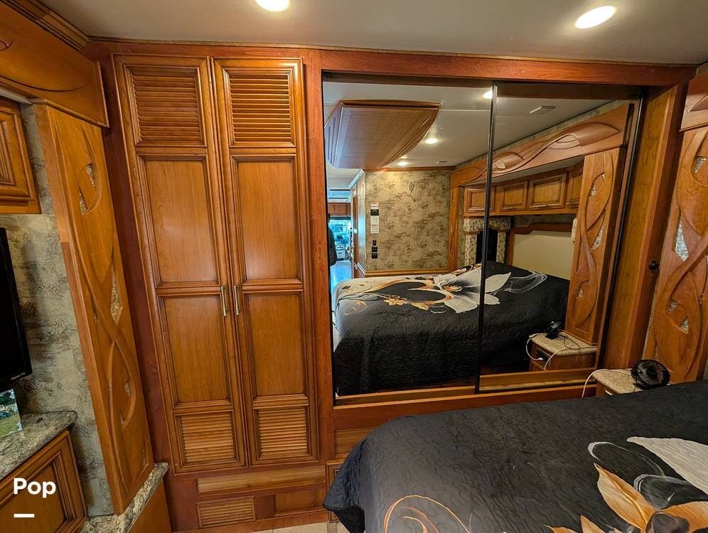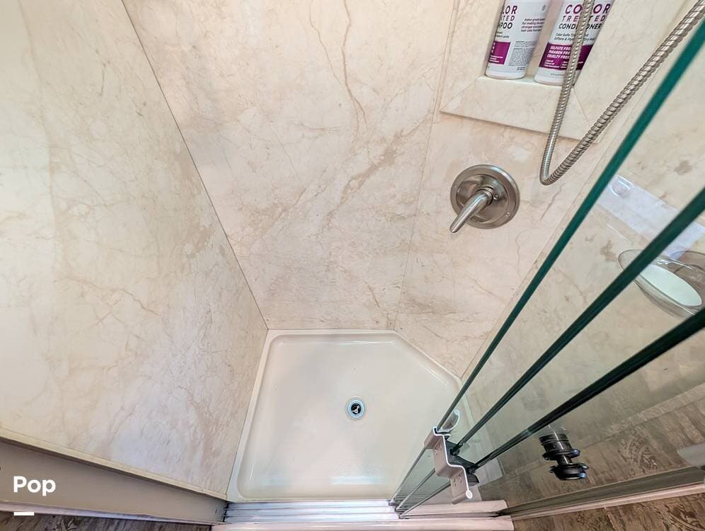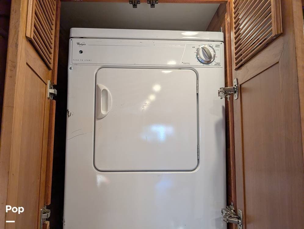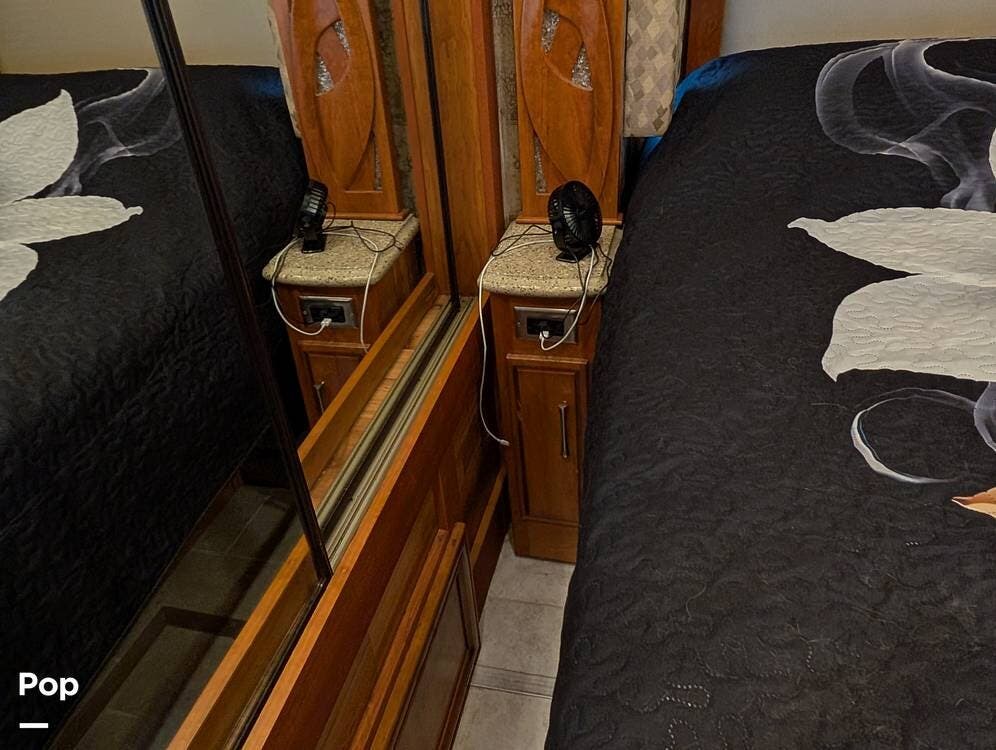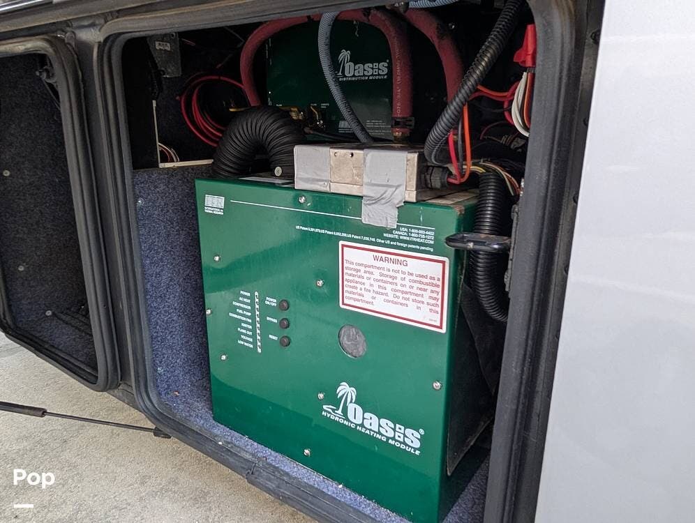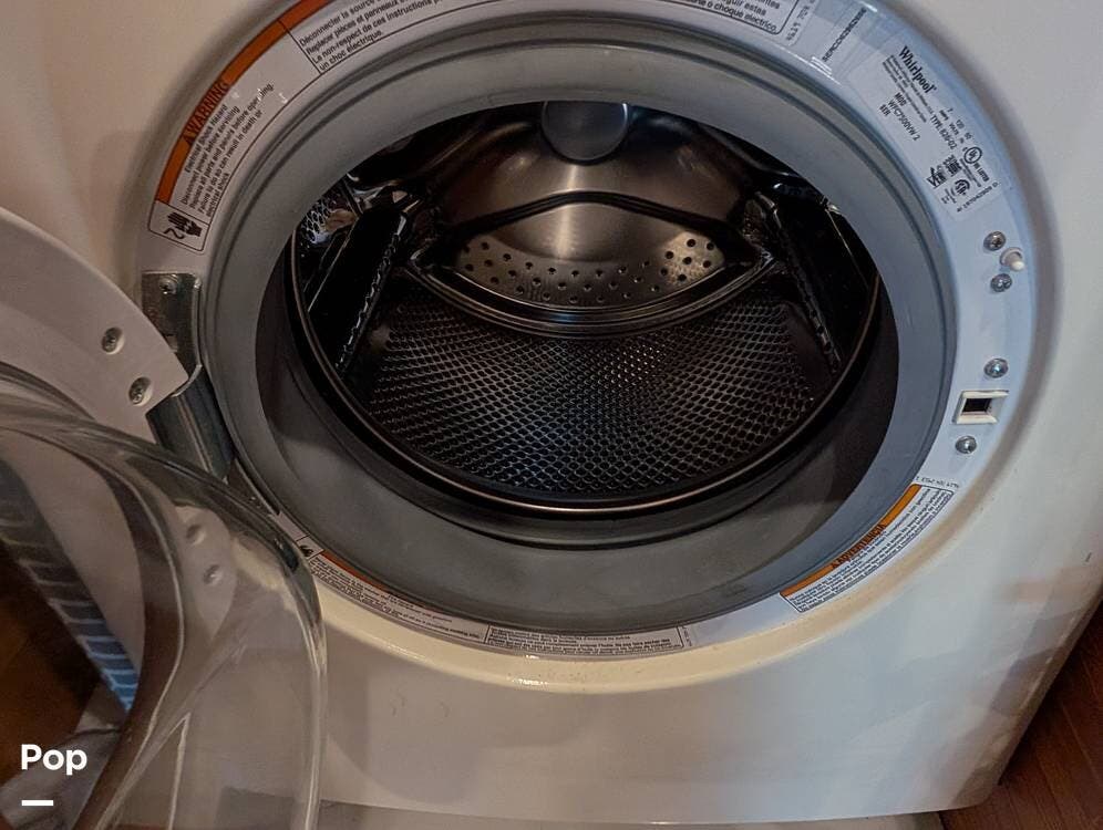 The master suite is a private and comfortable retreat, featuring a queen bed, a huge closet, ample drawer space, and its own television. The bathroom is well appointed and supported by the Oasis hydronic water and coach heating system, which provides quiet, efficient heat and endless hot water for added luxury and comfort in all seasons. A washer and dryer are also included, making this coach fully self-sufficient for long-term travel.