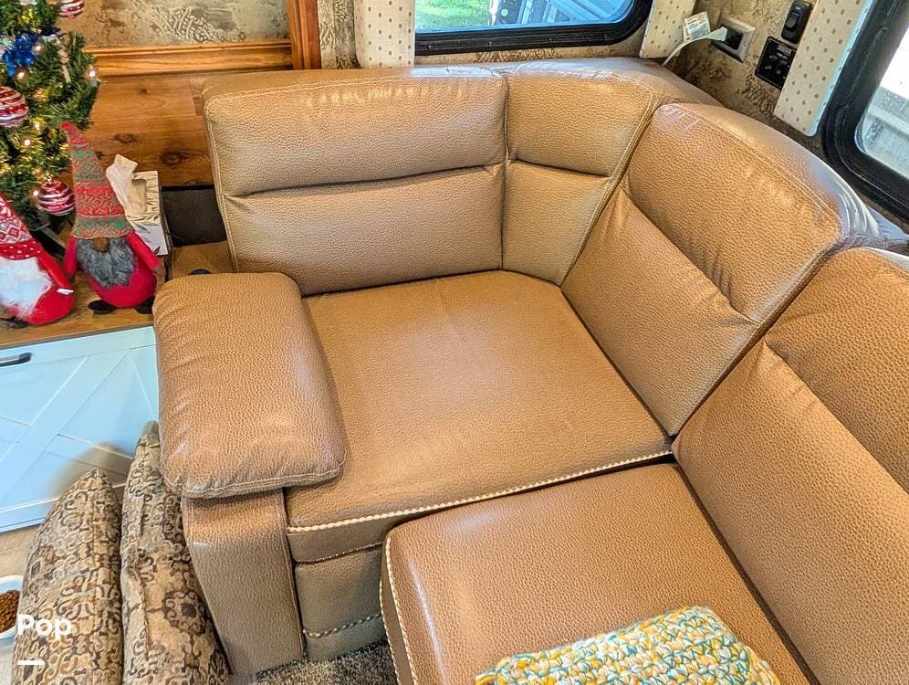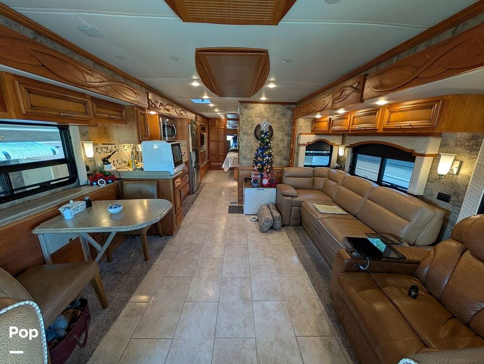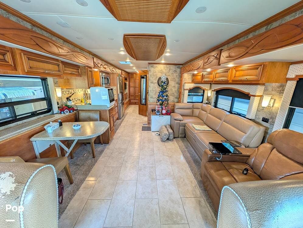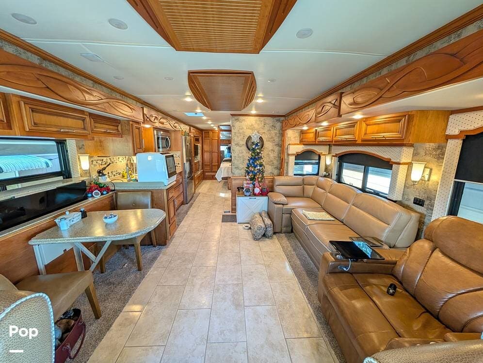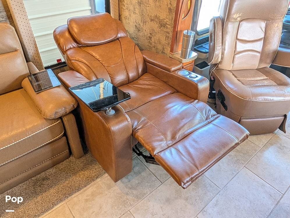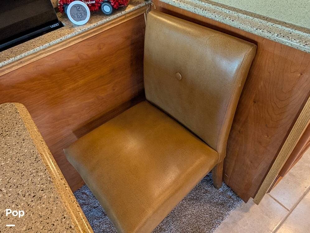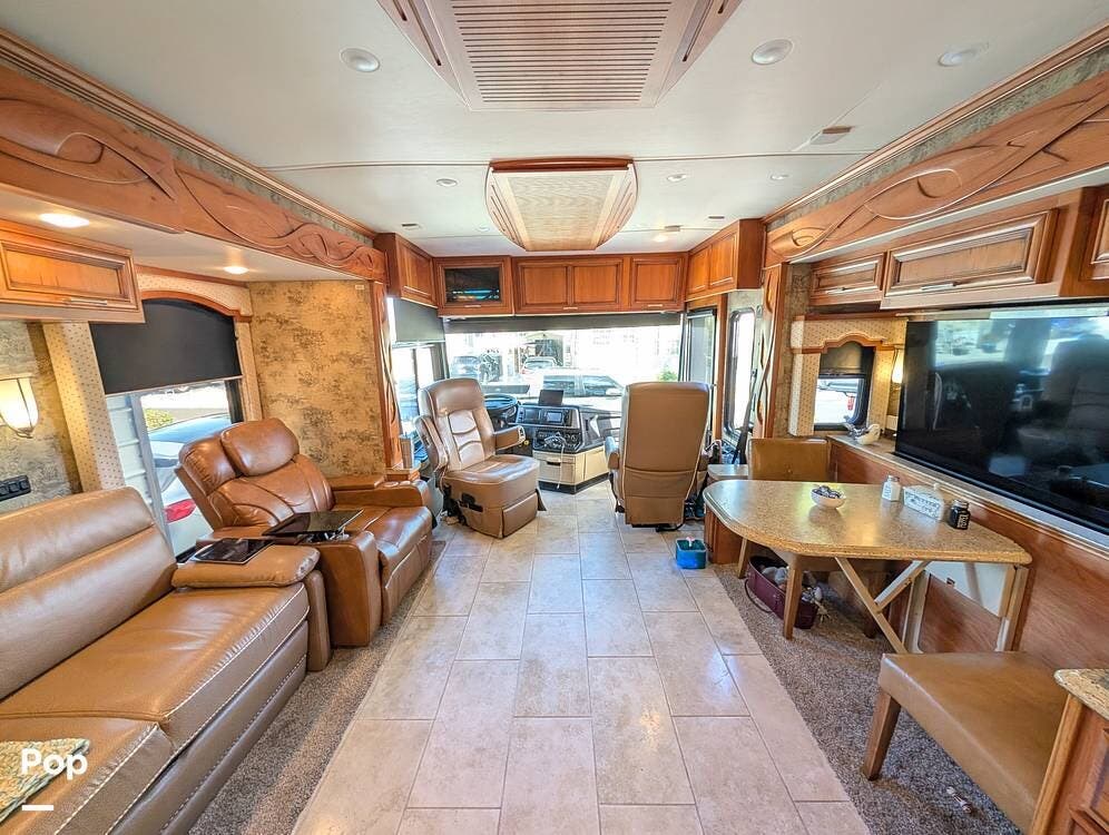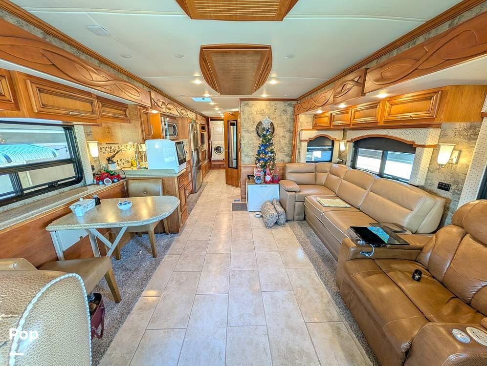 Step inside and you are immediately welcomed by gorgeous maple woodwork throughout the coach, showcasing Newmar's legendary build quality and attention to detail. Elegant tile floors add durability and a high-end residential feel, while large windows fill the space with natural light. The living area is designed for both relaxation and entertaining, featuring a comfortable sectional sofa paired with a separate oversized power recliner. The freestanding dinette provides a flexible dining or workspace option and includes a clever "Televator" that rises smoothly for easy viewing and tucks away when not in use.