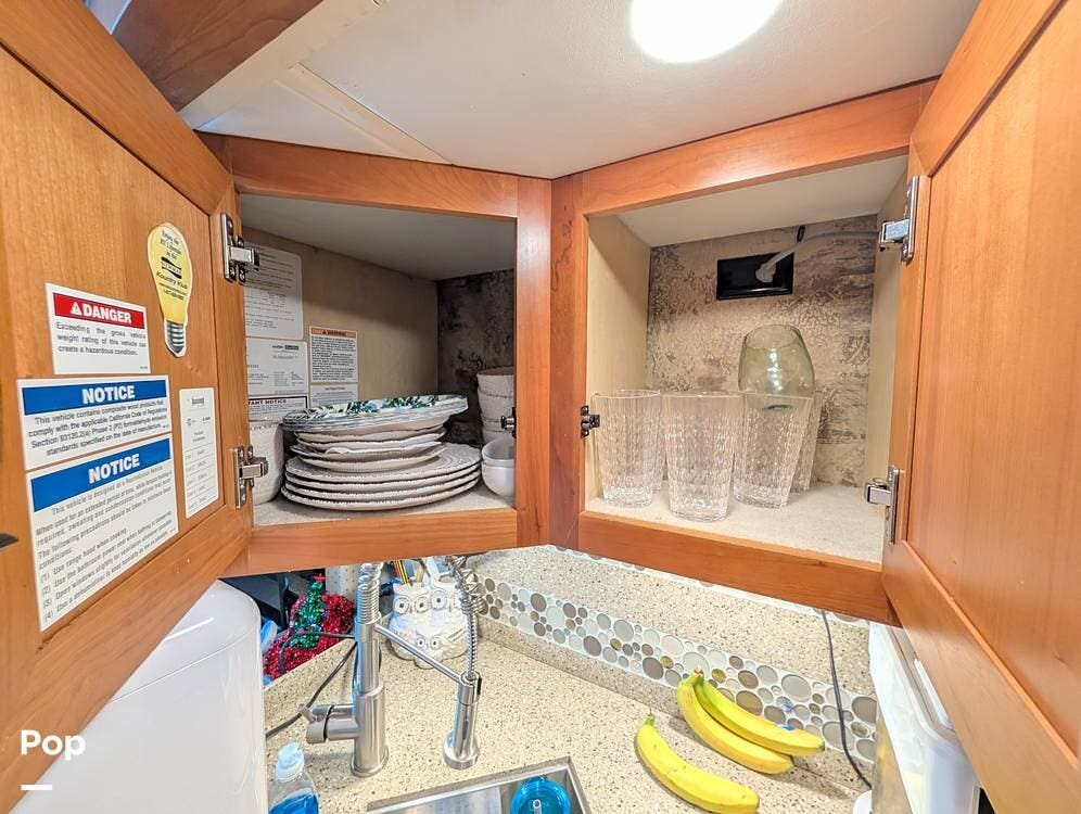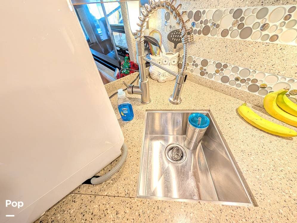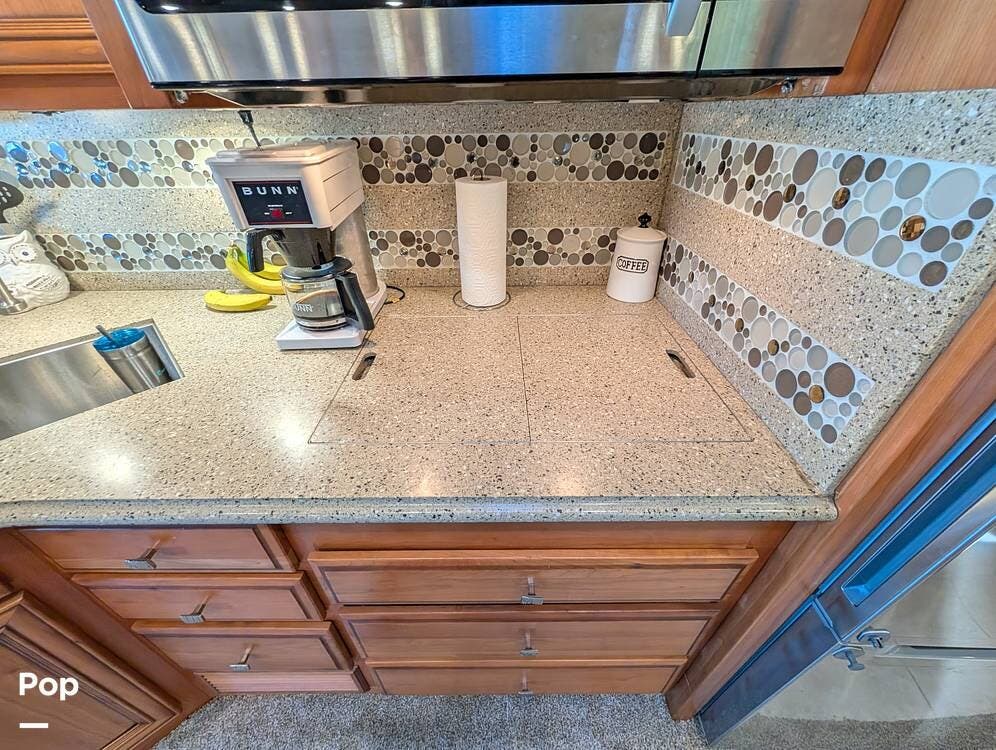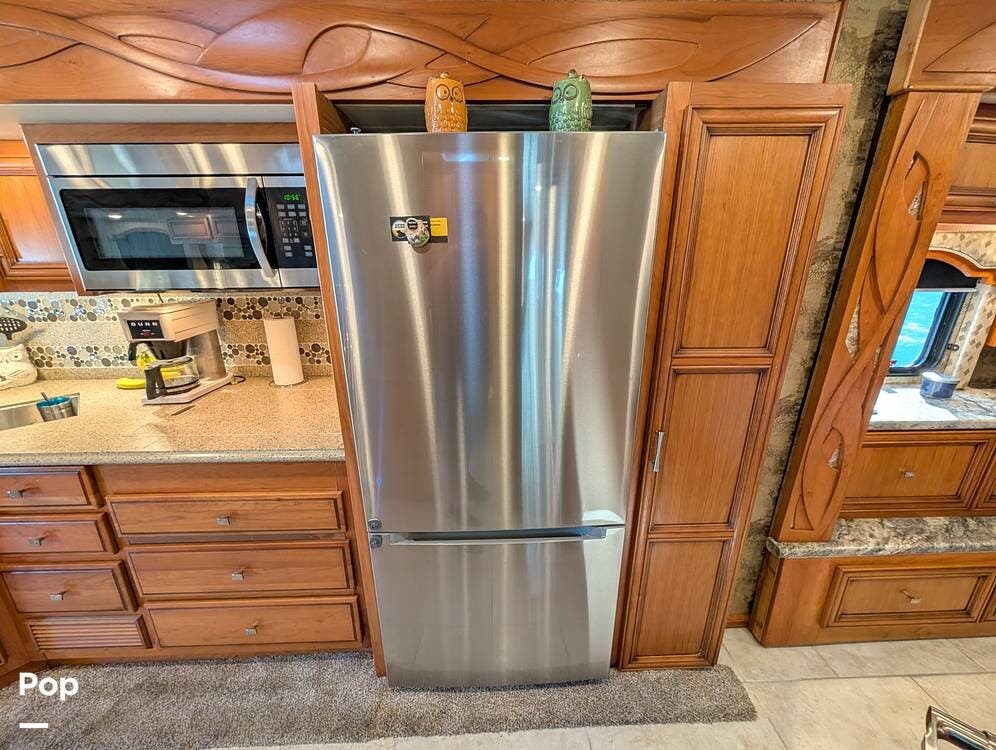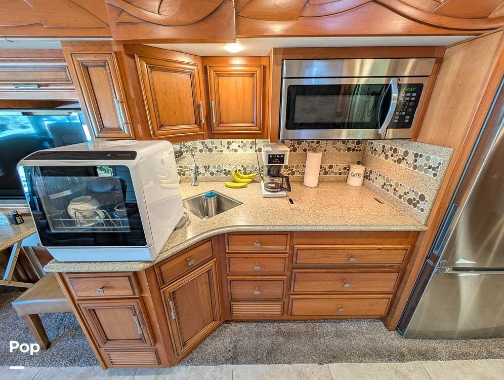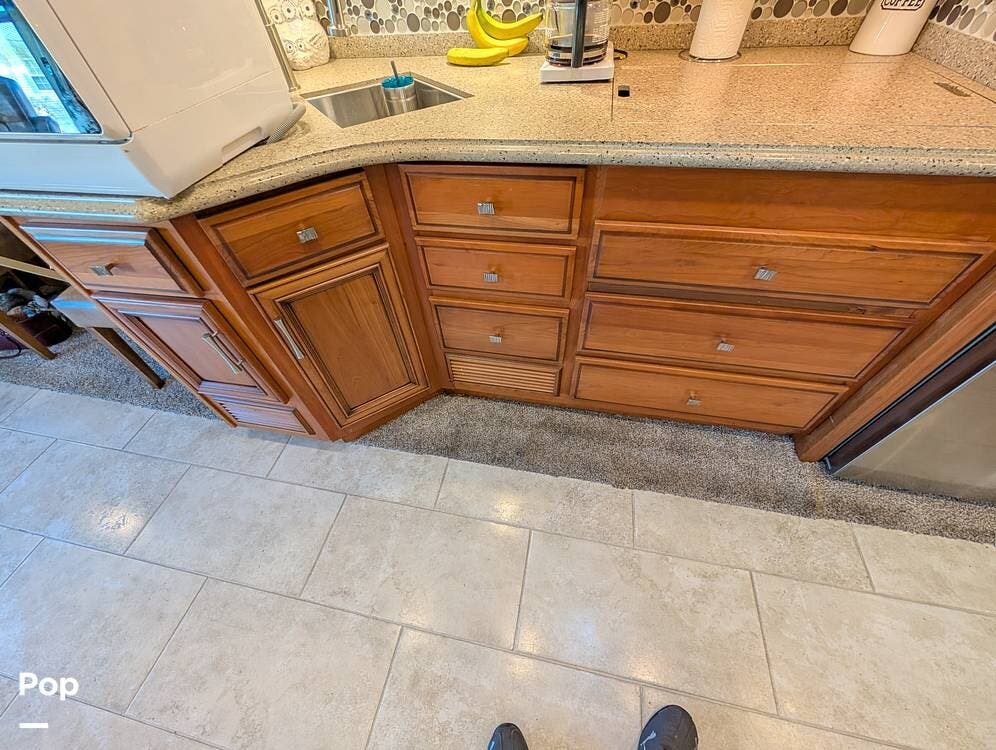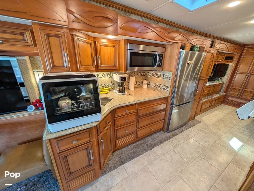 The kitchen is both stylish and functional, offering solid-surface countertops, abundant cabinetry, a residential-style refrigerator, convection microwave, and even a countertop dishwasher for added convenience on extended trips. Storage is plentiful, making it easy to stay organized whether you're traveling for weeks or living full-time in the coach.