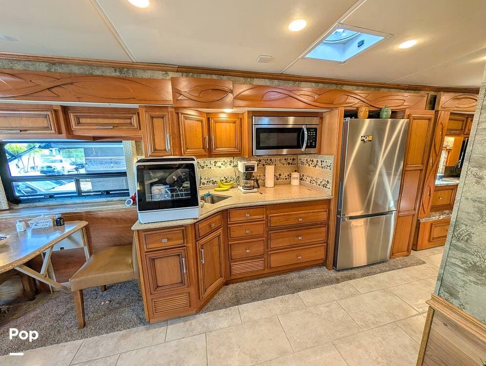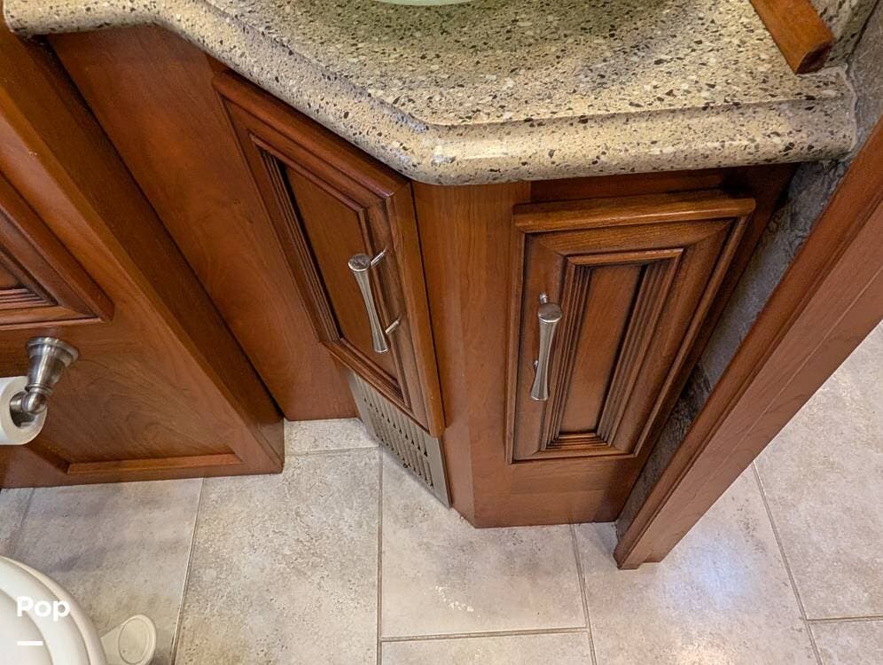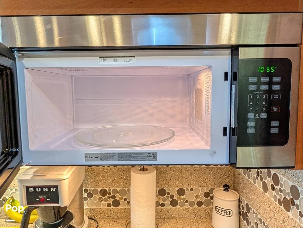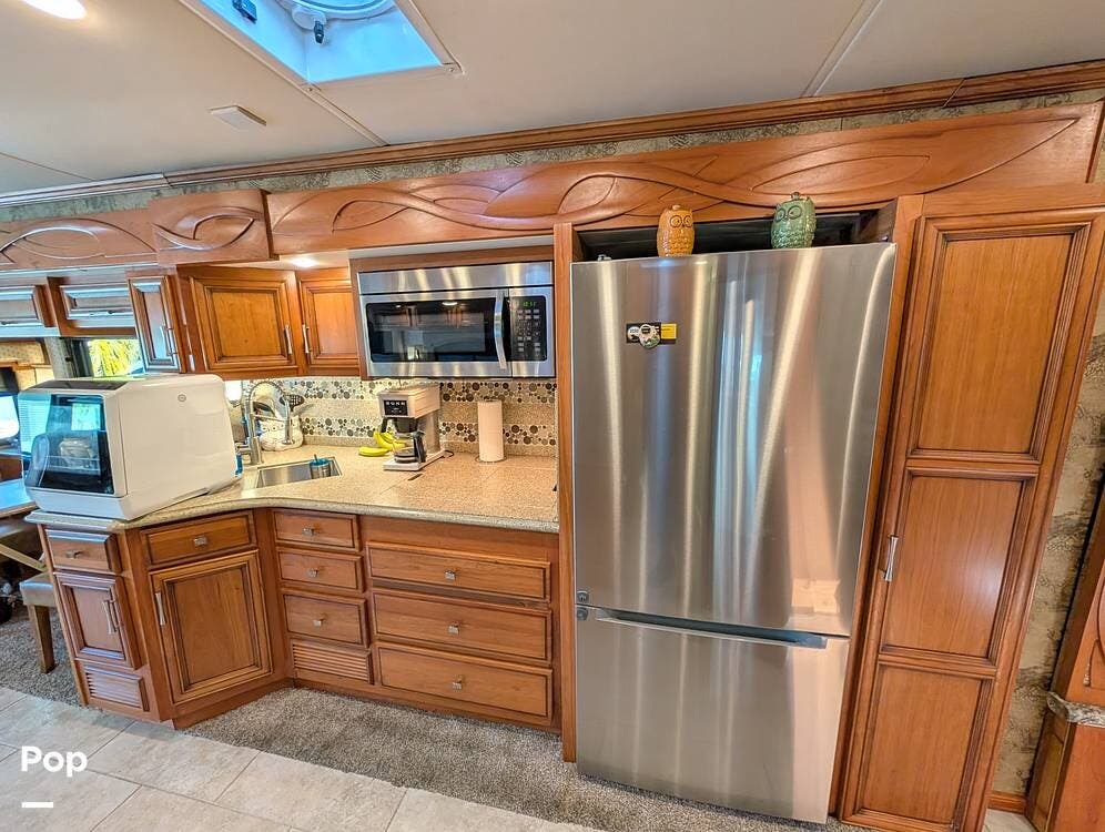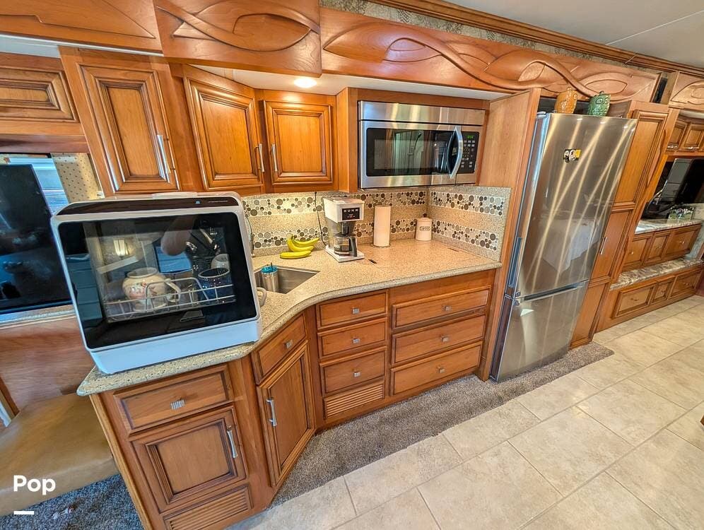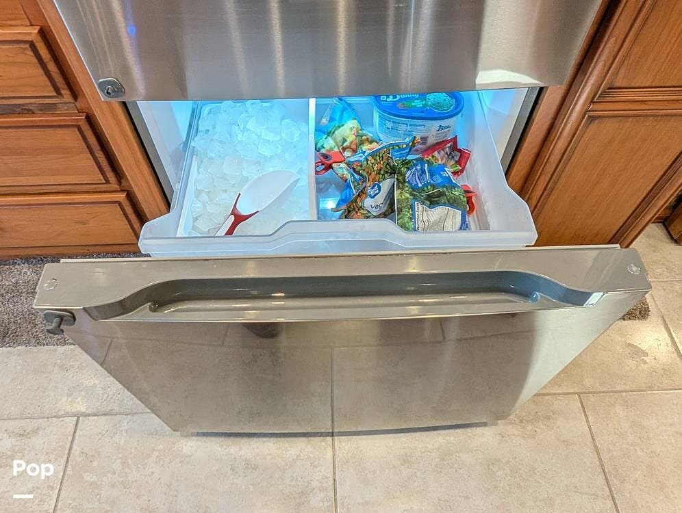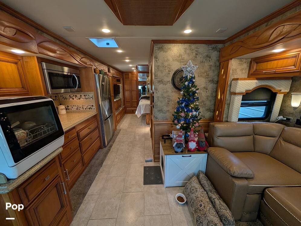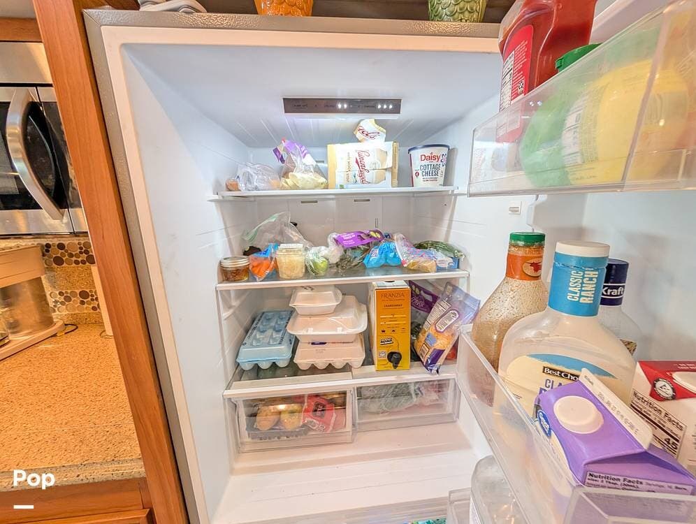 The kitchen is both stylish and functional, offering solid-surface countertops, abundant cabinetry, a residential-style refrigerator, convection microwave, and even a countertop dishwasher for added convenience on extended trips. Storage is plentiful, making it easy to stay organized whether you're traveling for weeks or living full-time in the coach.