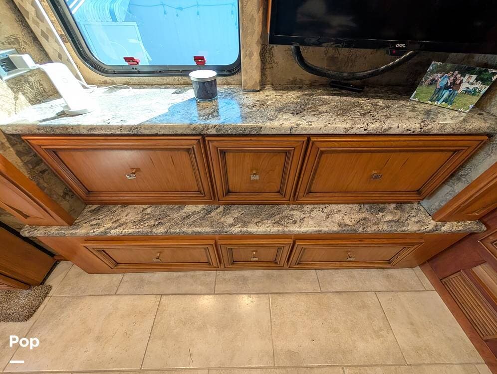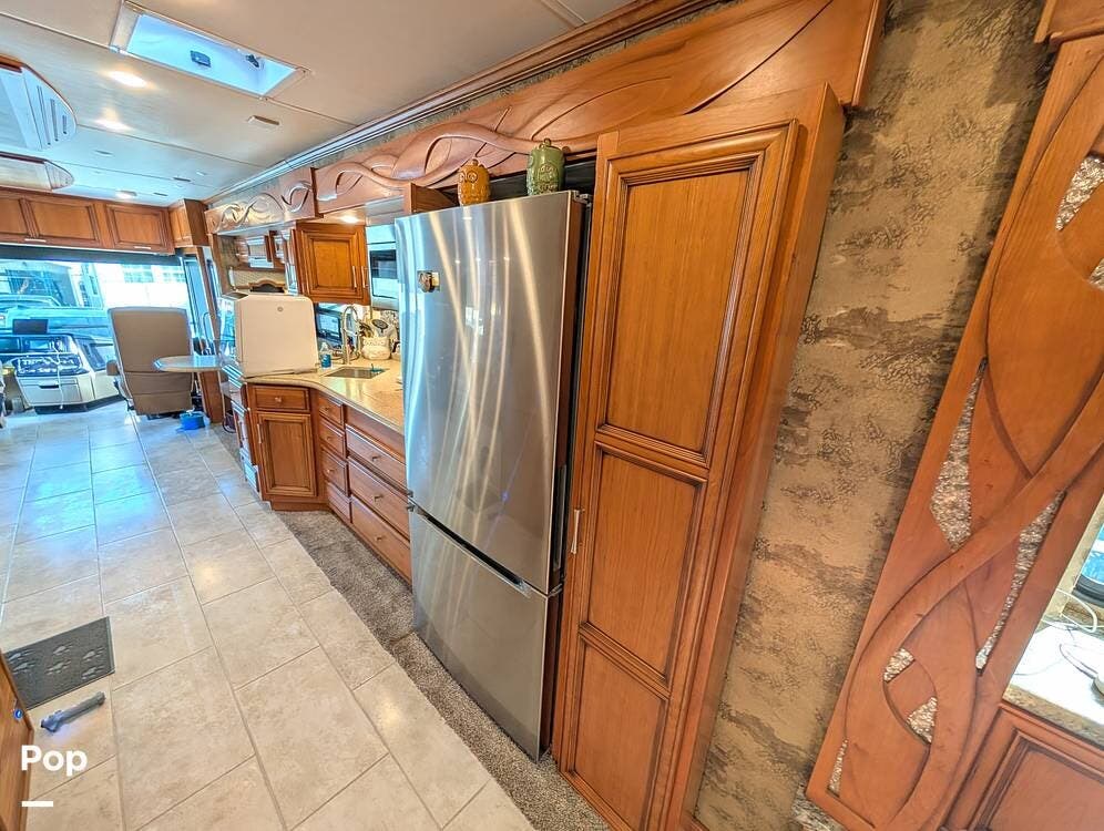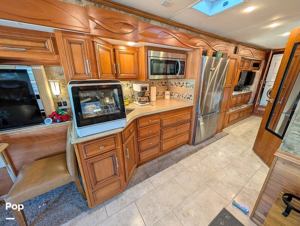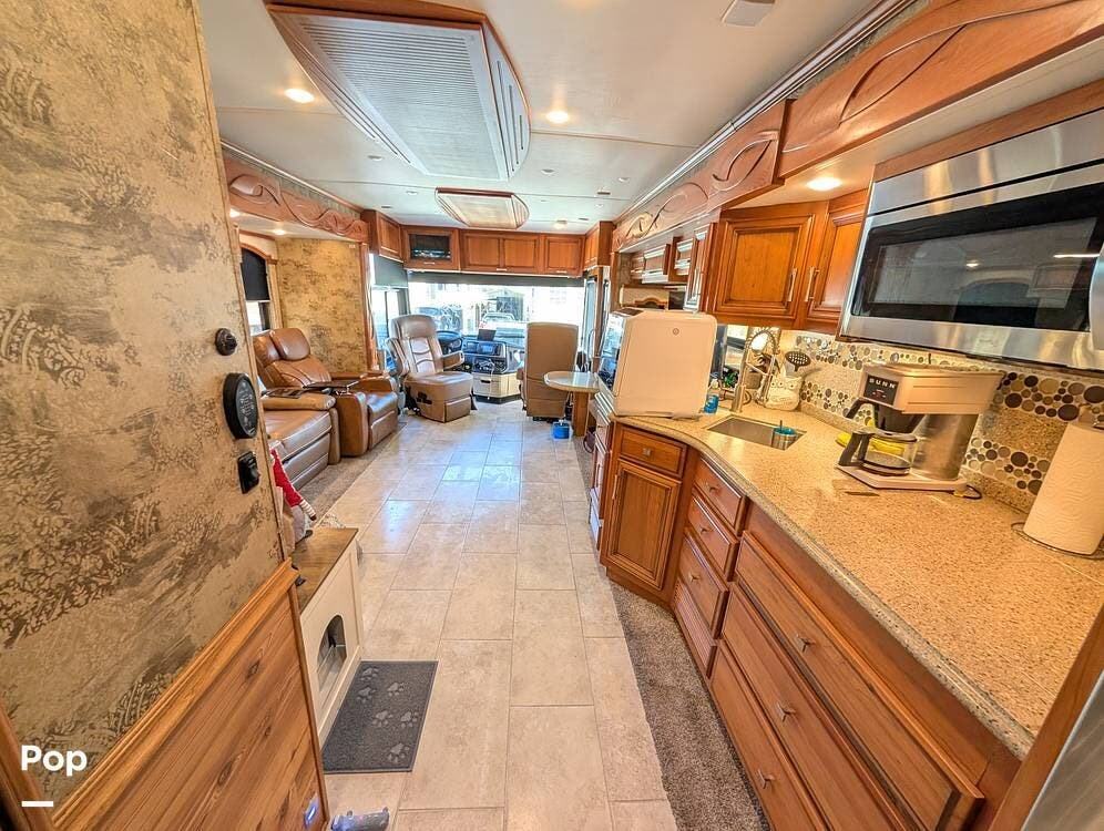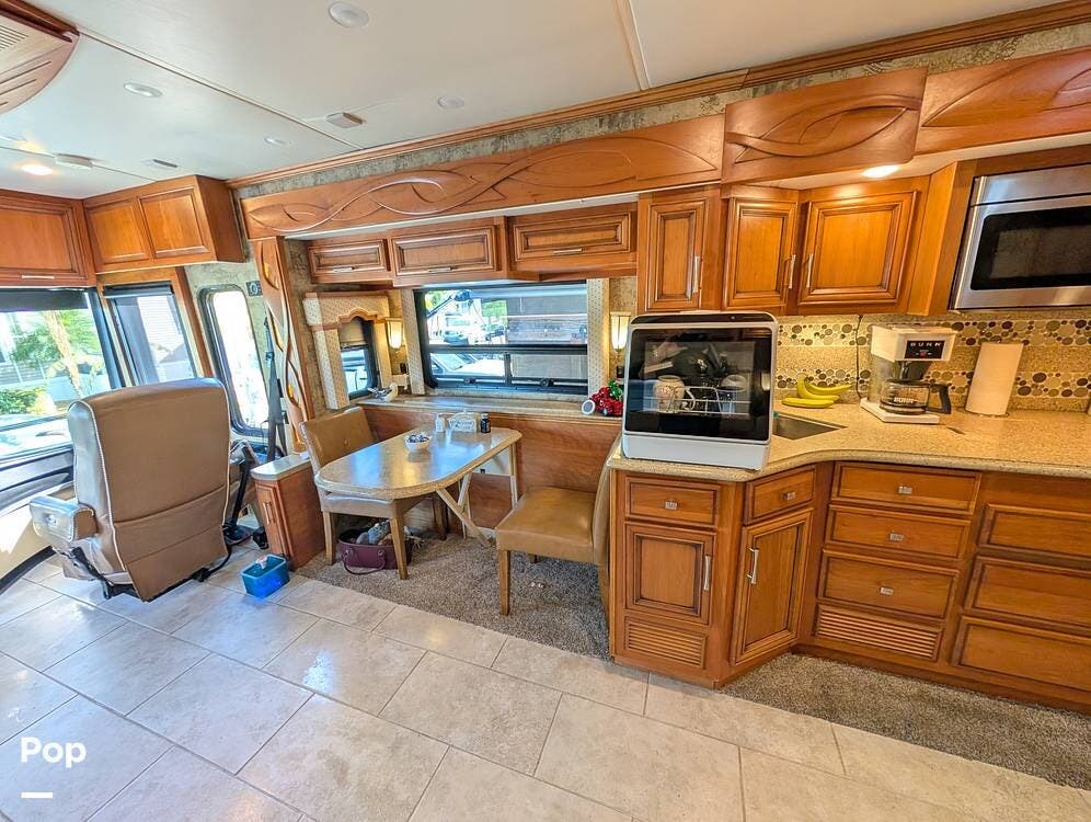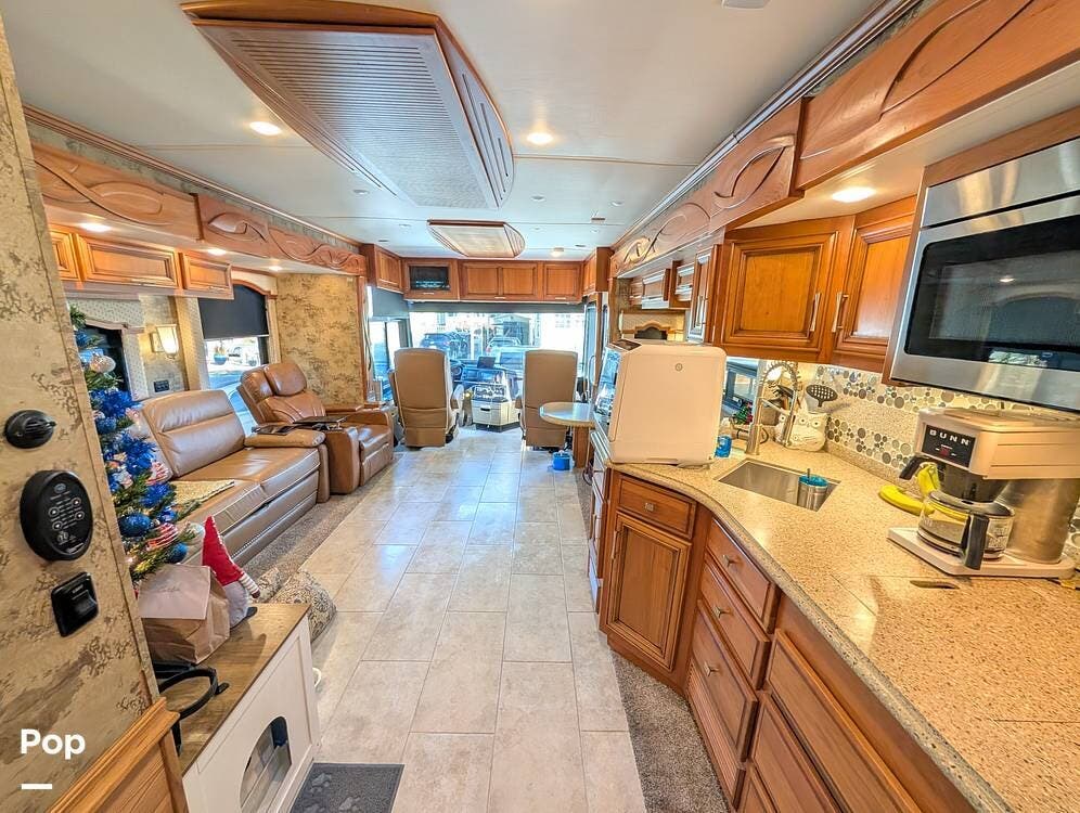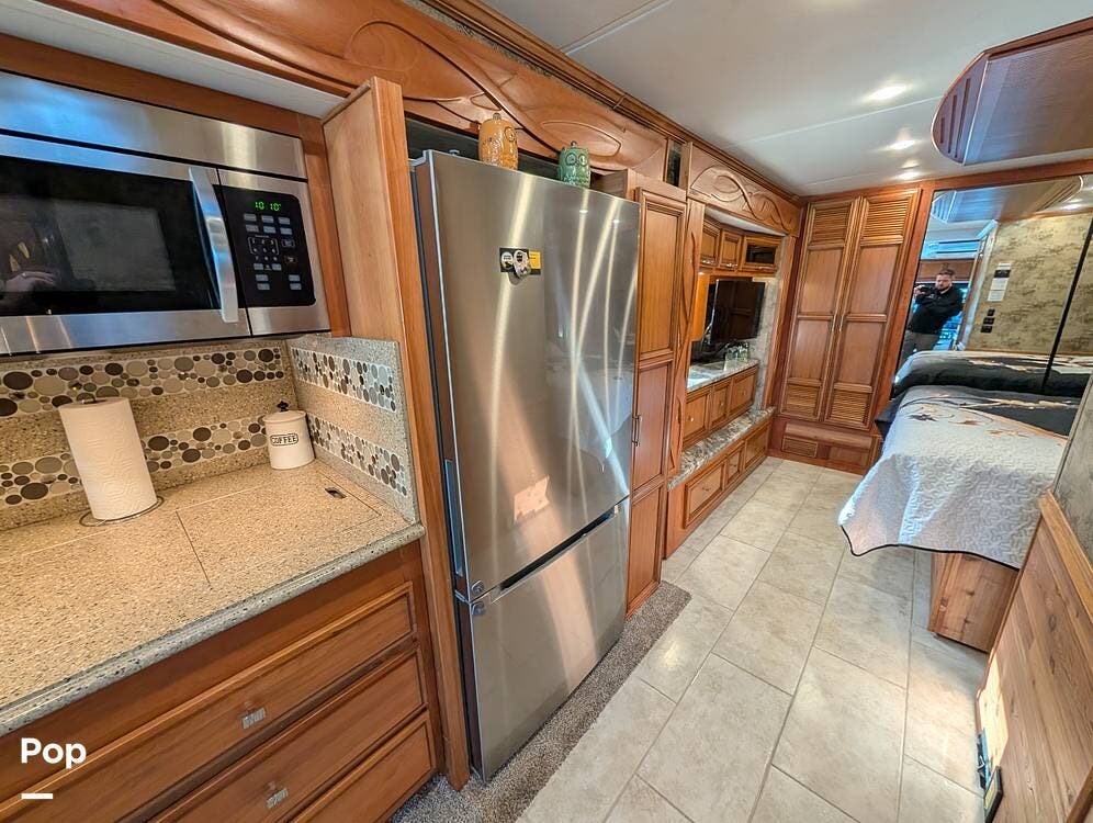 The kitchen is both stylish and functional, offering solid-surface countertops, abundant cabinetry, a residential-style refrigerator, convection microwave, and even a countertop dishwasher for added convenience on extended trips. Storage is plentiful, making it easy to stay organized whether you're traveling for weeks or living full-time in the coach.