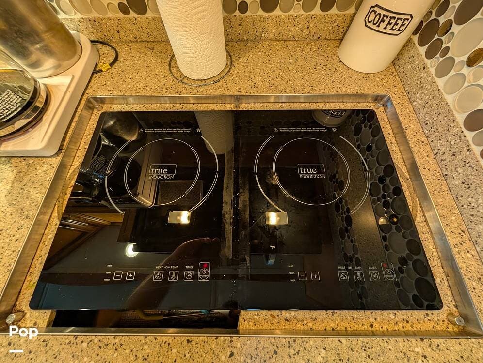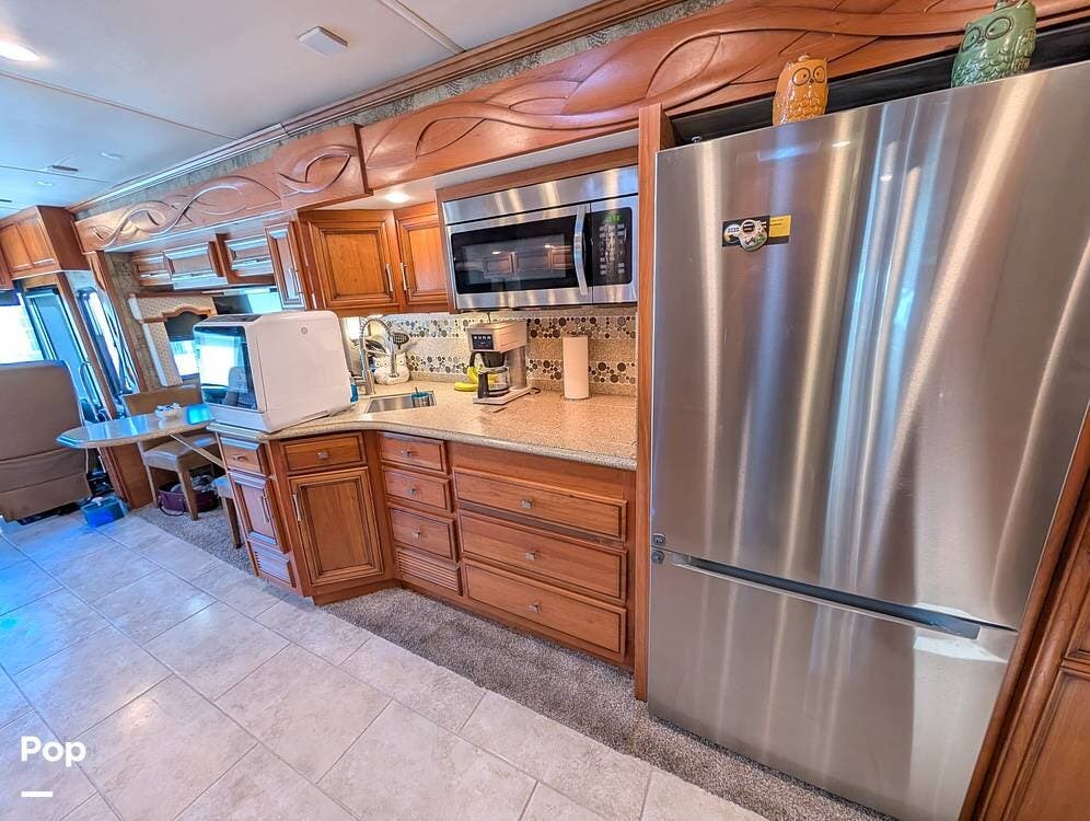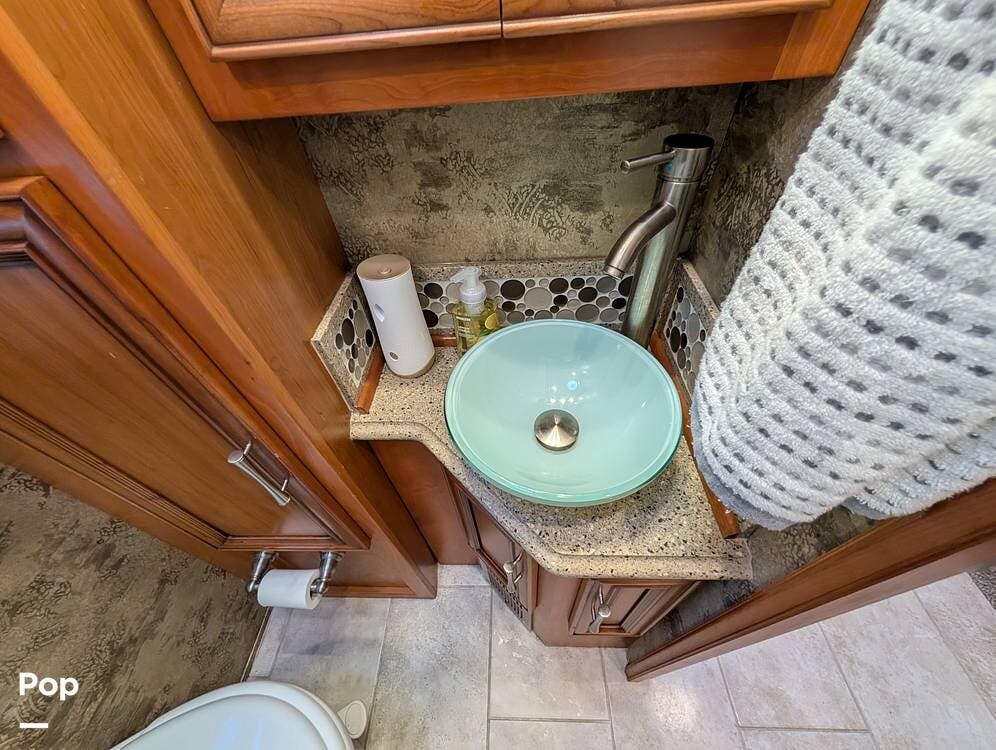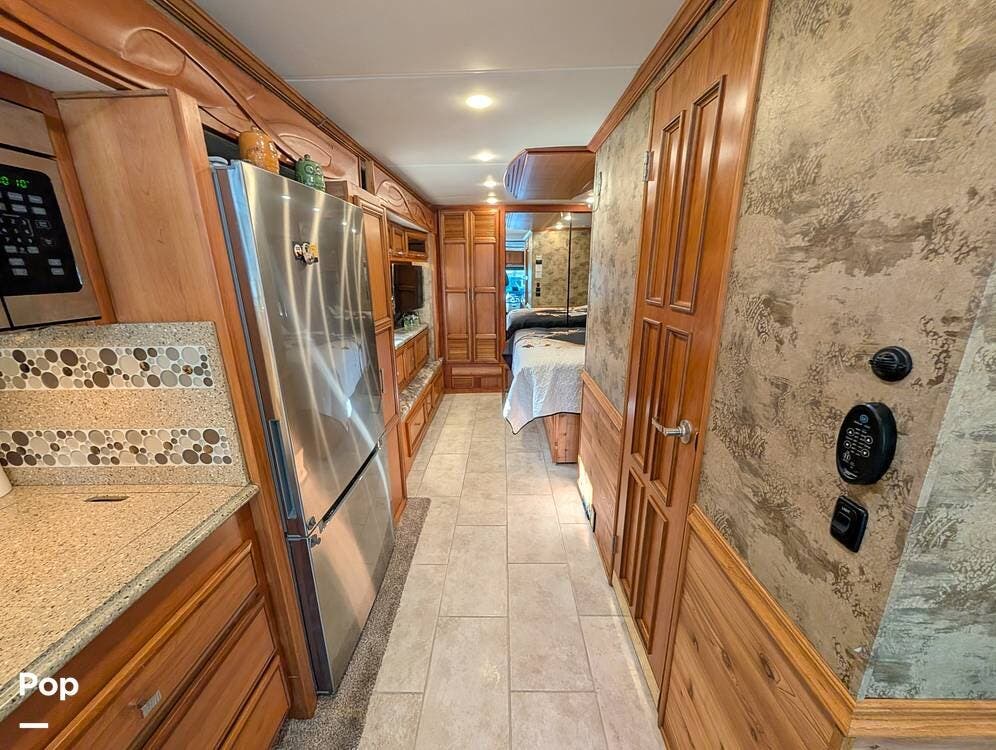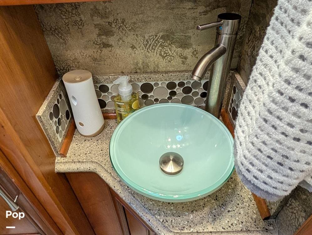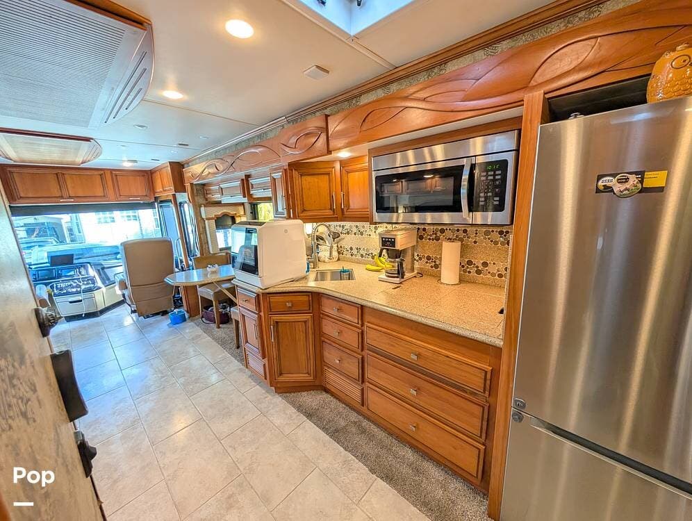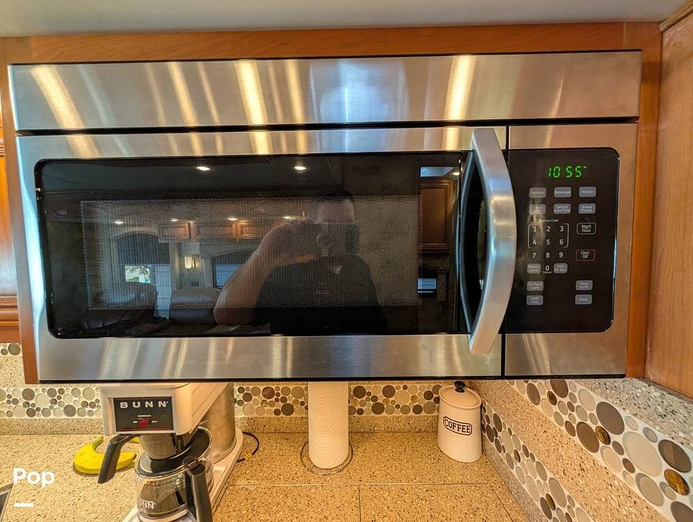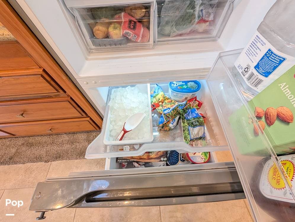 The kitchen is both stylish and functional, offering solid-surface countertops, abundant cabinetry, a residential-style refrigerator, convection microwave, and even a countertop dishwasher for added convenience on extended trips. Storage is plentiful, making it easy to stay organized whether you're traveling for weeks or living full-time in the coach.