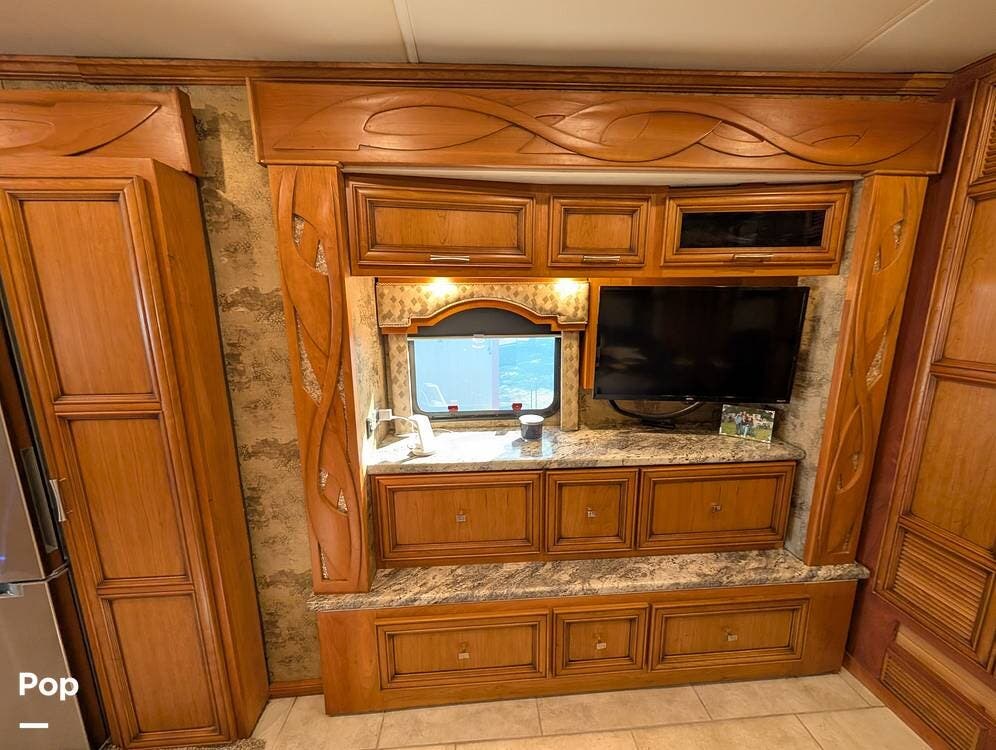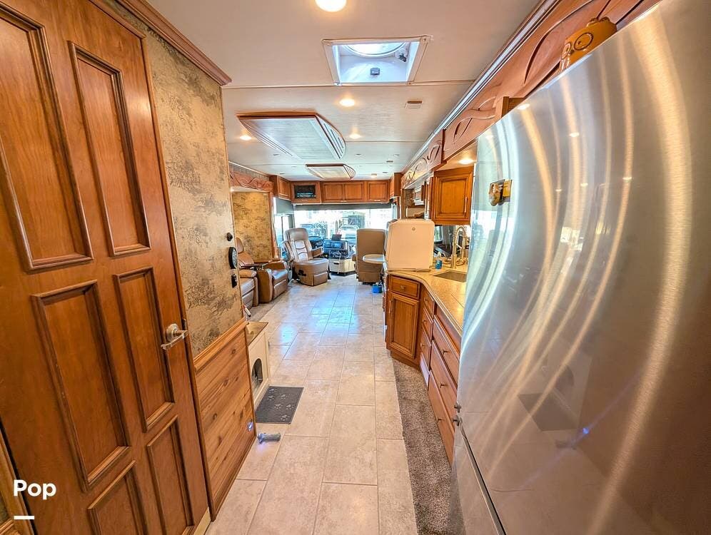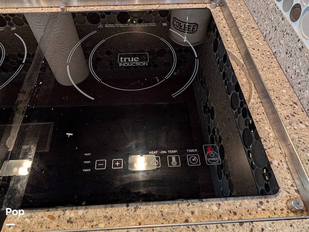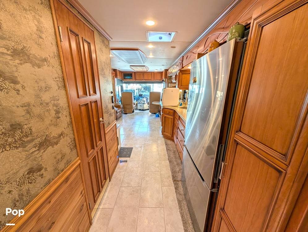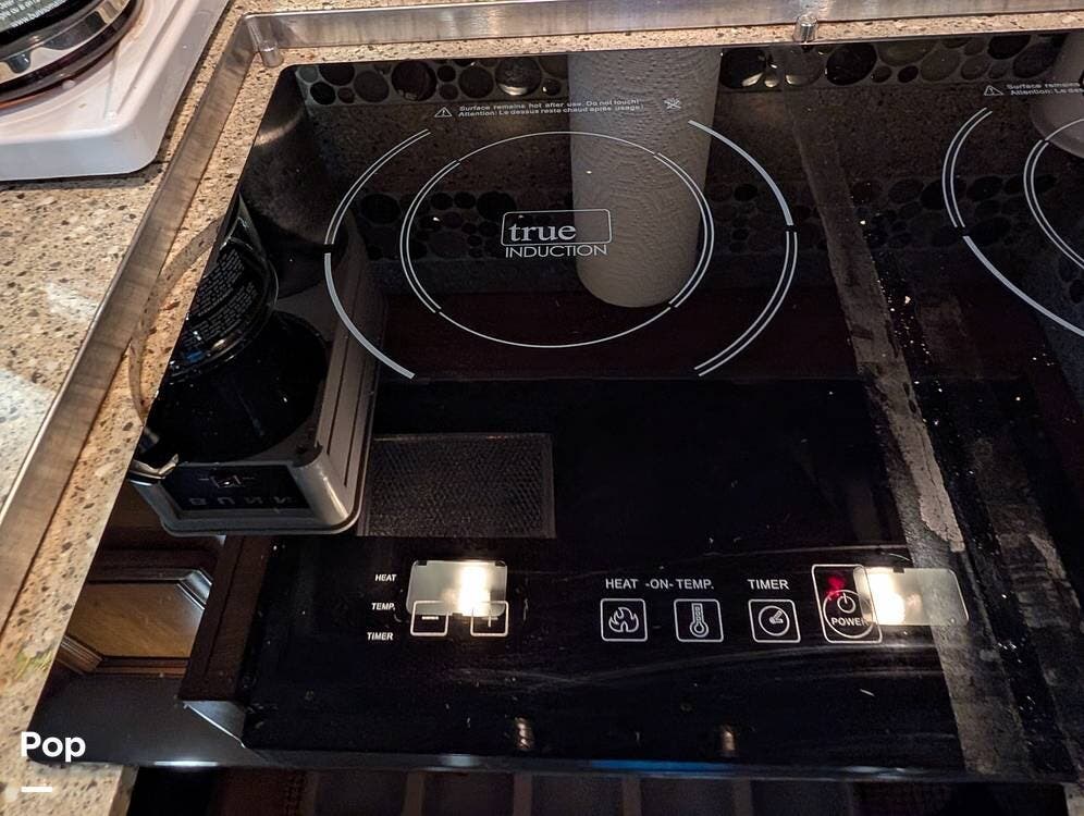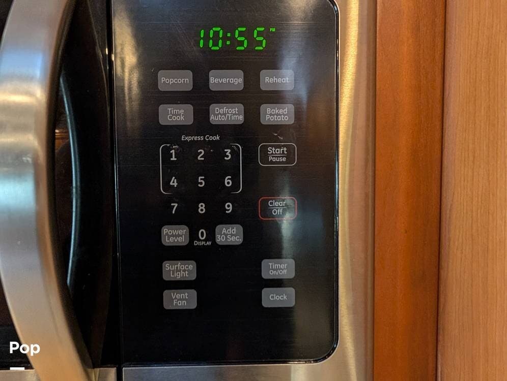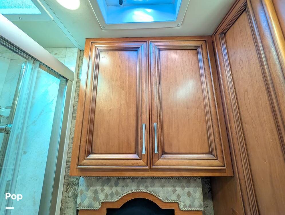 The kitchen is both stylish and functional, offering solid-surface countertops, abundant cabinetry, a residential-style refrigerator, convection microwave, and even a countertop dishwasher for added convenience on extended trips. Storage is plentiful, making it easy to stay organized whether you're traveling for weeks or living full-time in the coach.