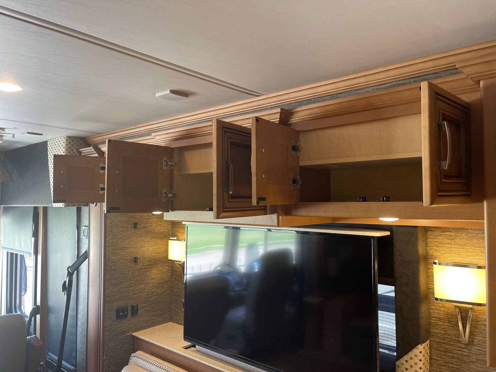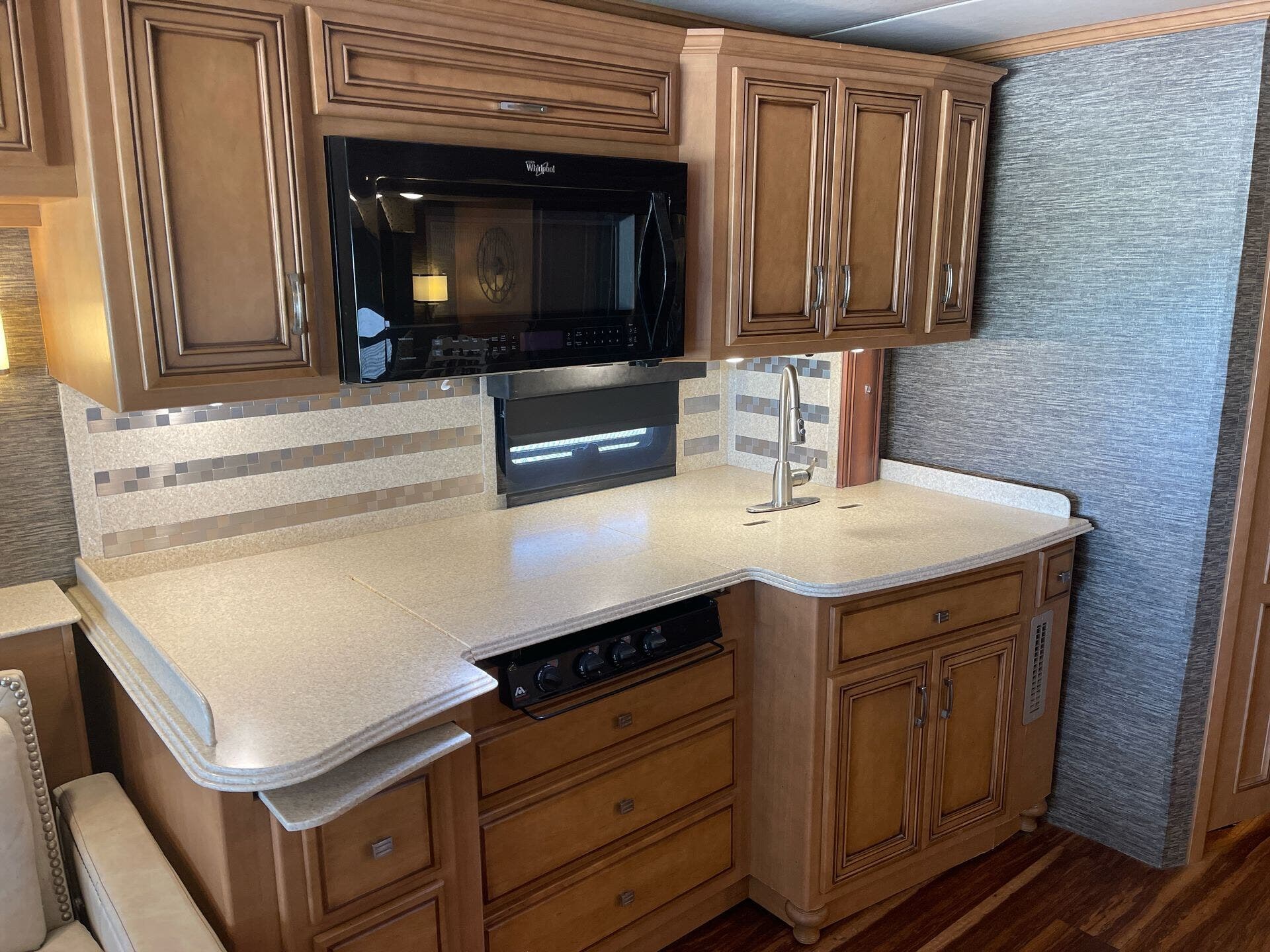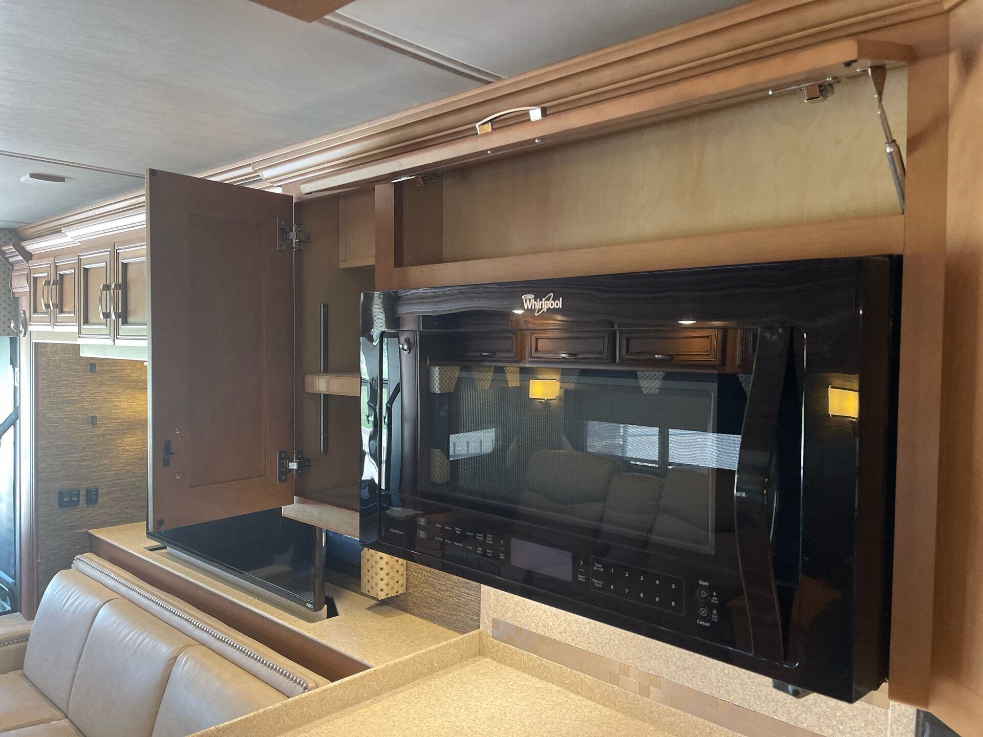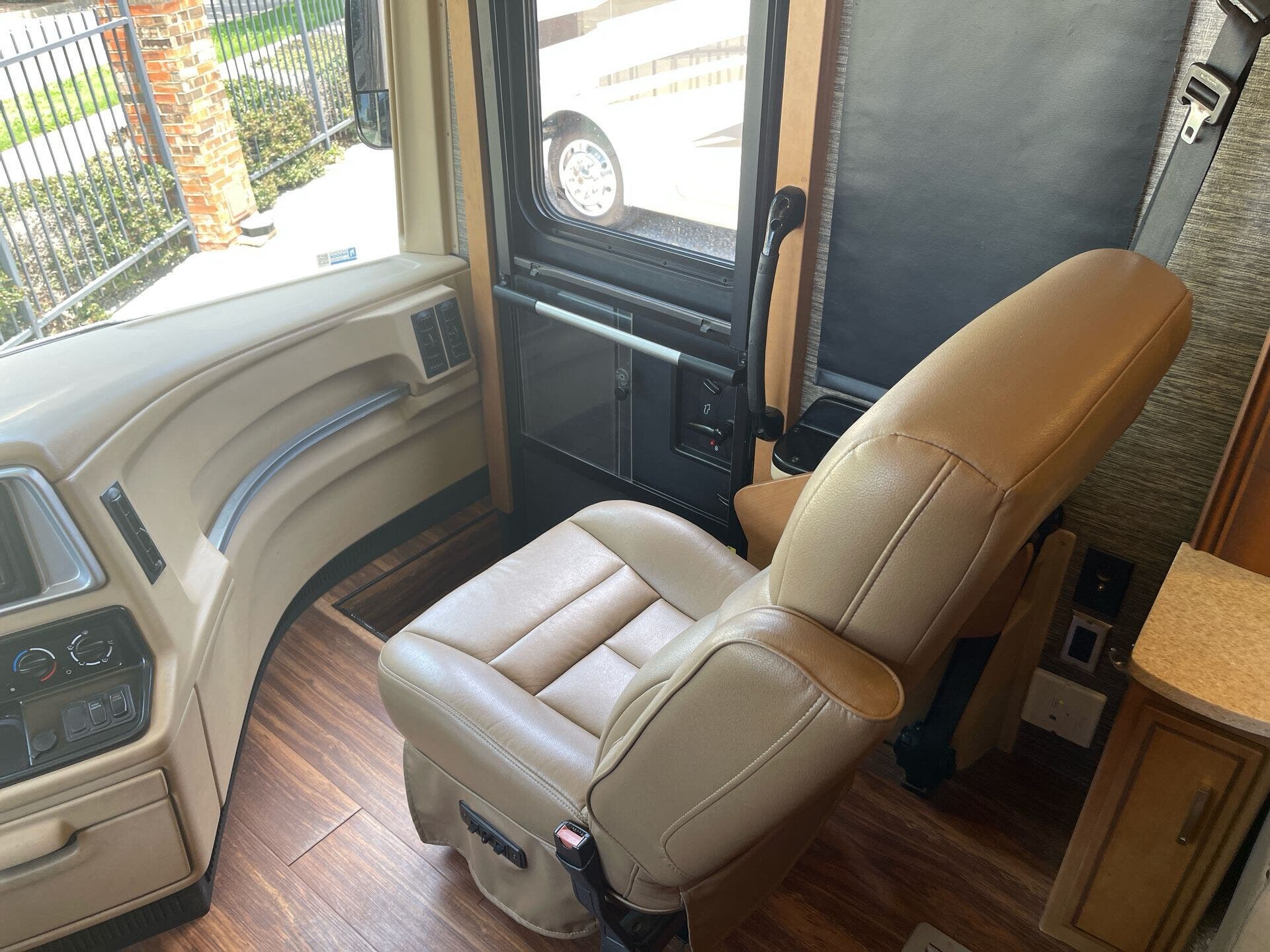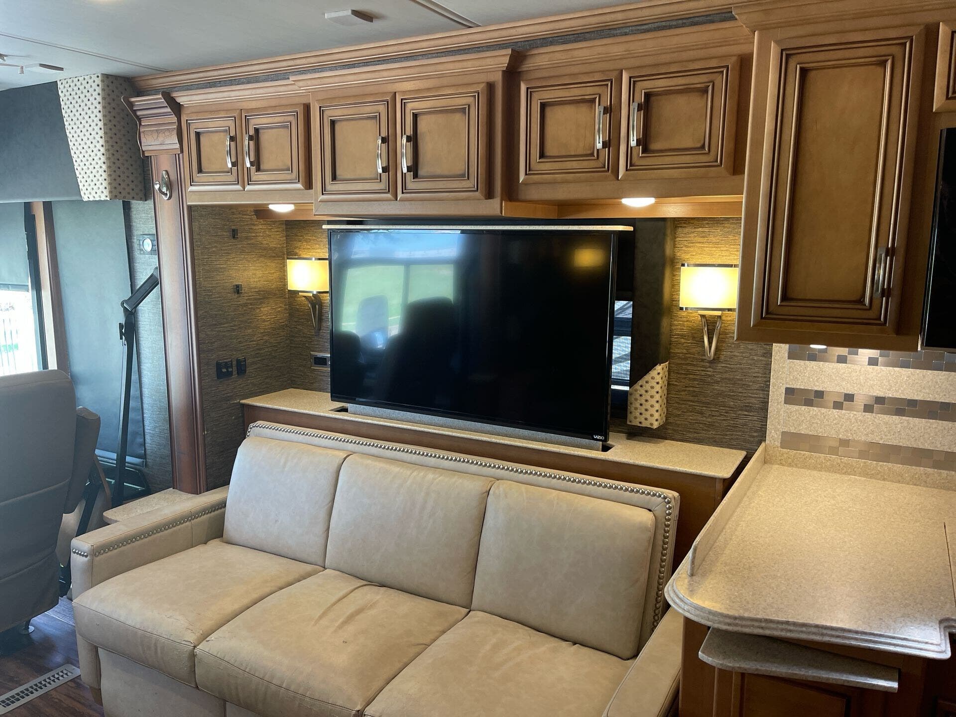 Inside, the well-appointed cockpit features swivel captain seats and a large dash with Nav-N-Go/Xite and Mobileye safety systems. The living area spans from plush leather sofas to a 50″ Samsung TV on a Televator, all accentuated with porcelain tile floors and upscale lighting. A convenient half-bath near the mid-section adds to family-friendly convenience.