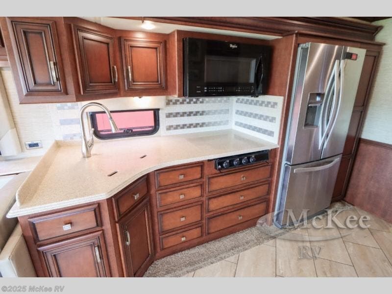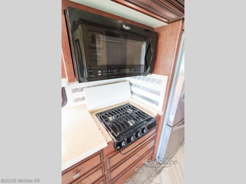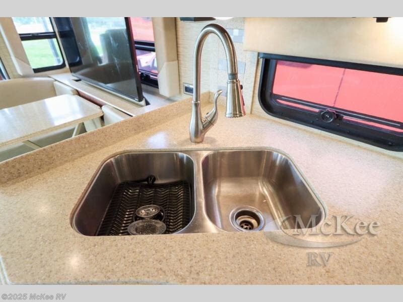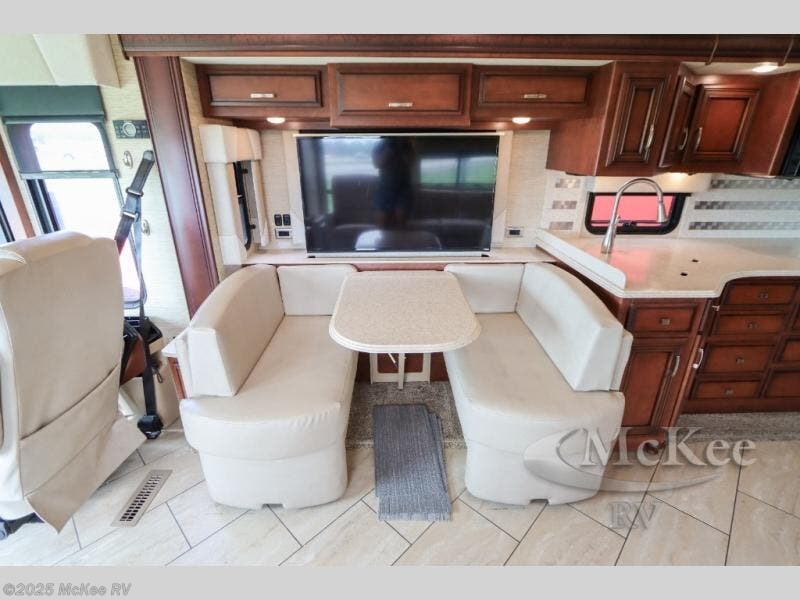 Enter through the passenger door and immediately notice how open and spacious the front living area is with the dual opposing slide outs. Behind the passenger seat, the slide out features a booth dinette with a LED TV on a power lift, a double kitchen sink, a three burner range, plus a refrigerator and pantry.