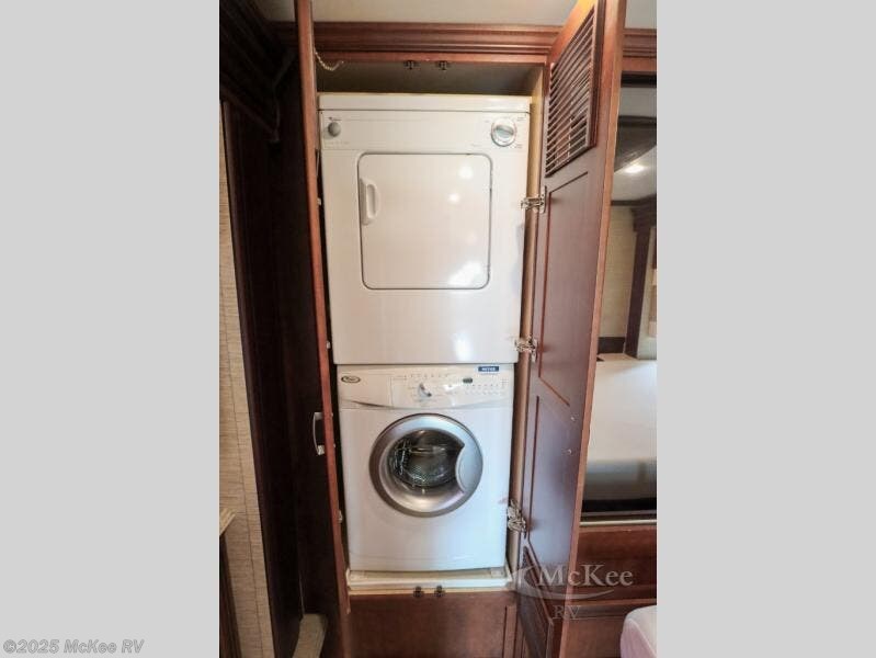 A sliding door gives a bit more privacy in the rear bedroom. Here you will find opposing slide outs along either side of the room. The slide to your left features a dresser, overhead cabinet, and a TV. On the opposite side of the room you will find that the queen bed and overhead cabinet are on a slide out. Also on either side of the bed there are nightstands. Along the rear wall you can hang up your clothes in the wardrobe, and in the corner of the room you have the option to add a washer/dryer, so now you won't have to go home with dirty clothes.
