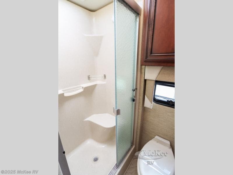 The side aisle bathroom has a 38"x30" shower, toilet with overhead cabinet, linen cabinet for your towels or toiletries, and a sink.