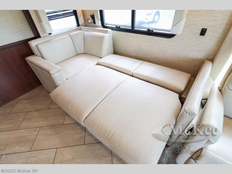 On the opposite side of this model you will find the slide out features a recliner and an 84" L jack-knife sofa with an overhead cabinet.